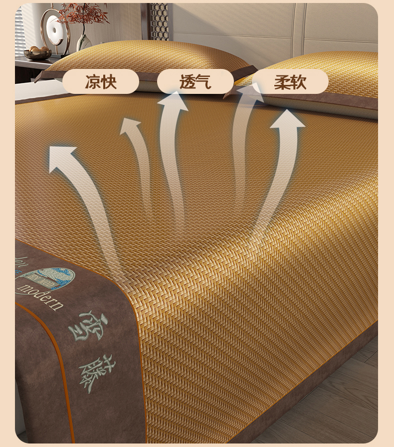 (总)宜派家纺 2026年新款新中式绣花天然蔺草席凉席冰丝席三件套竹席席藤席草席凉感席空调席PE席学生宿舍,新中式天然蔺草席