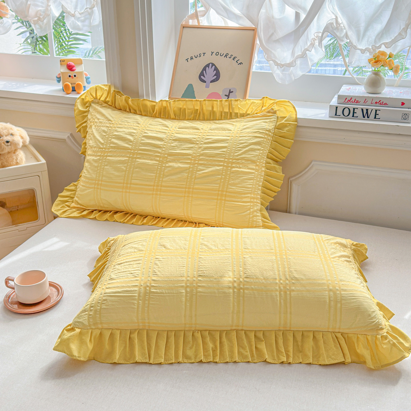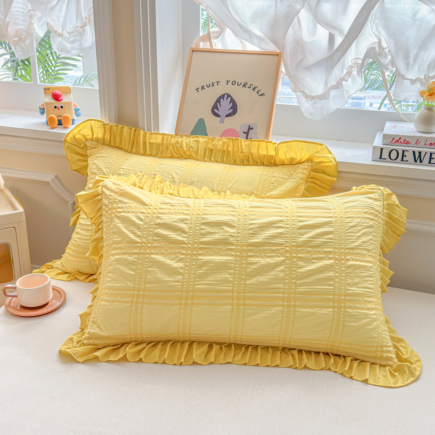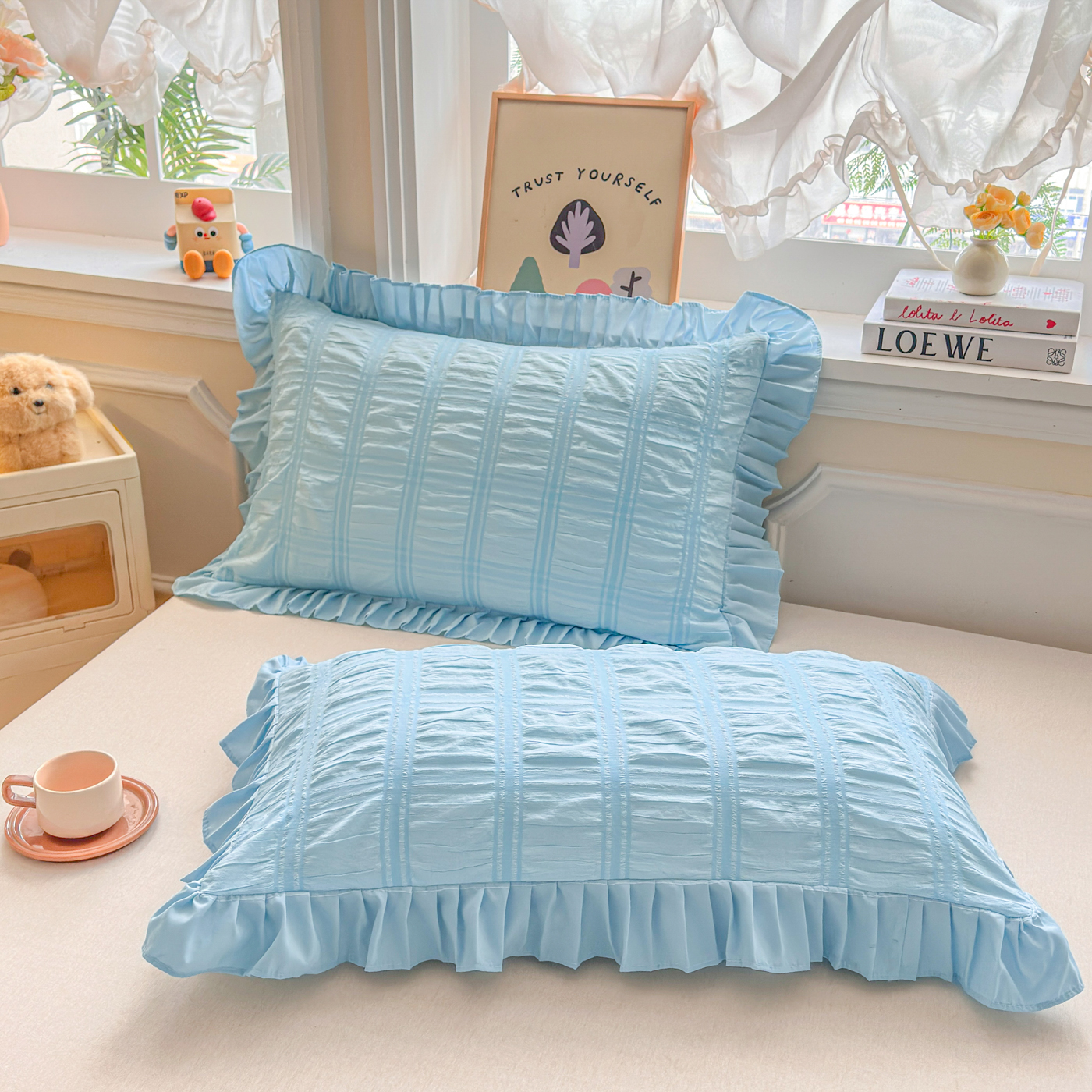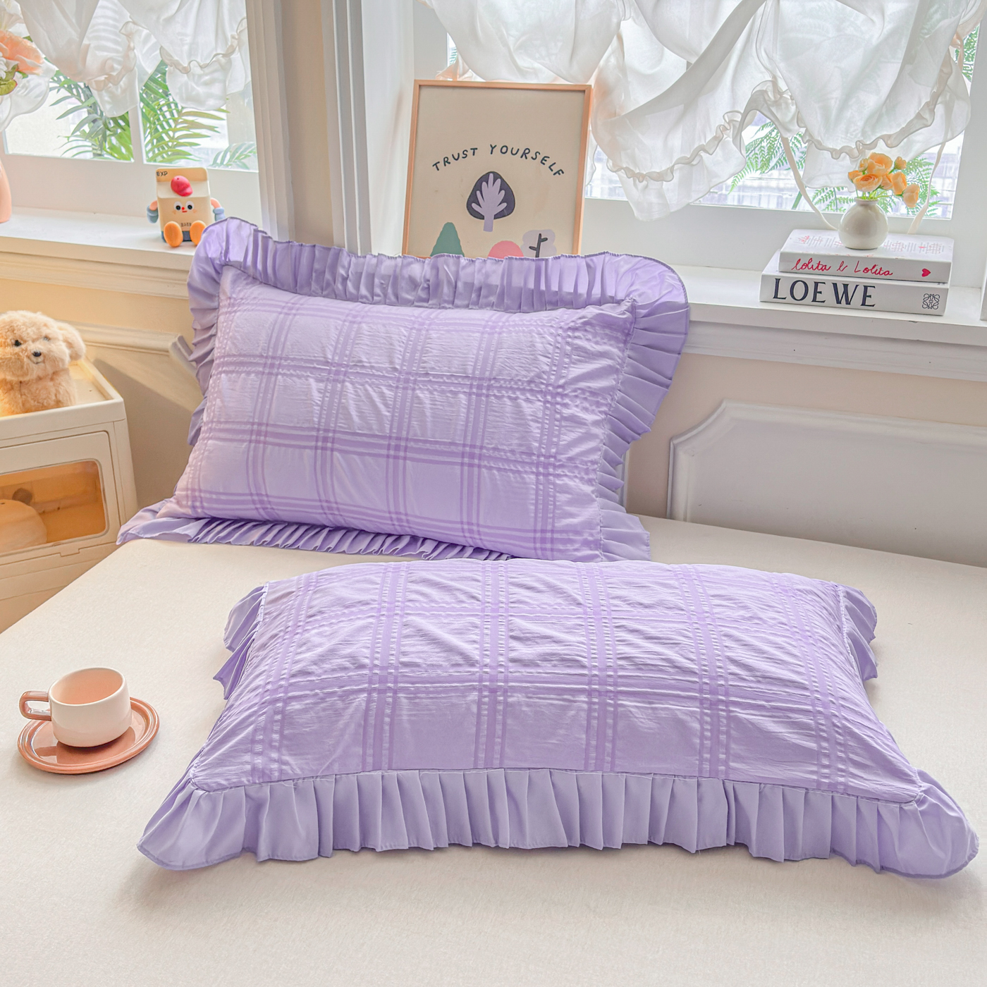 (总)衿成家纺 2026新款公主风小清新泡泡纱花边枕套,白色,黄色,蓝色,紫色
