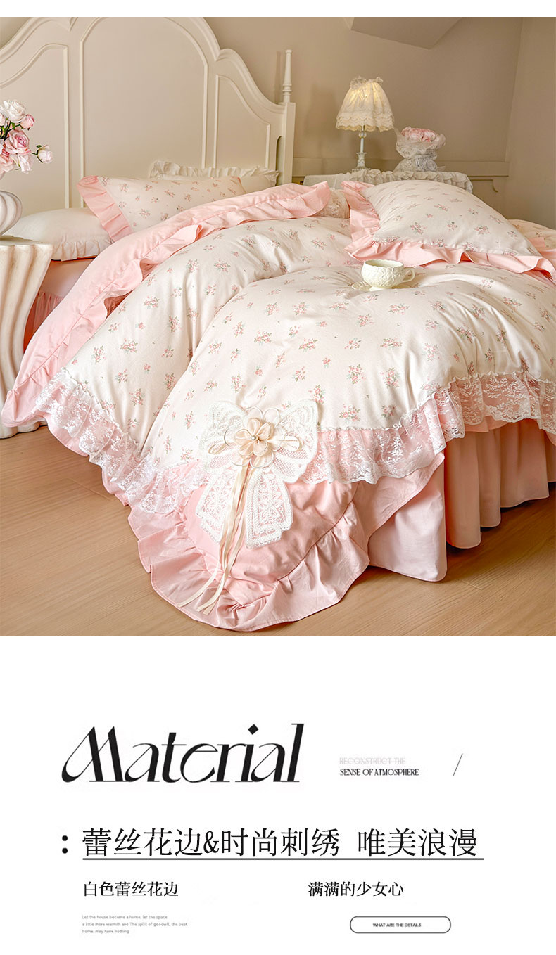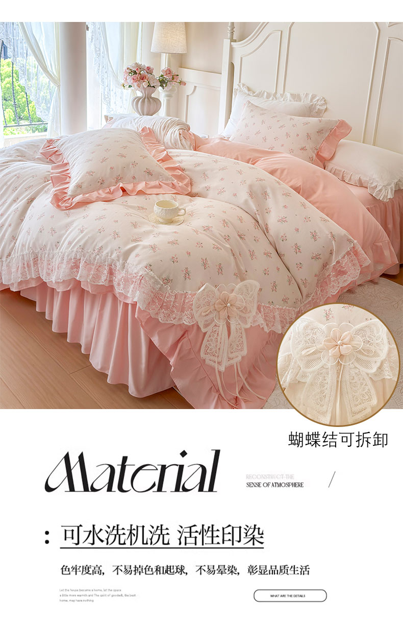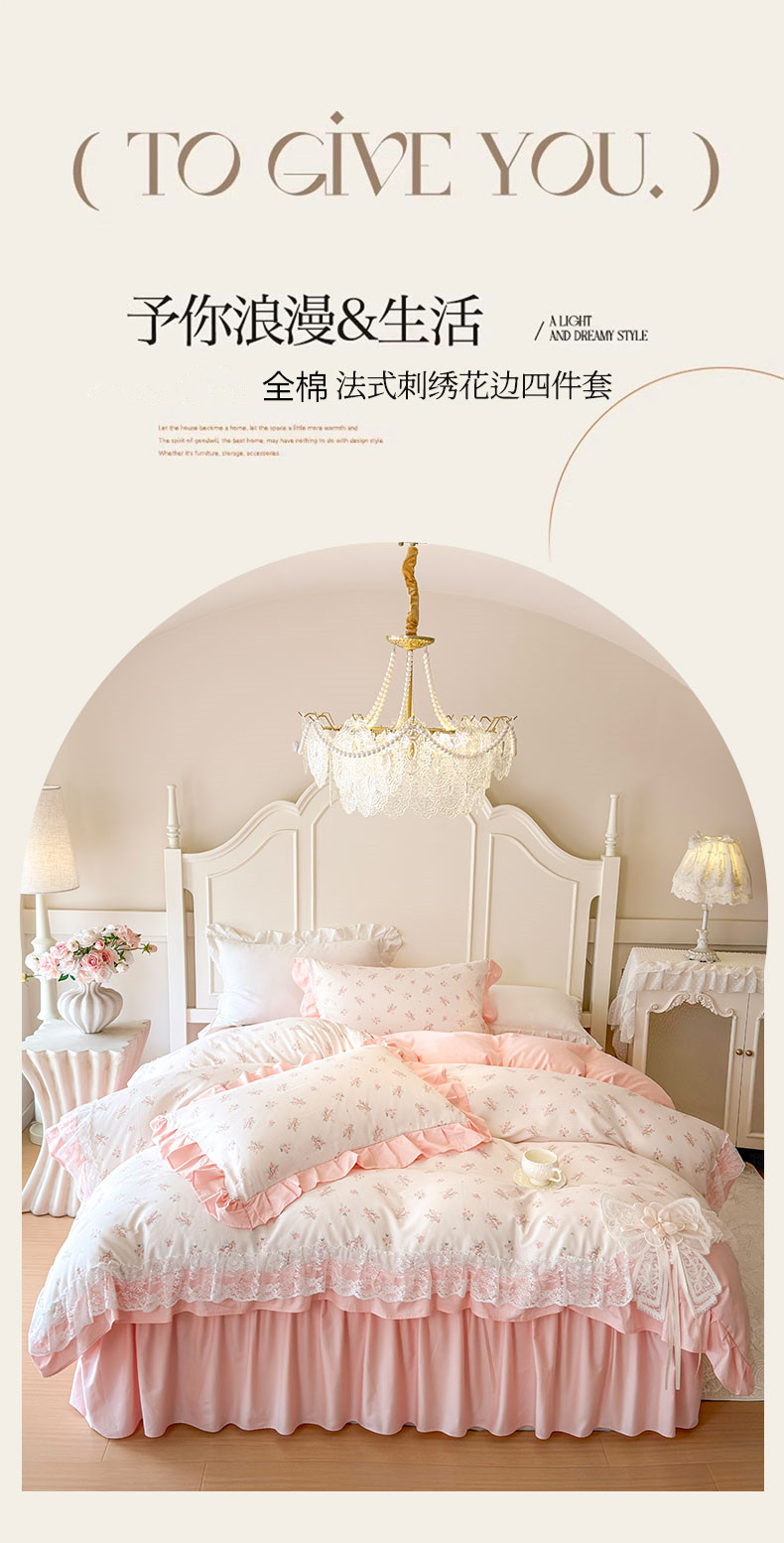 当前位置: 91家纺网 > 商品网购 > 床品套件 > 四件套 > 全棉普通四件套 > 花香四季家纺 2026新款法式全棉纯棉印花床裙款四件套-法式甜心 法式甜心-粉