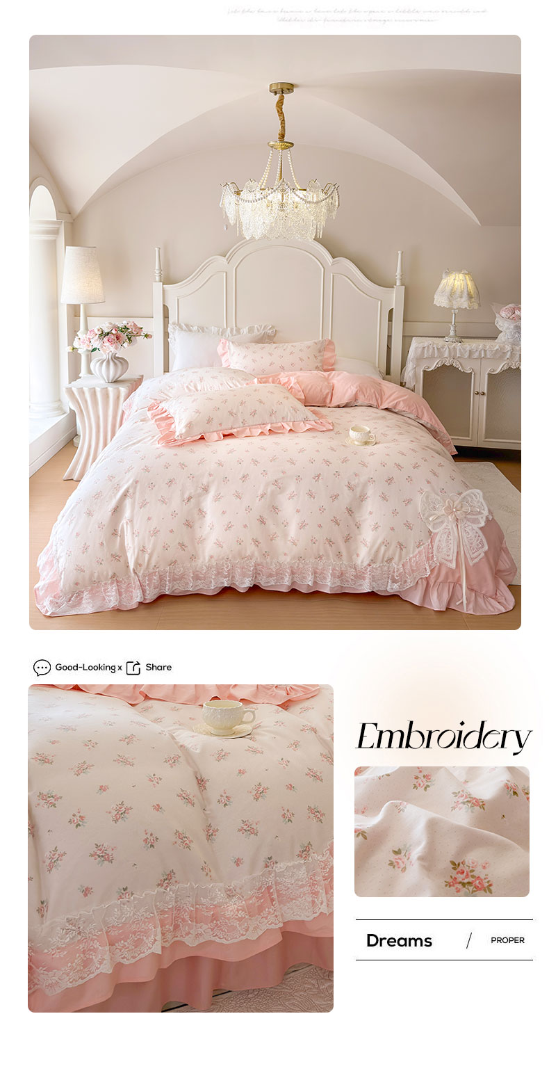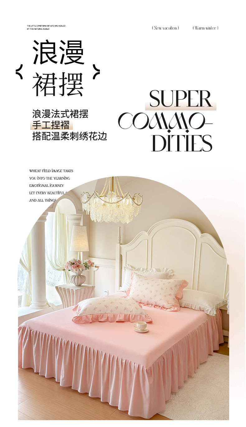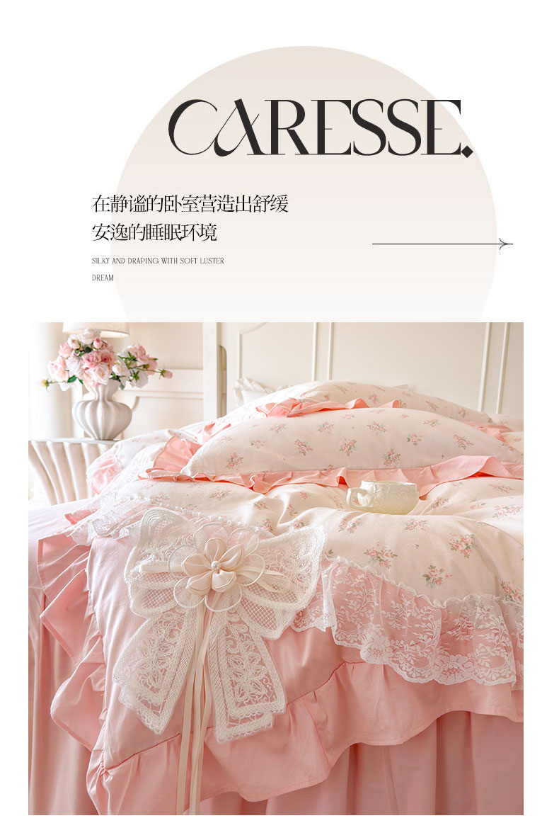 当前位置: 91家纺网 > 商品网购 > 床品套件 > 四件套 > 全棉普通四件套 > 花香四季家纺 2026新款法式全棉纯棉印花床裙款四件套-法式甜心 法式甜心-粉