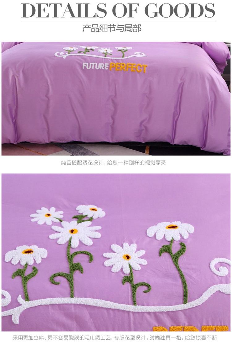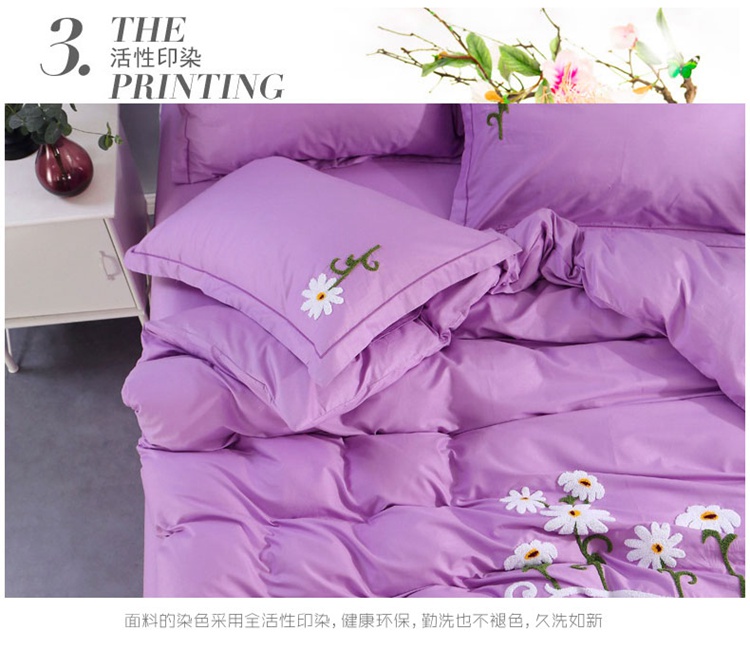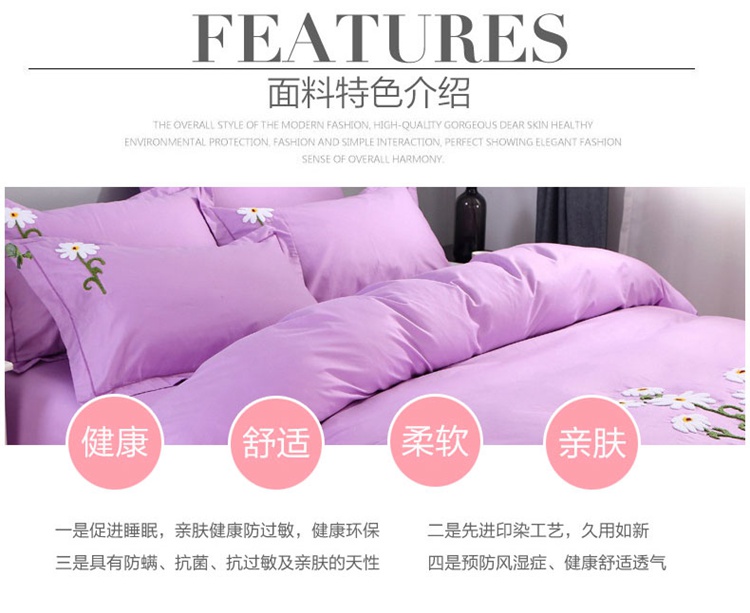 全棉133*72纯色绣花四件套,采用新疆精梳棉,60支纱,密度133*72。专版绣花花型设计,高精度、高密度立体毛巾绣工艺,相比普通绣花更加牢固不易脱线,美观又耐用。