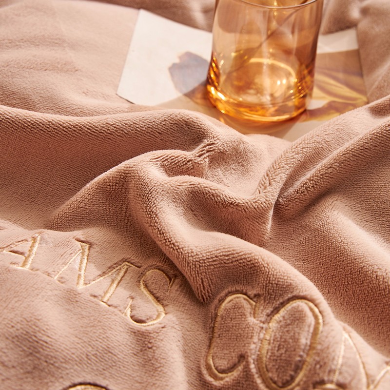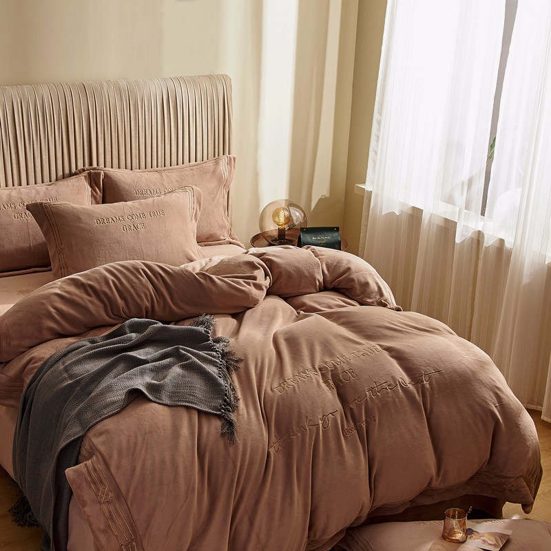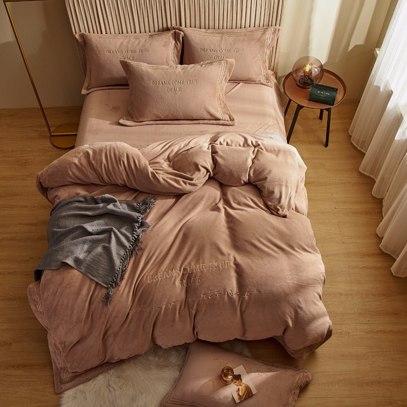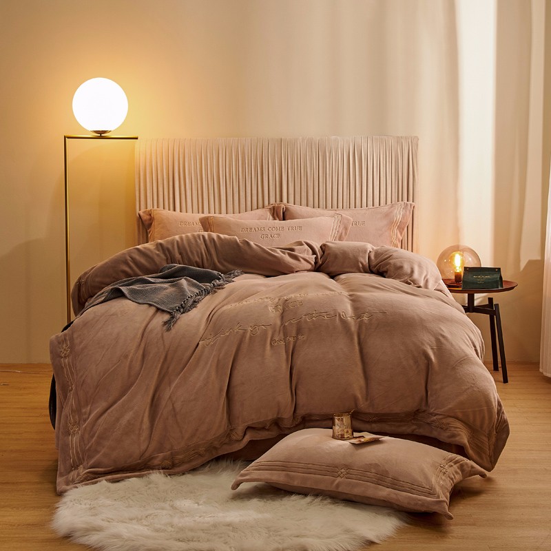 米奈 2020新款水晶绒法莱绒牛奶绒绣边罗伊系列四件套 高级咖