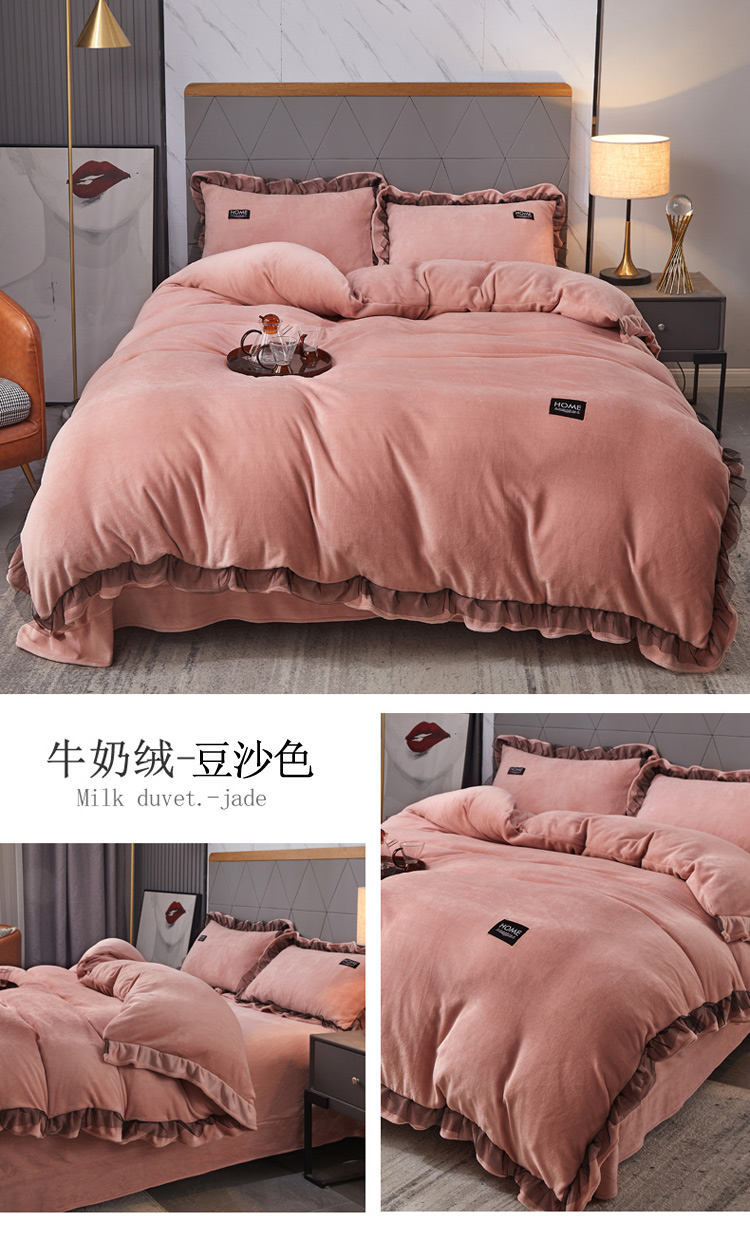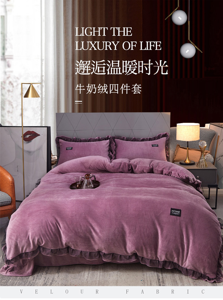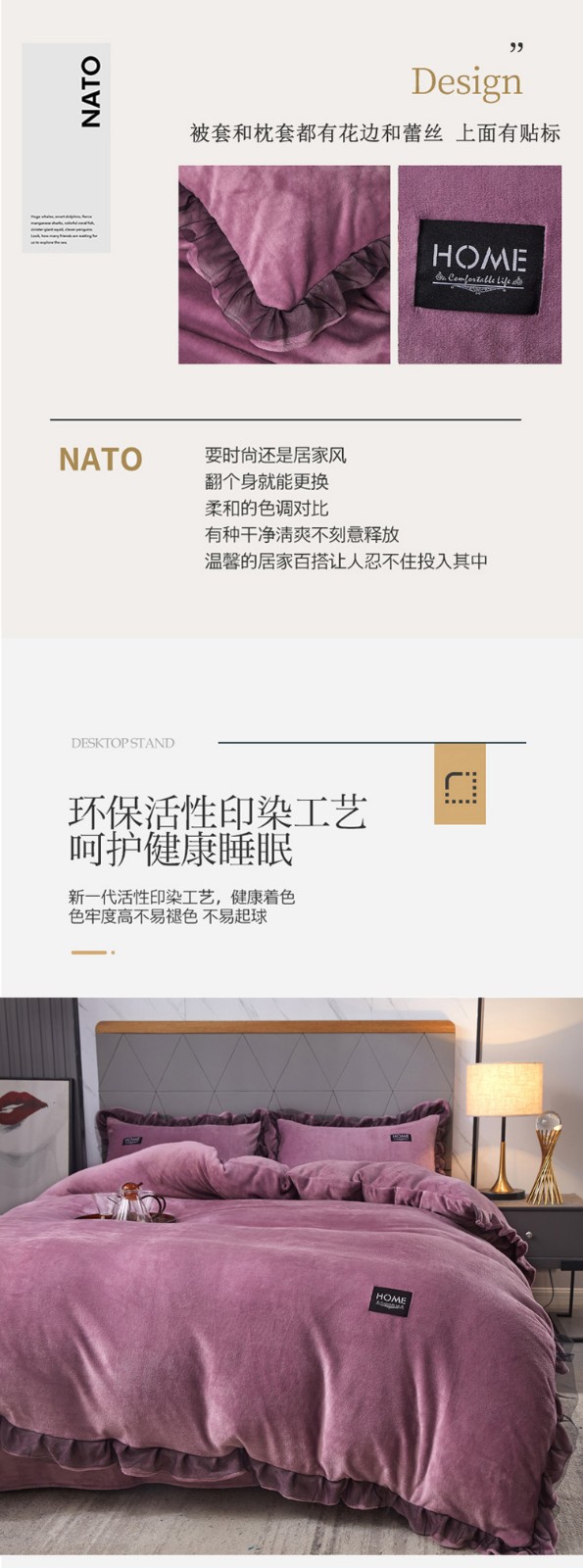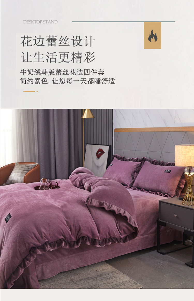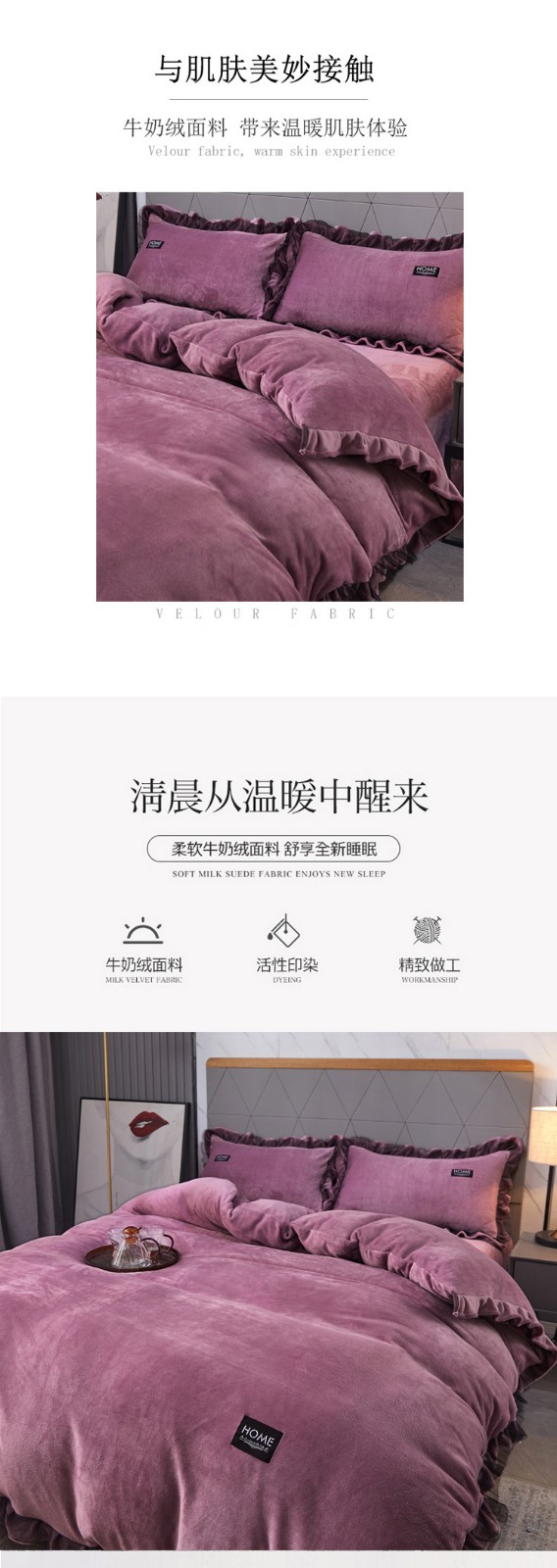 2023牛奶绒保暖四件套韩版蕾丝花边,紫色,松花绿,灰色,豆沙,宾利蓝
