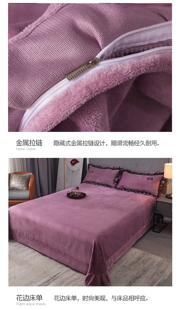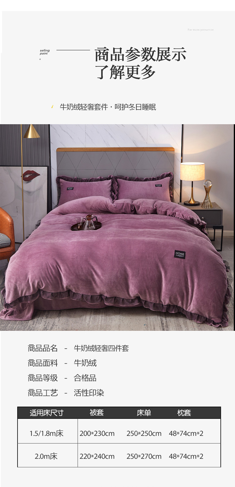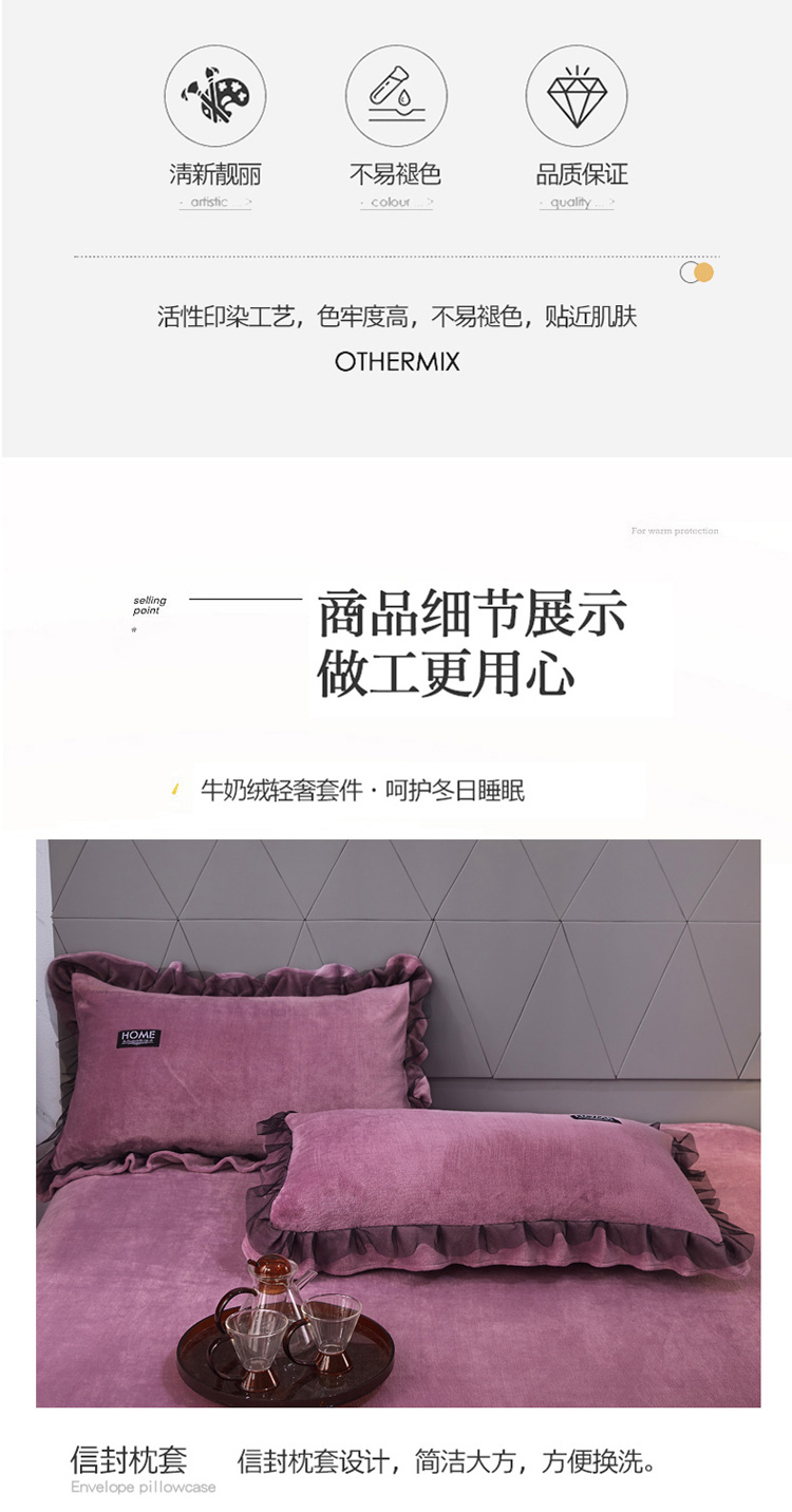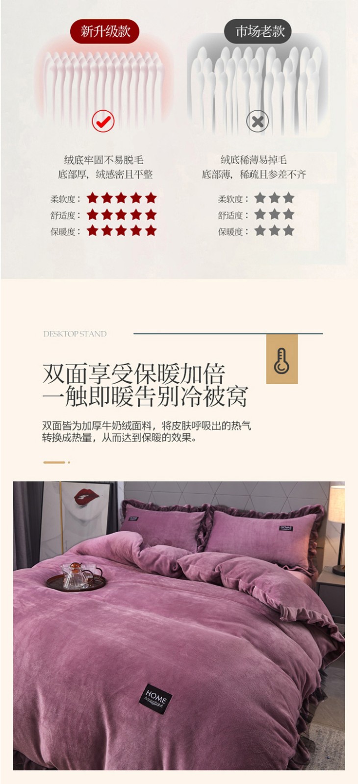 2023牛奶绒保暖四件套韩版蕾丝花边,紫色,松花绿,灰色,豆沙,宾利蓝