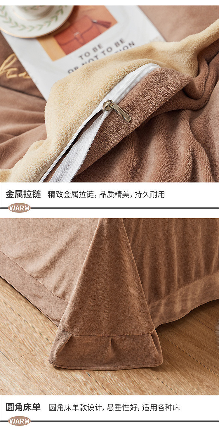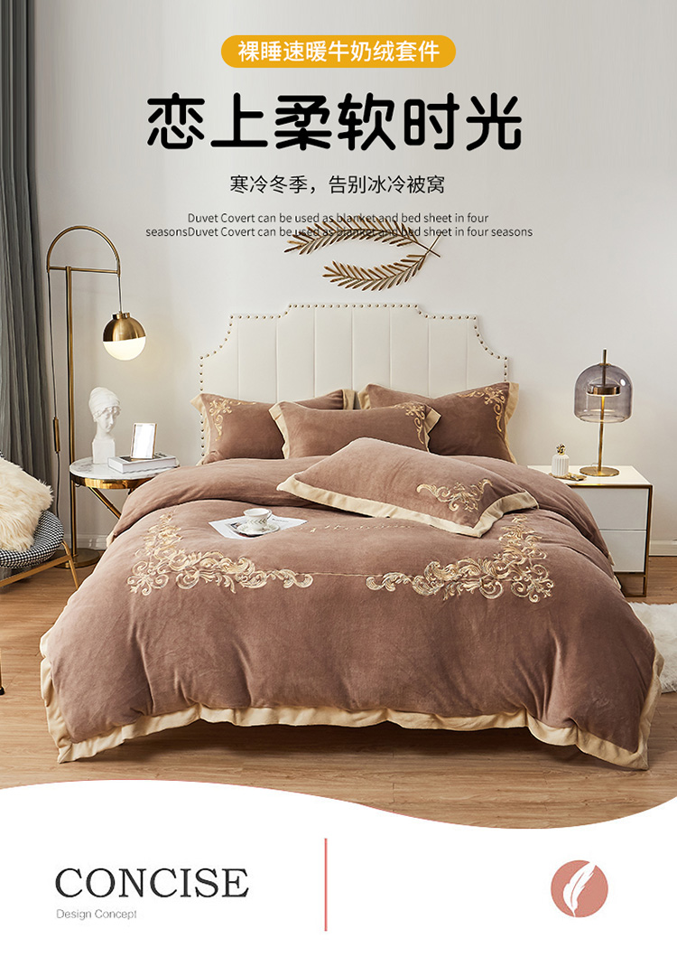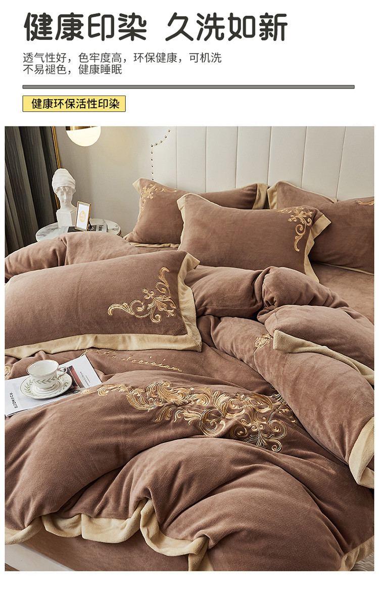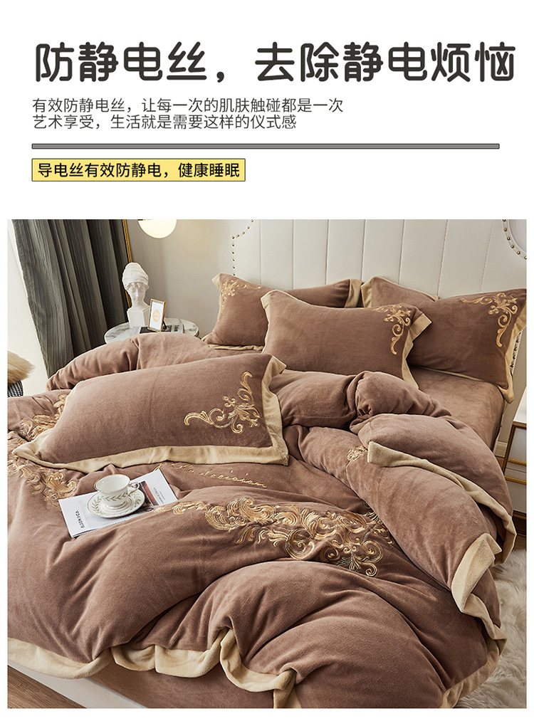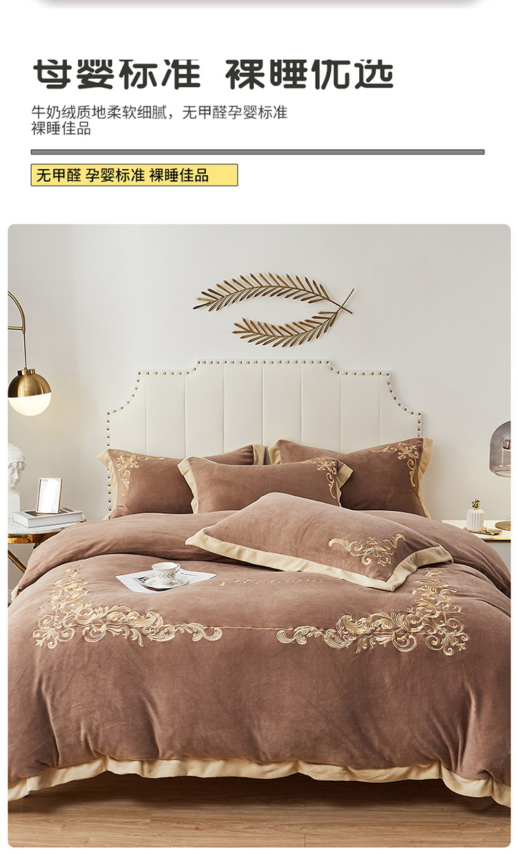 22新款保暖加厚牛奶绒四件套宝宝绒欧尚刺绣四件套欧典卡其色