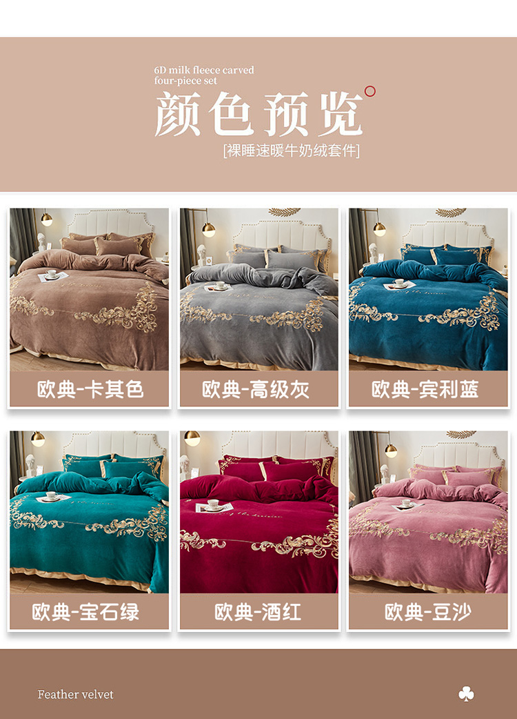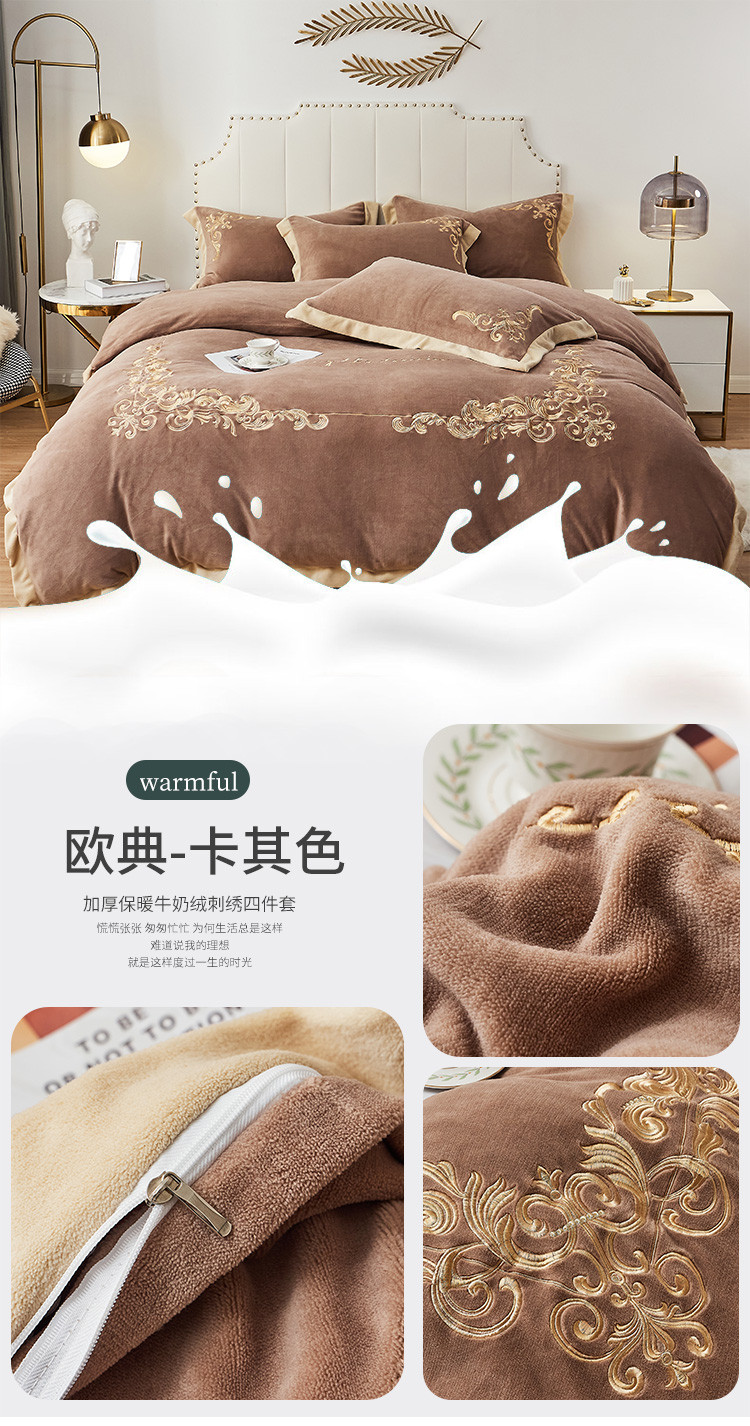 商品名称:22新款保暖加厚牛奶绒四件套宝宝绒欧尚刺绣四件套欧典卡其色