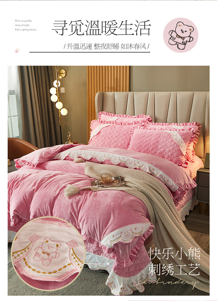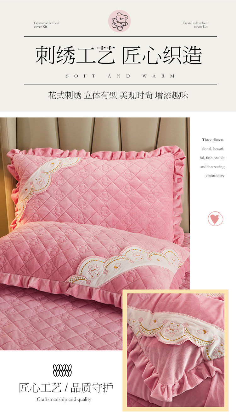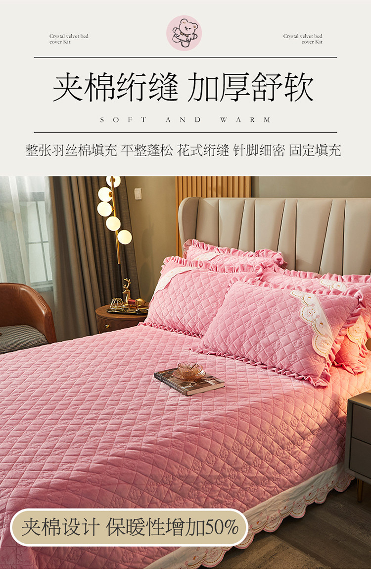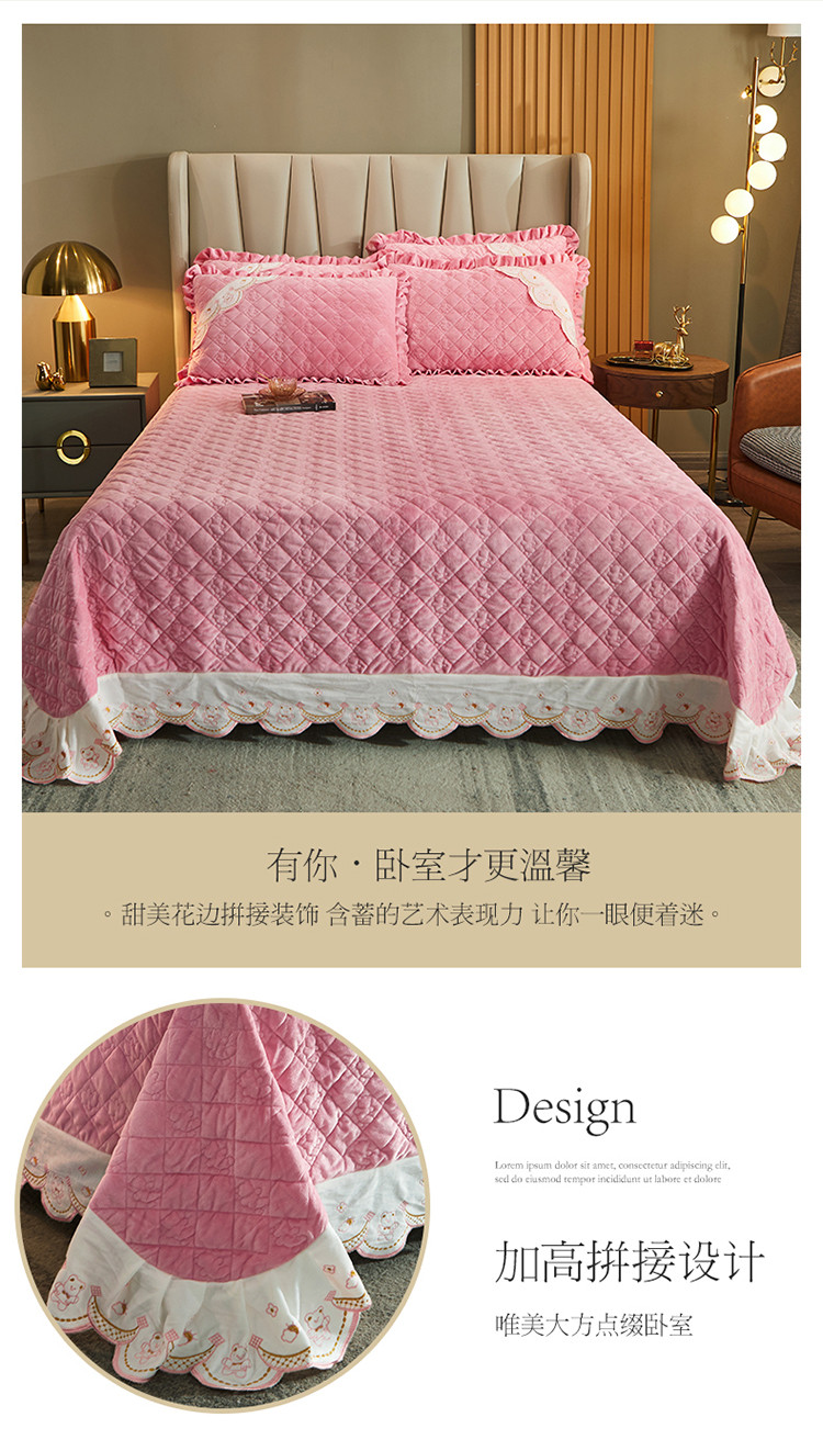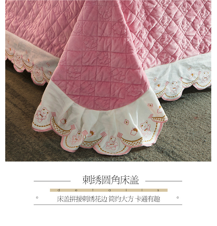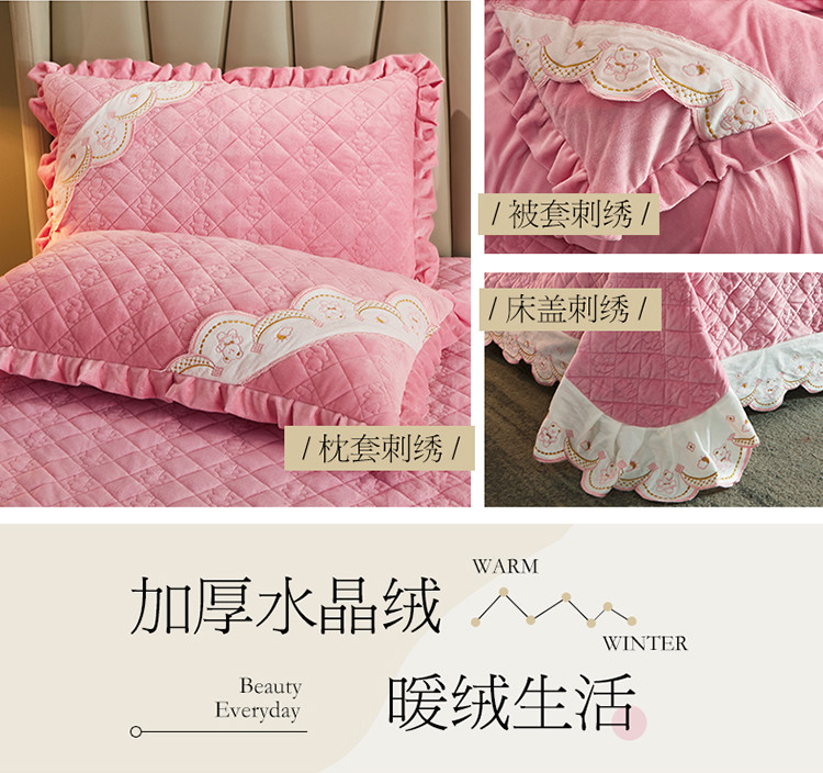 宜凡 2021新款水晶绒夹棉绗缝床盖四件套 快乐小熊-嫩粉
