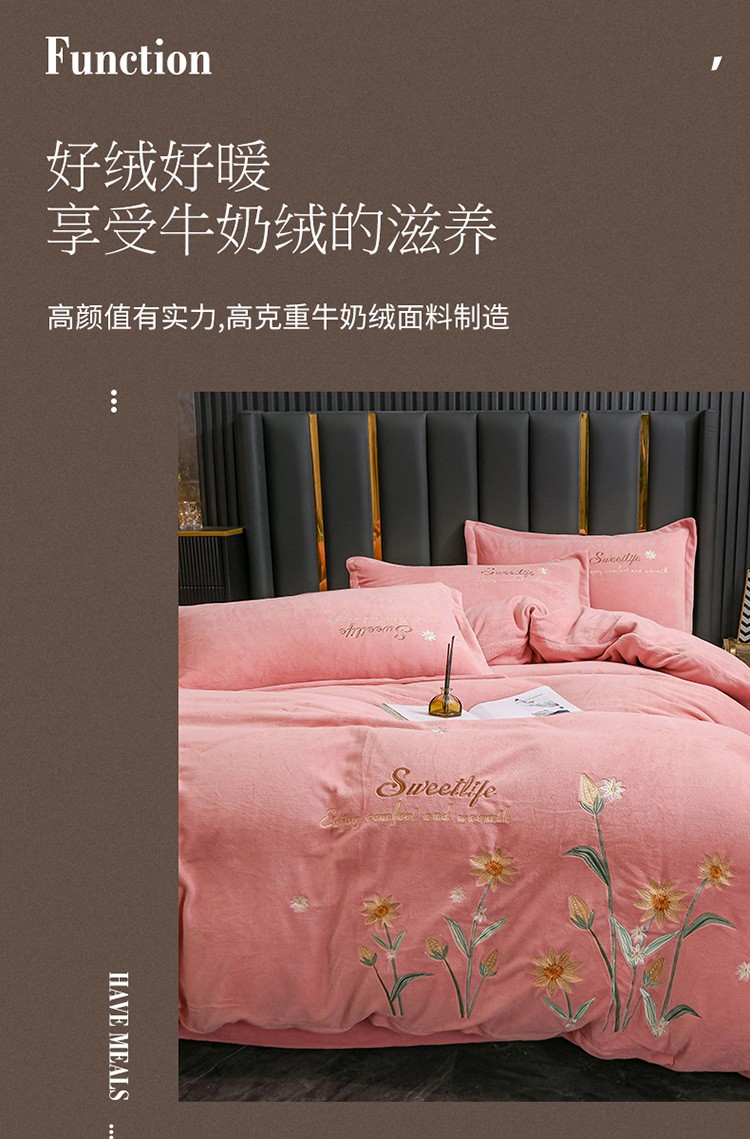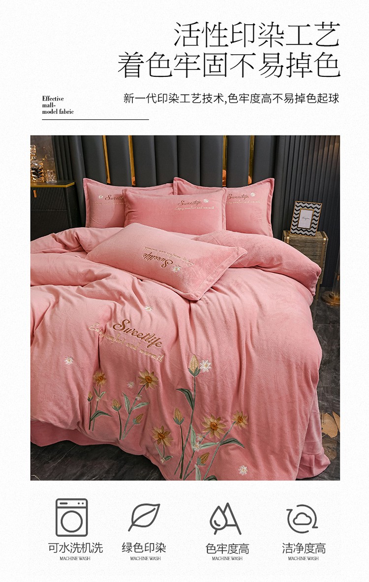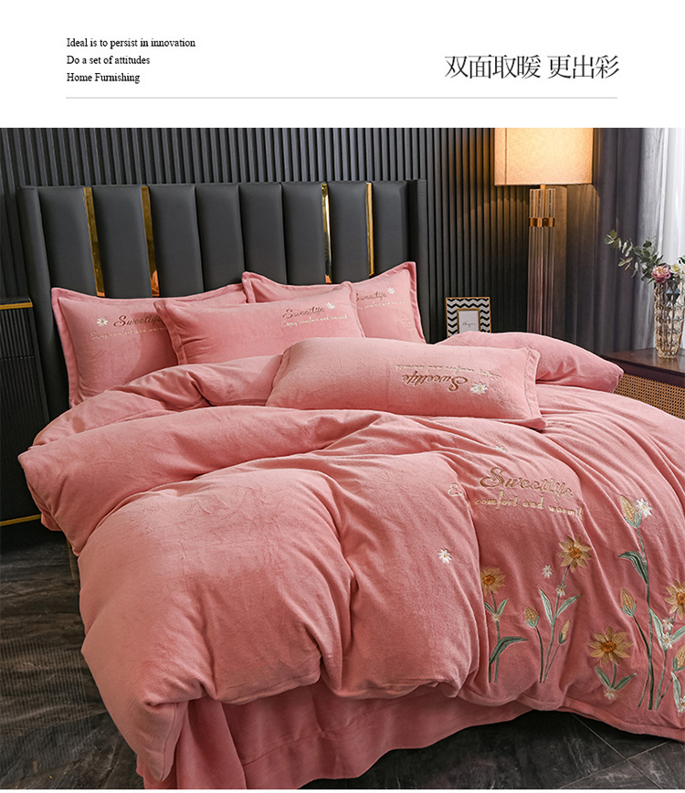 金米诺 2022新款牛奶绒平绣四件套 花-浅豆沙