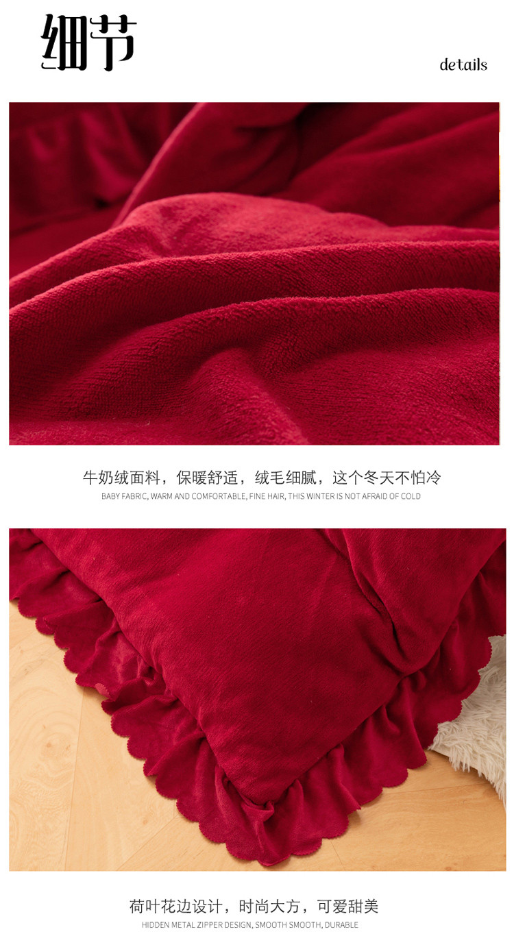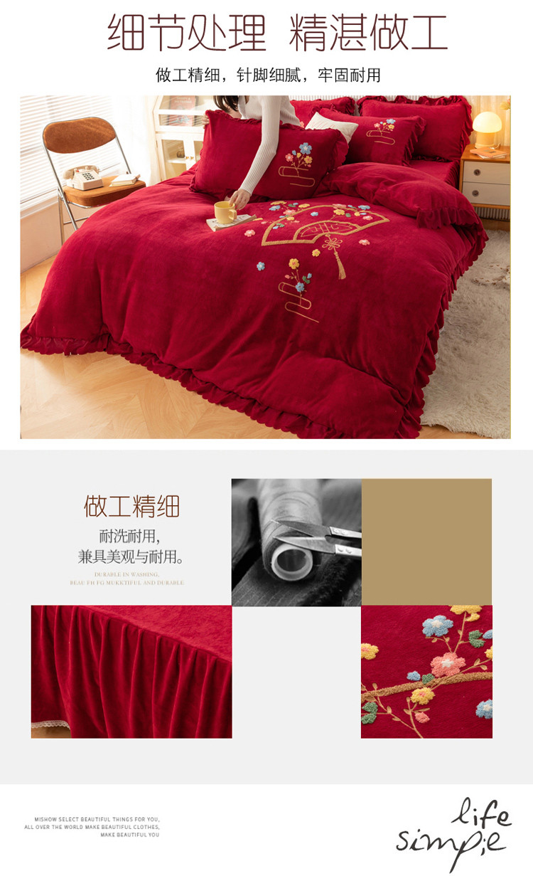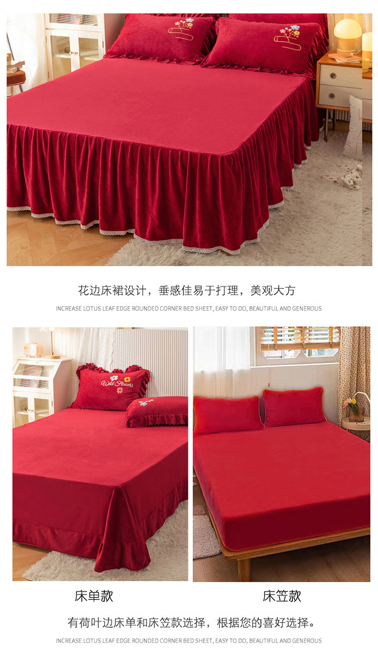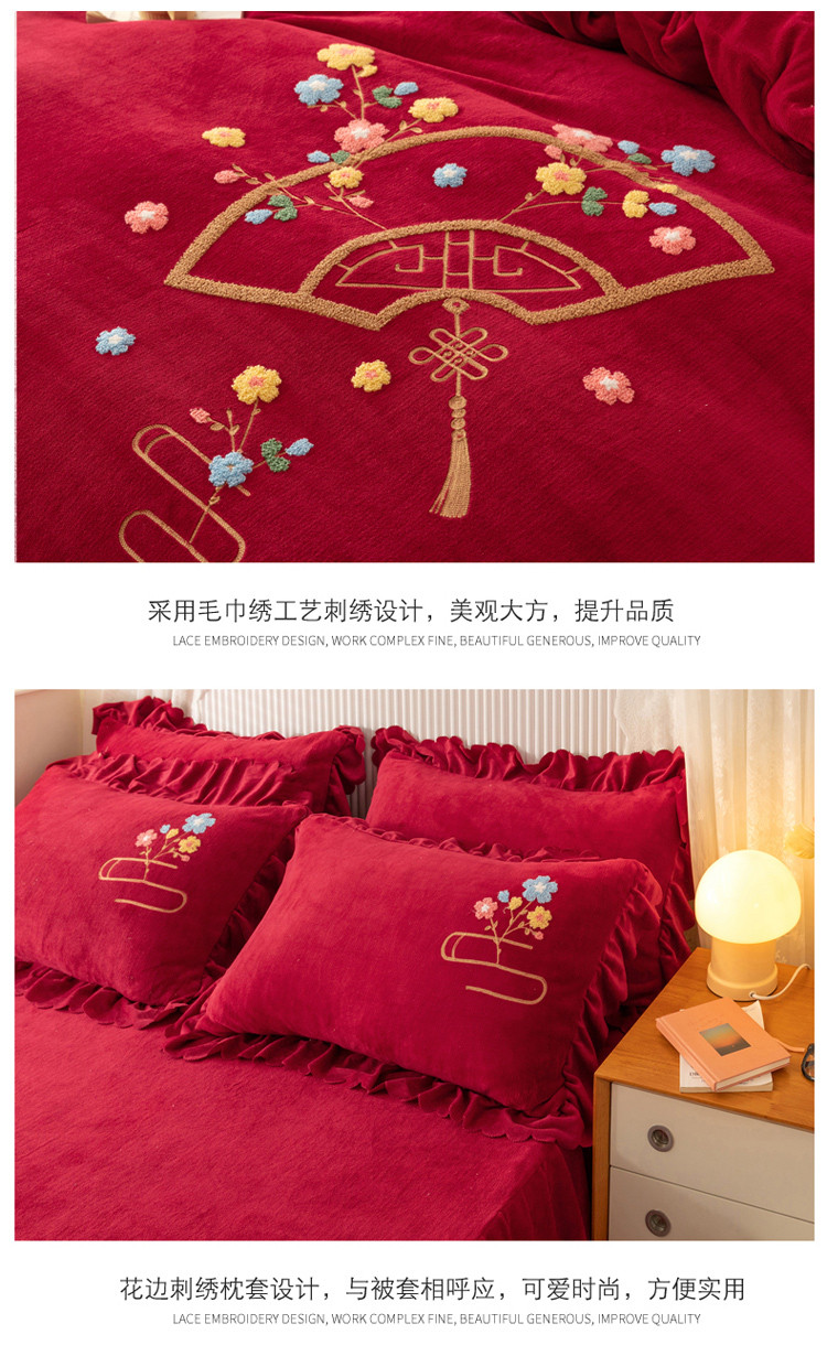 当前位置: 91家纺网 > 商品网购 > 床品套件 > 四件套 > 牛奶绒四件套 > 新品韩版花边绣花牛奶绒法莱水晶绒床单床裙款四件套 美人扇酒红