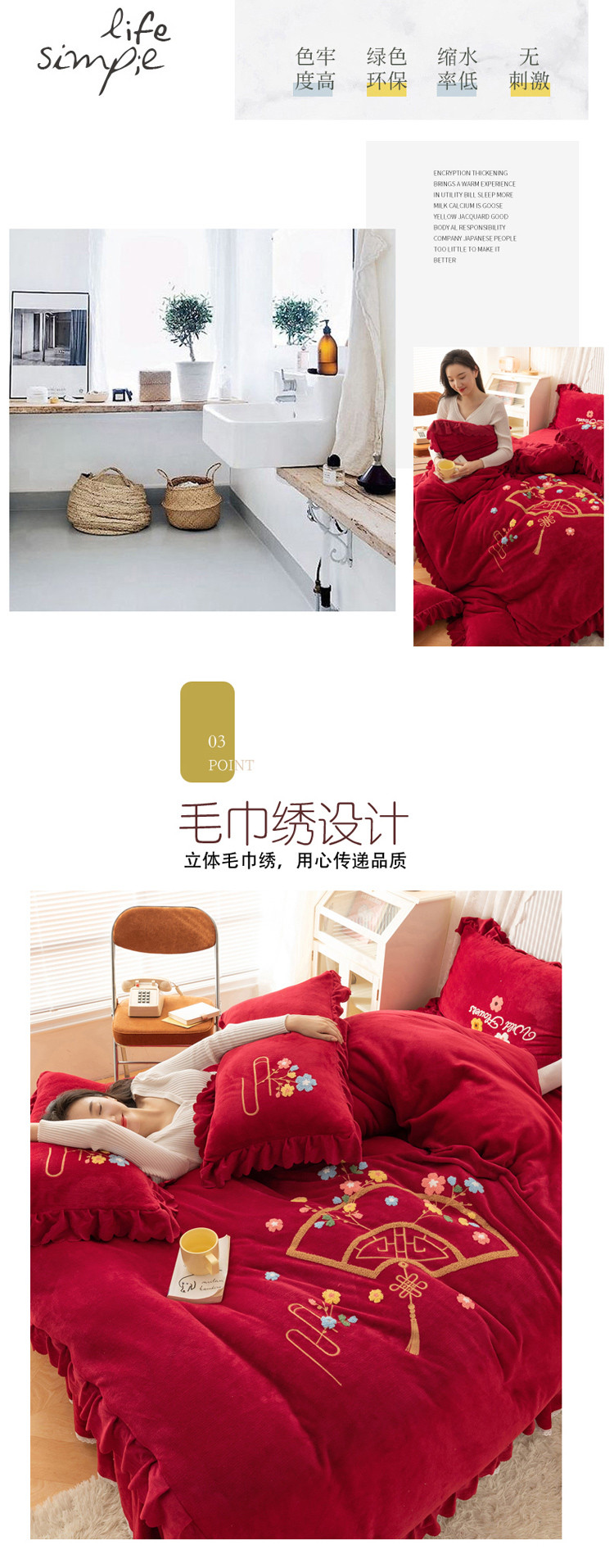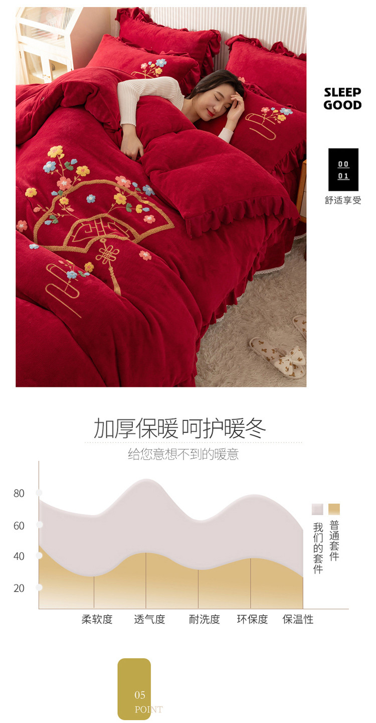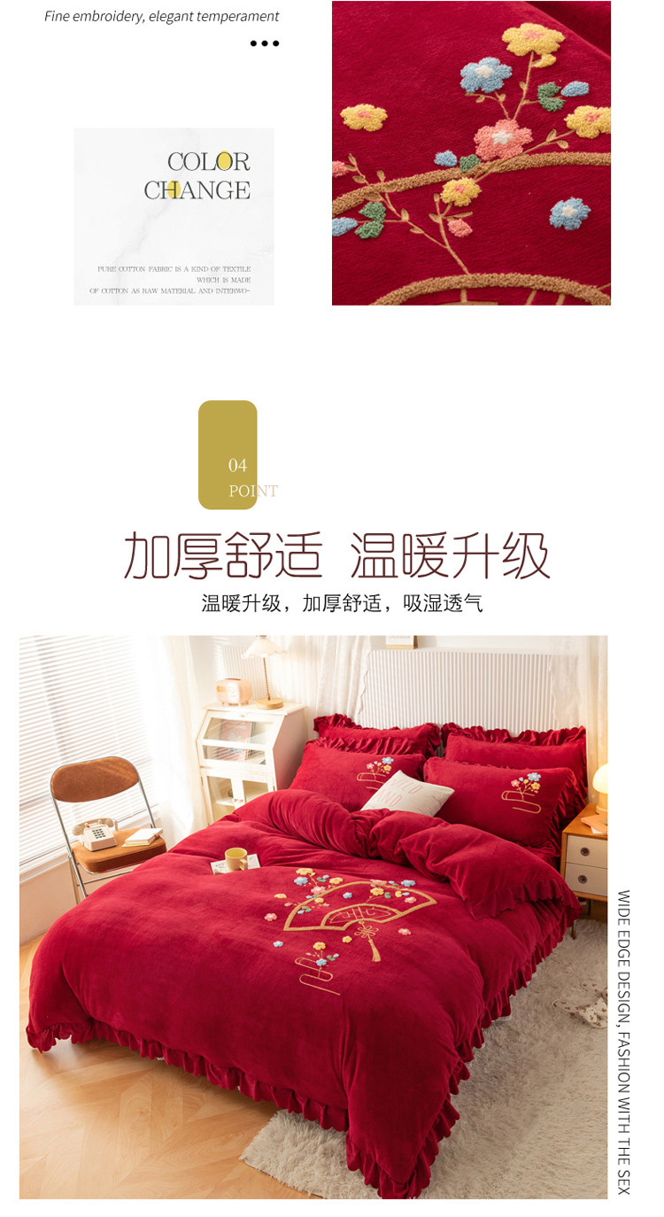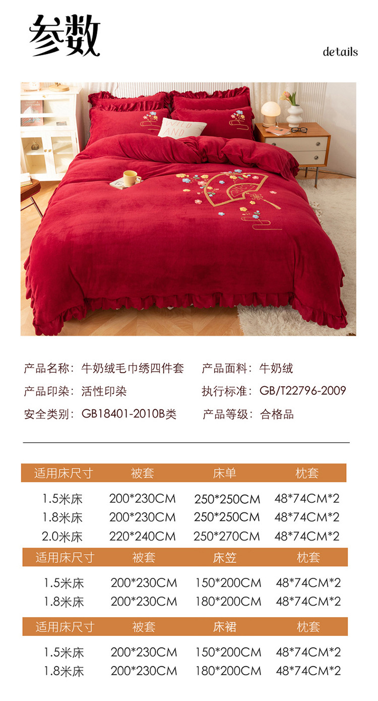 当前位置: 91家纺网 > 商品网购 > 床品套件 > 四件套 > 牛奶绒四件套 > 新品韩版花边绣花牛奶绒法莱水晶绒床单床裙款四件套 美人扇酒红