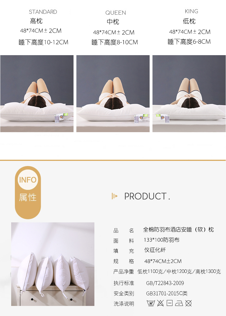 2022全棉133*100防羽布酒店布草羽丝绒枕头单人枕芯,酒店布草A+单边低枕(1100克),酒店布草A+单边中枕(1200克),酒店布草A+立体高枕(1300克)