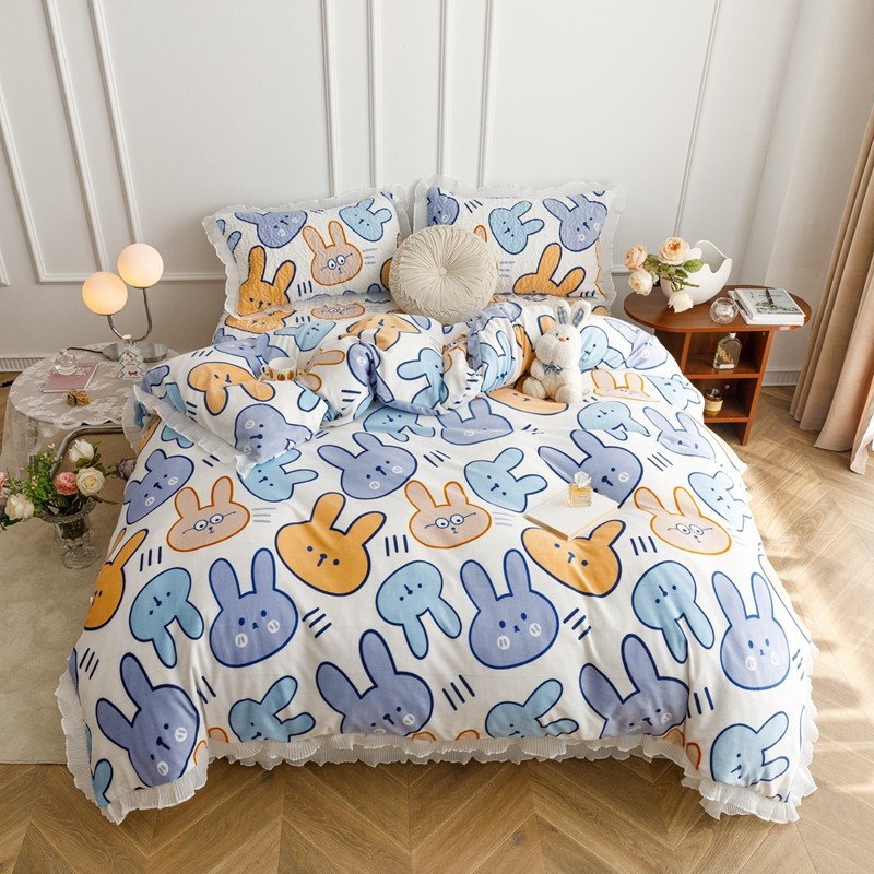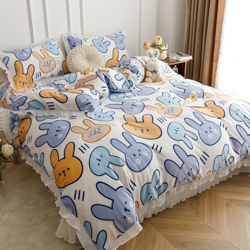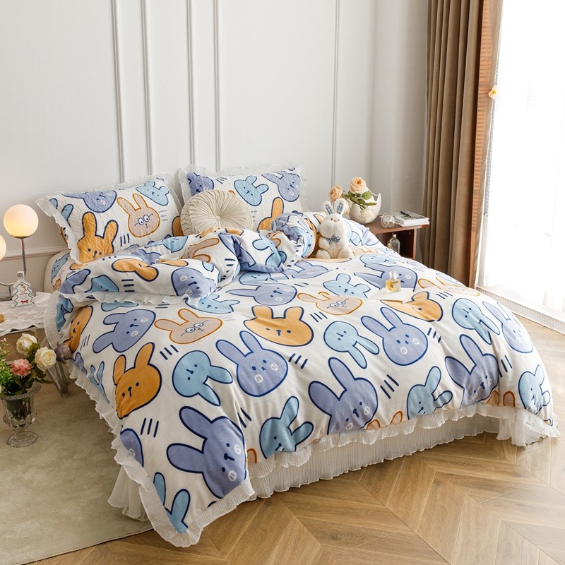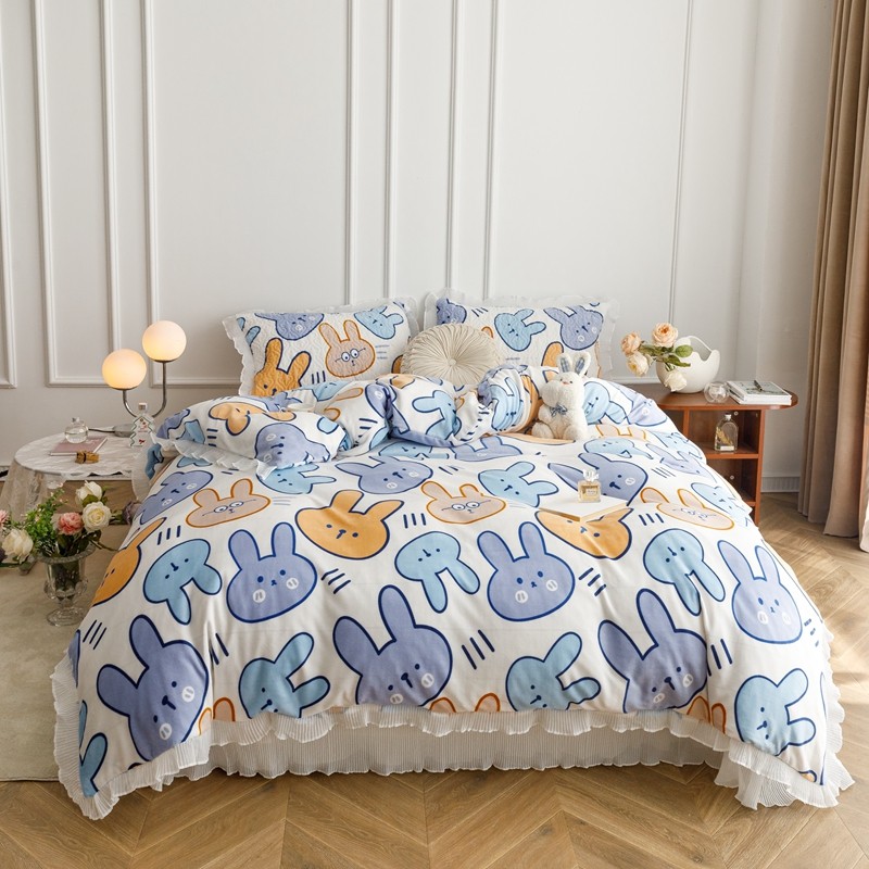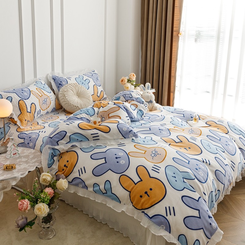 北纬27度 2022新雪纺花边印花牛奶绒床盖款四件套直播爆款 兔奇-白