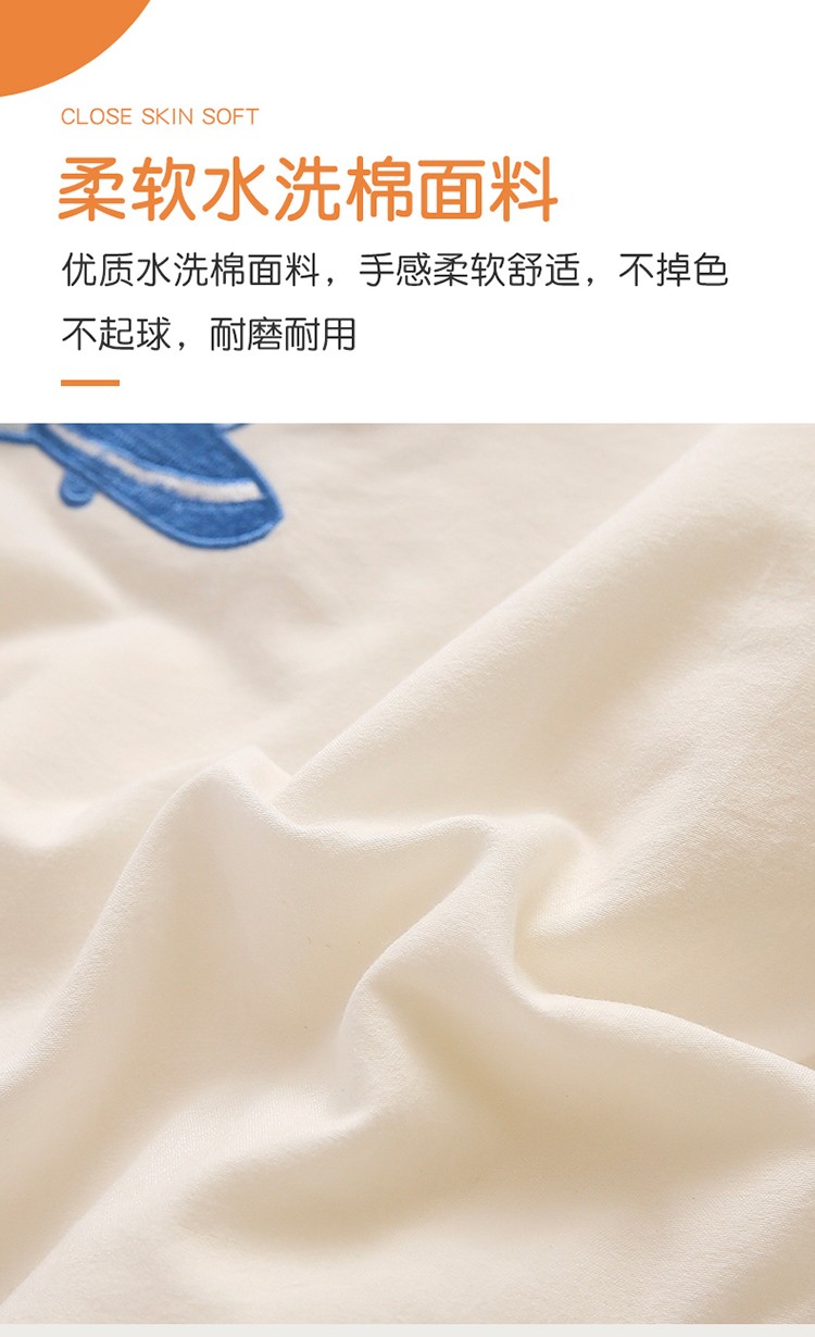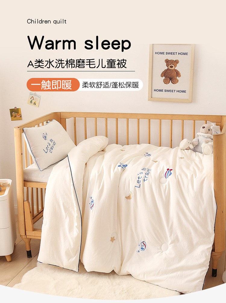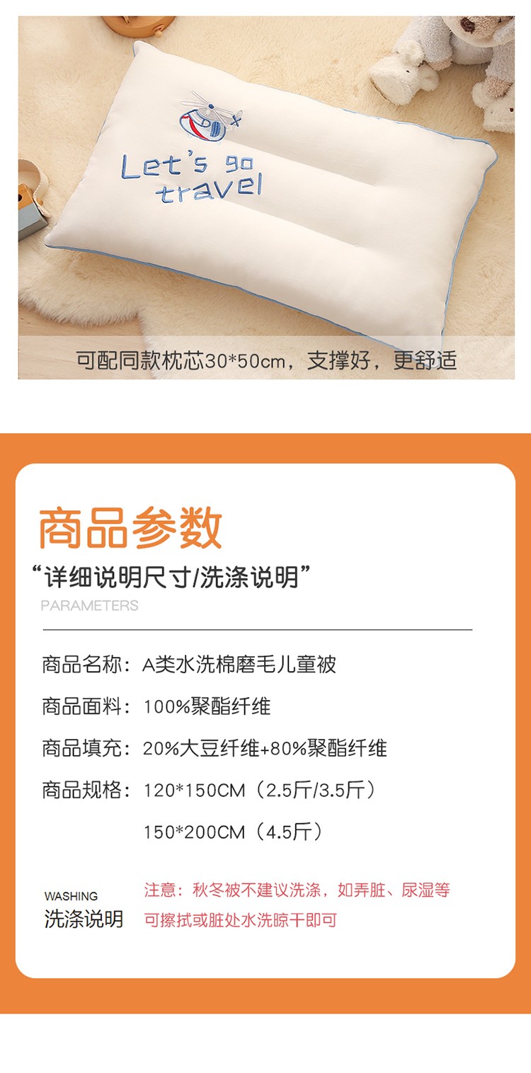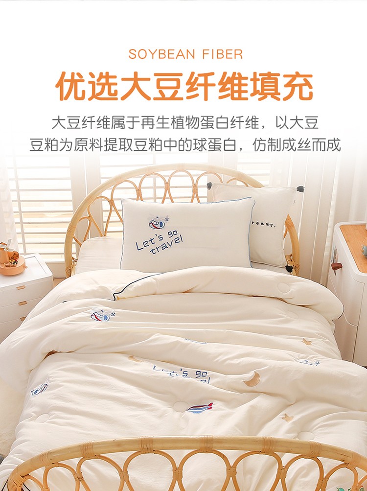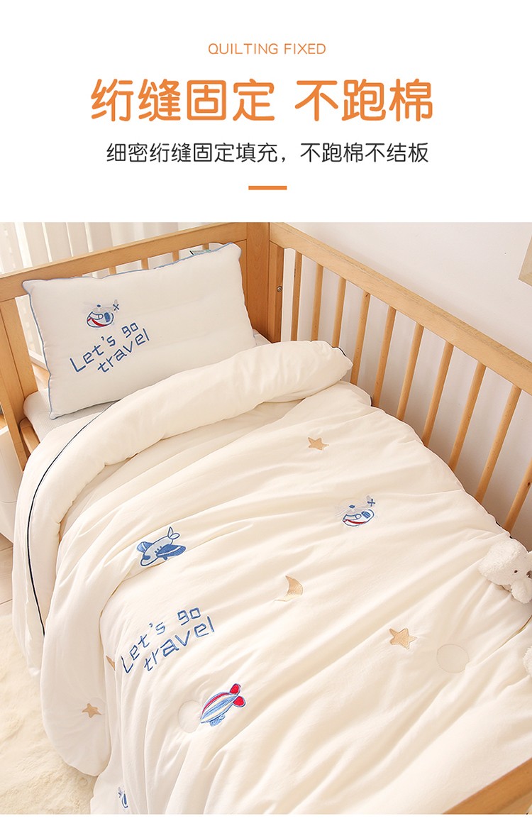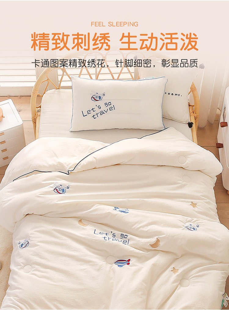 商品名称:A类水洗棉磨毛绣花款幼儿园冬被大豆儿童春秋被芯宝宝午睡被子 出游日记-白