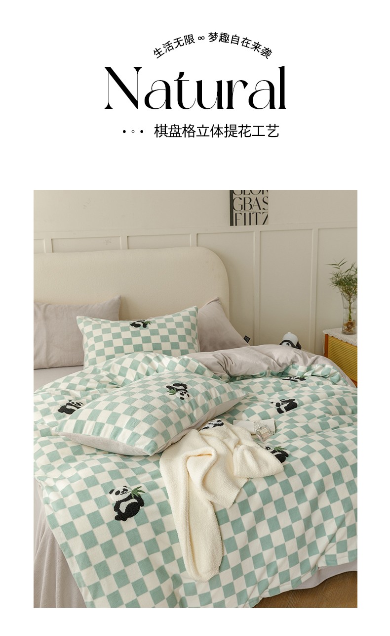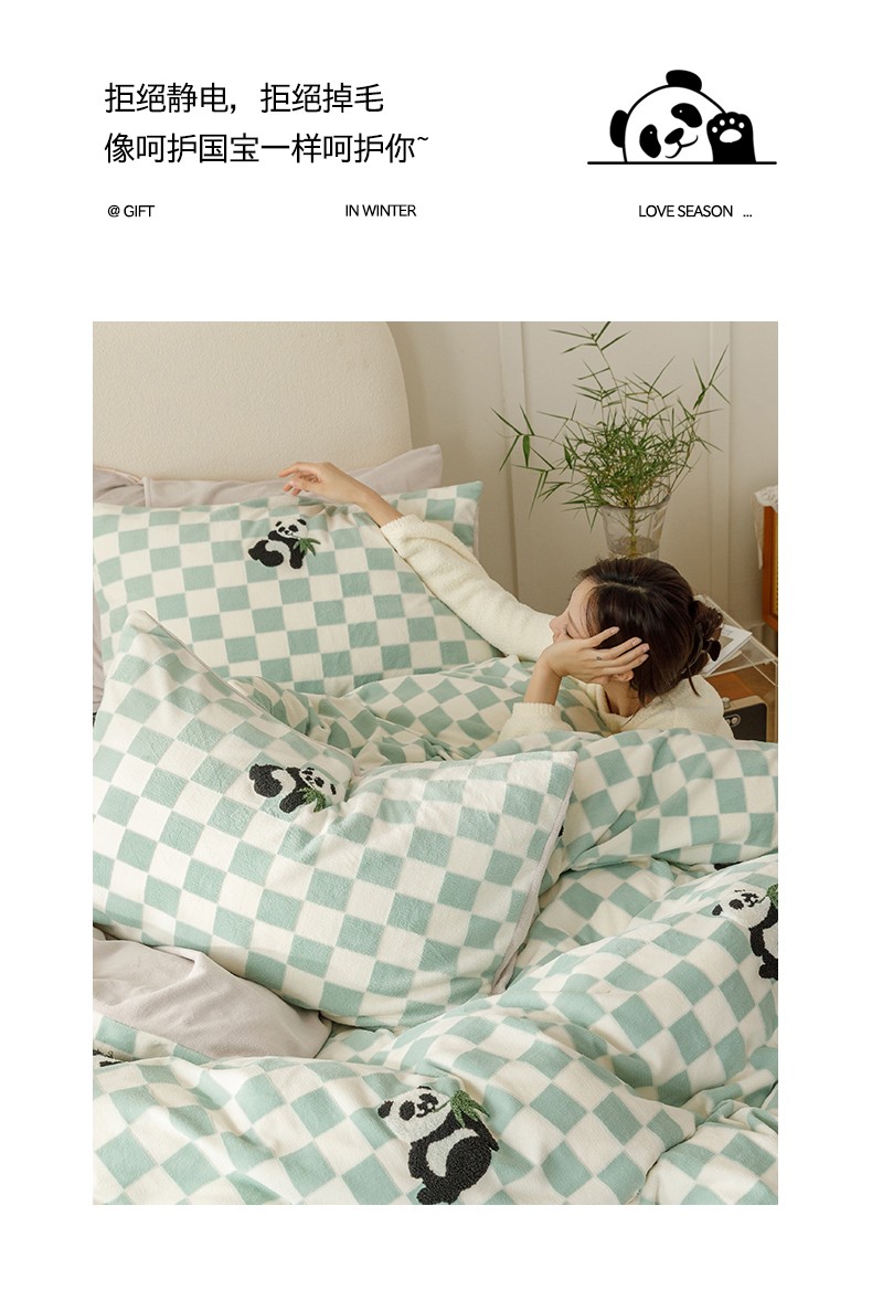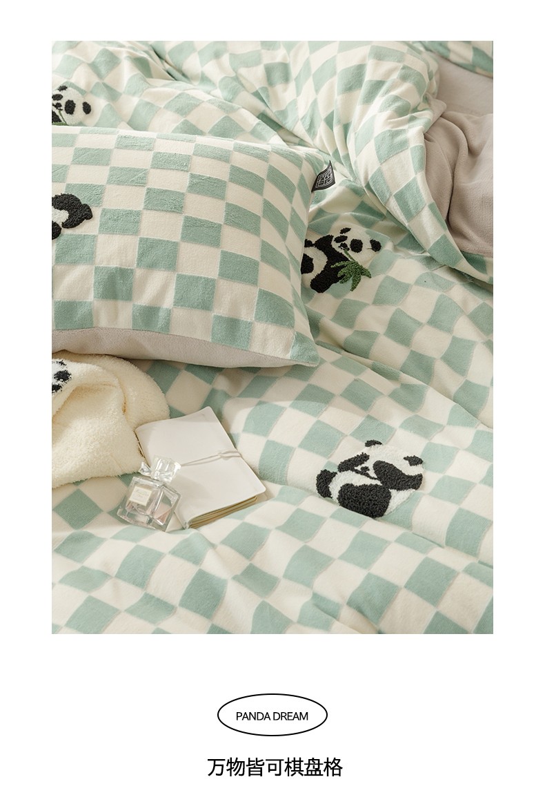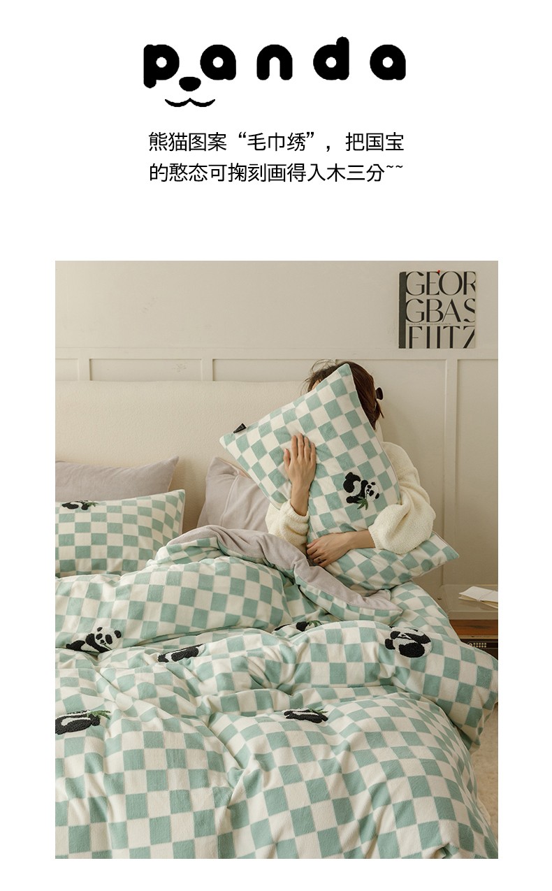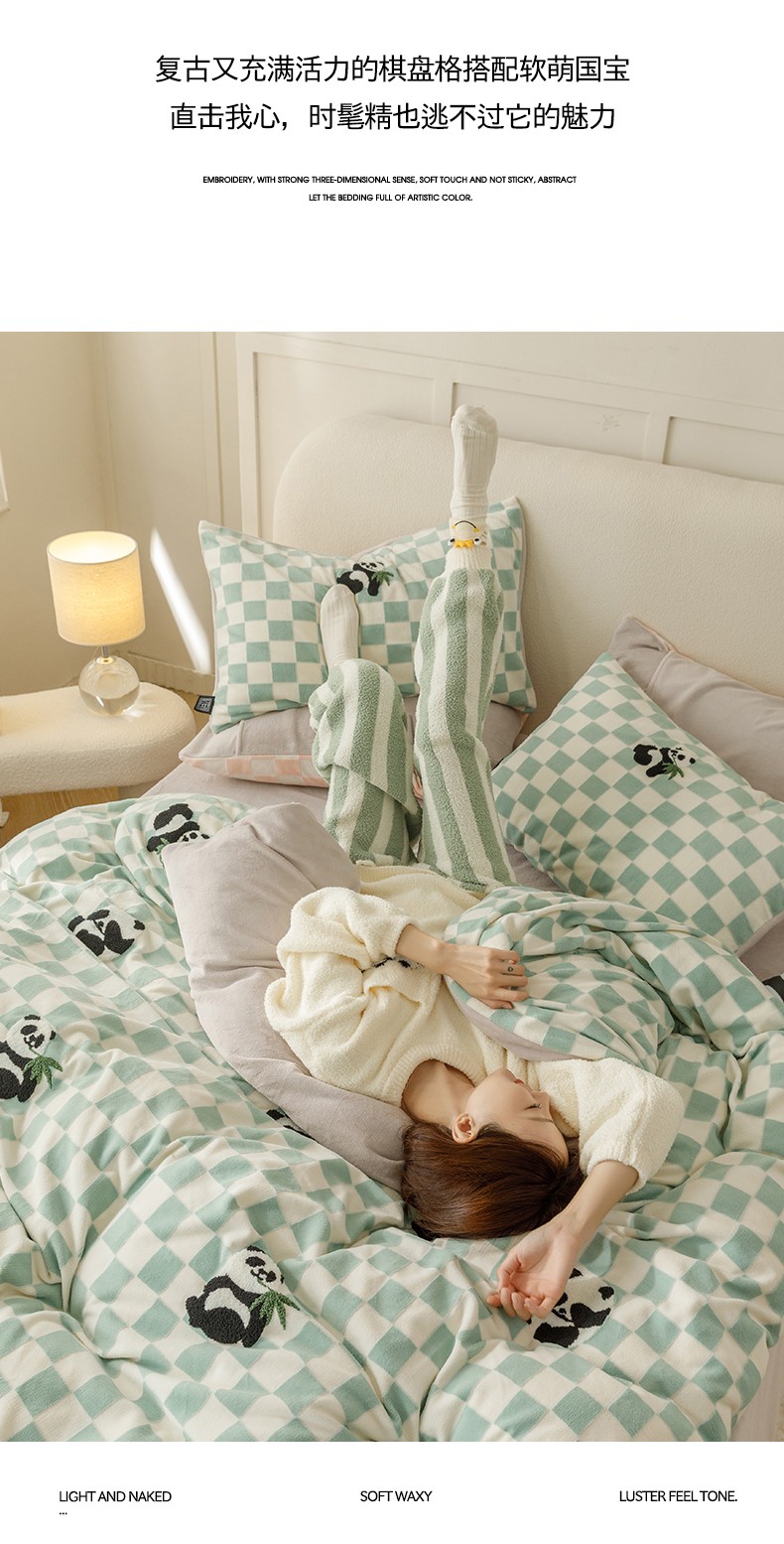 2022锦芙牛奶绒250克全消光绣花四件套,情绪熊猫-绿竹