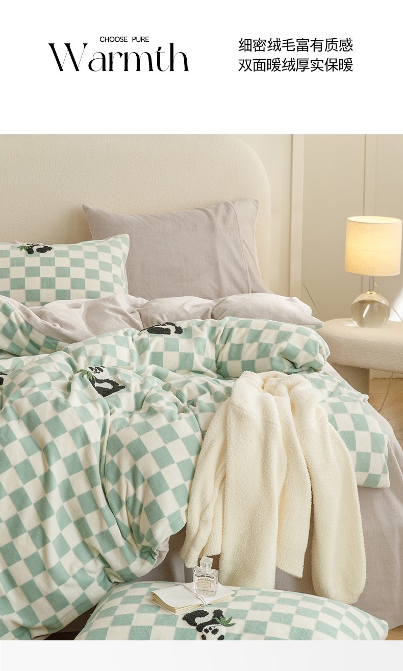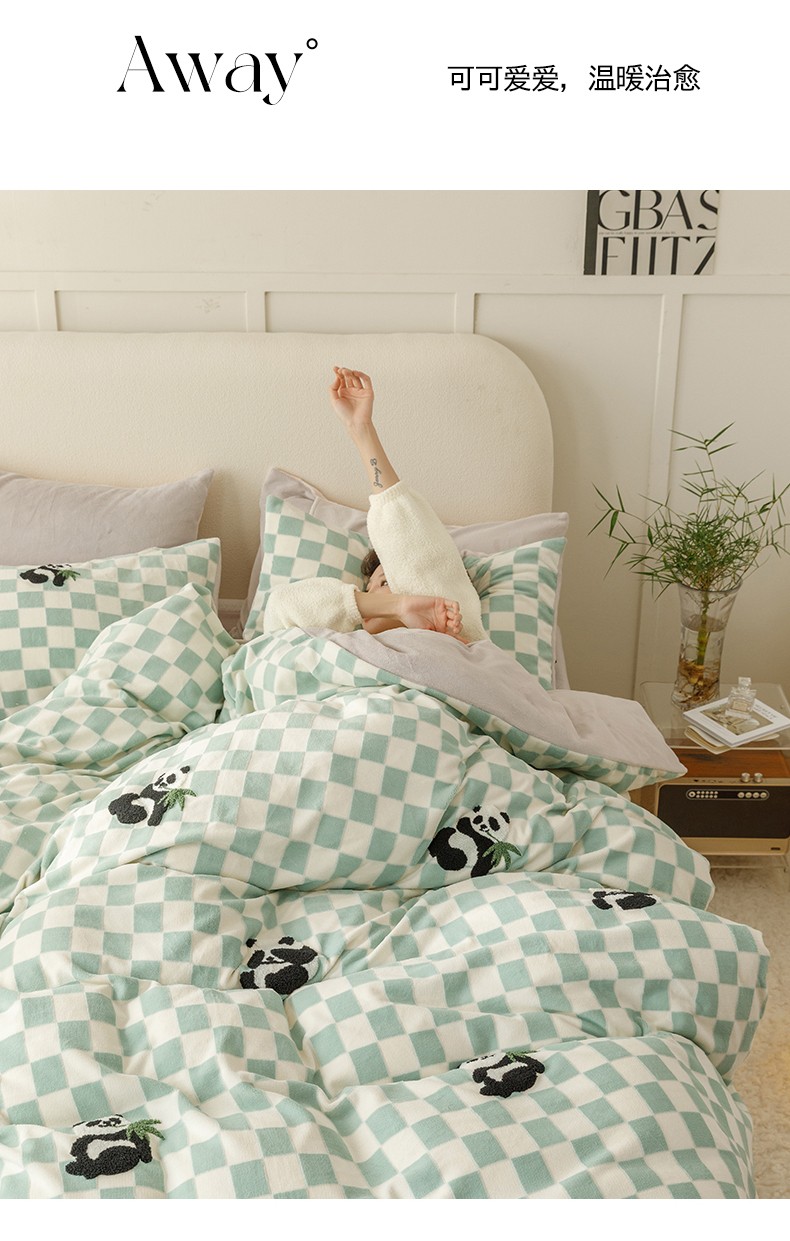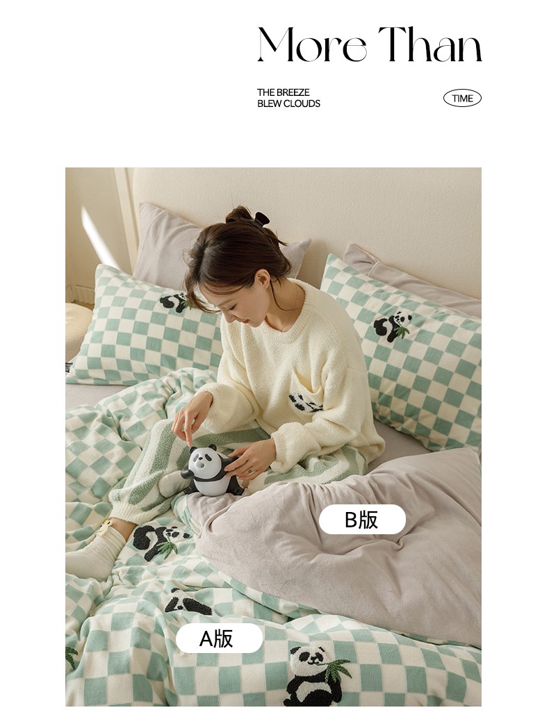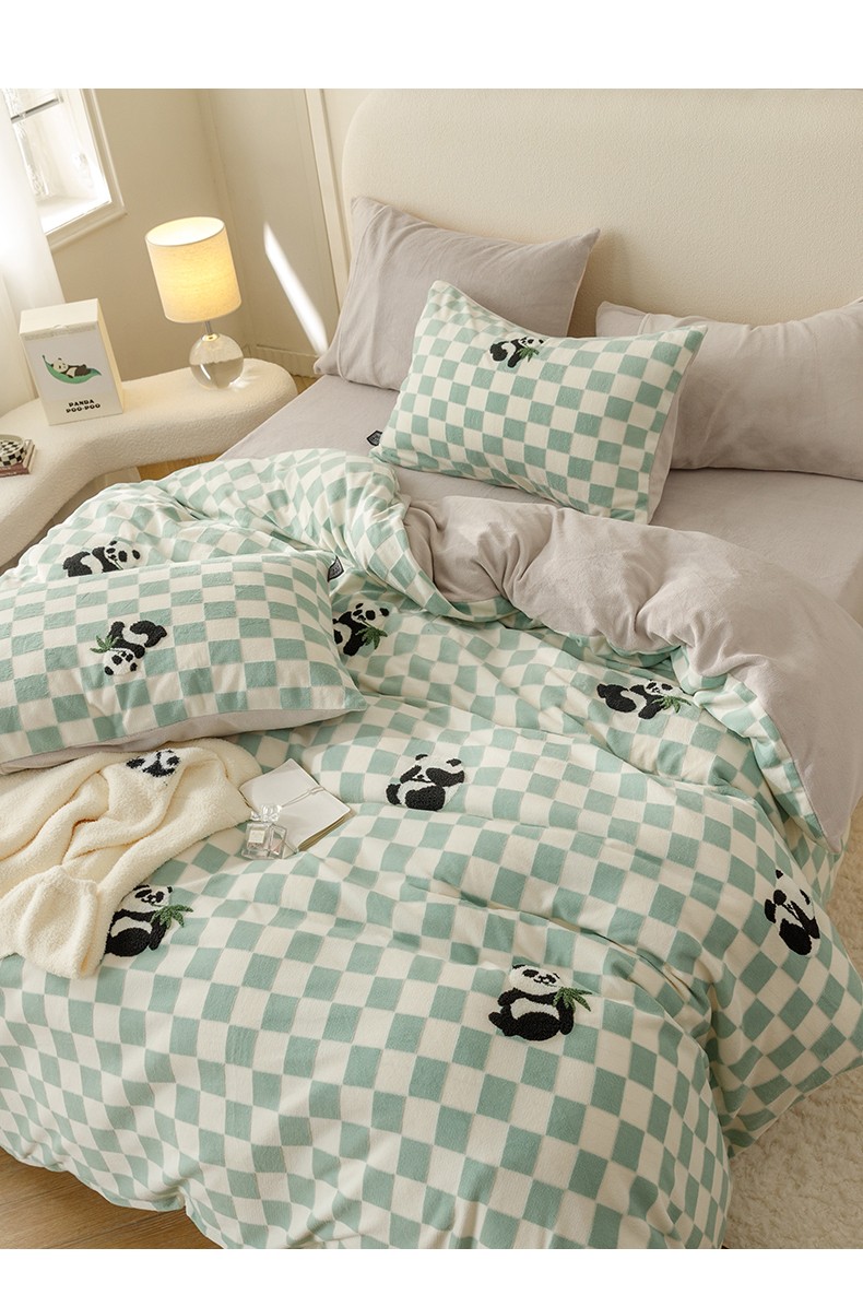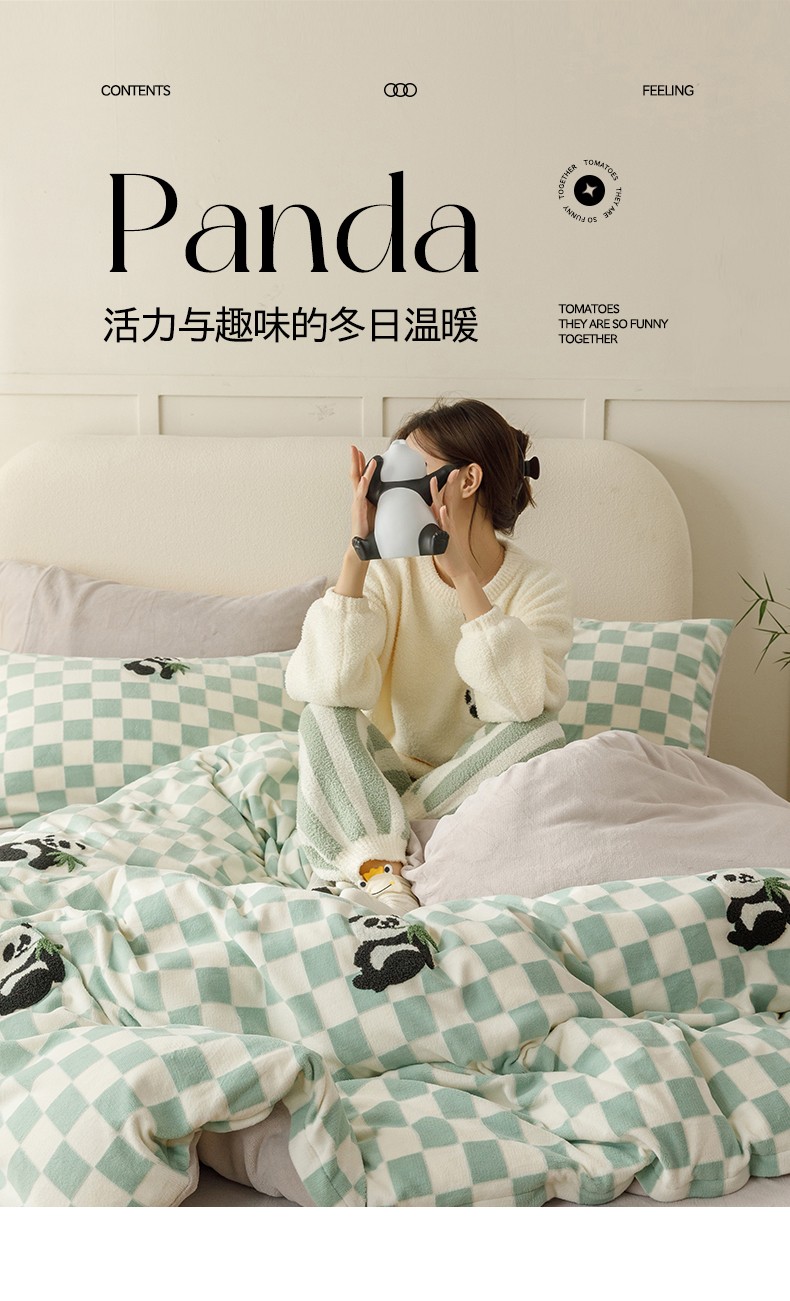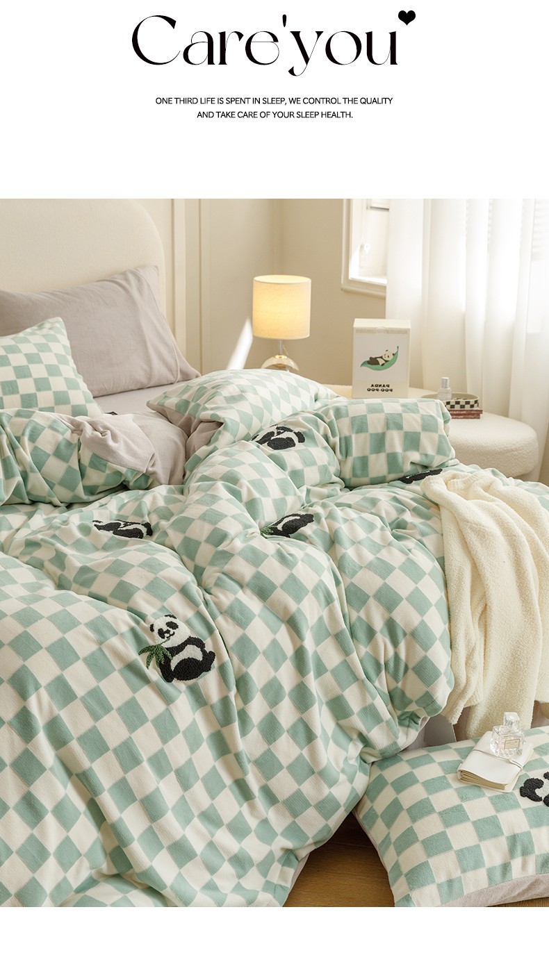 2022锦芙牛奶绒250克全消光绣花四件套,情绪熊猫-绿竹