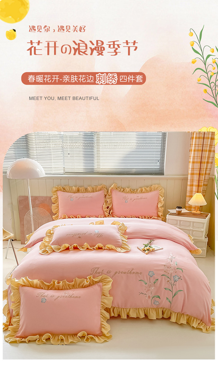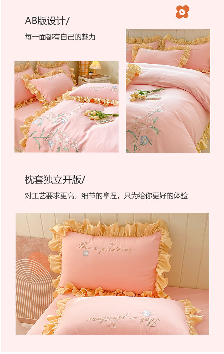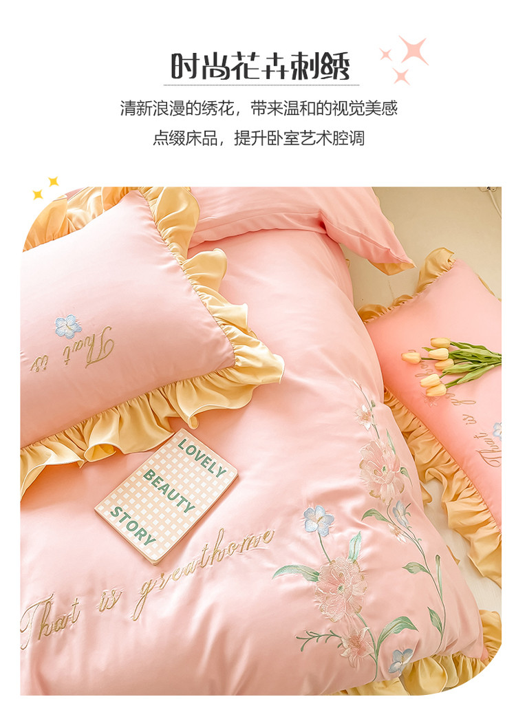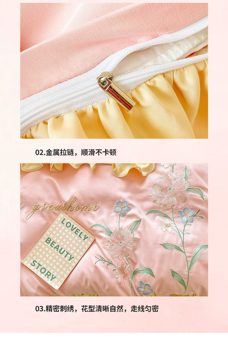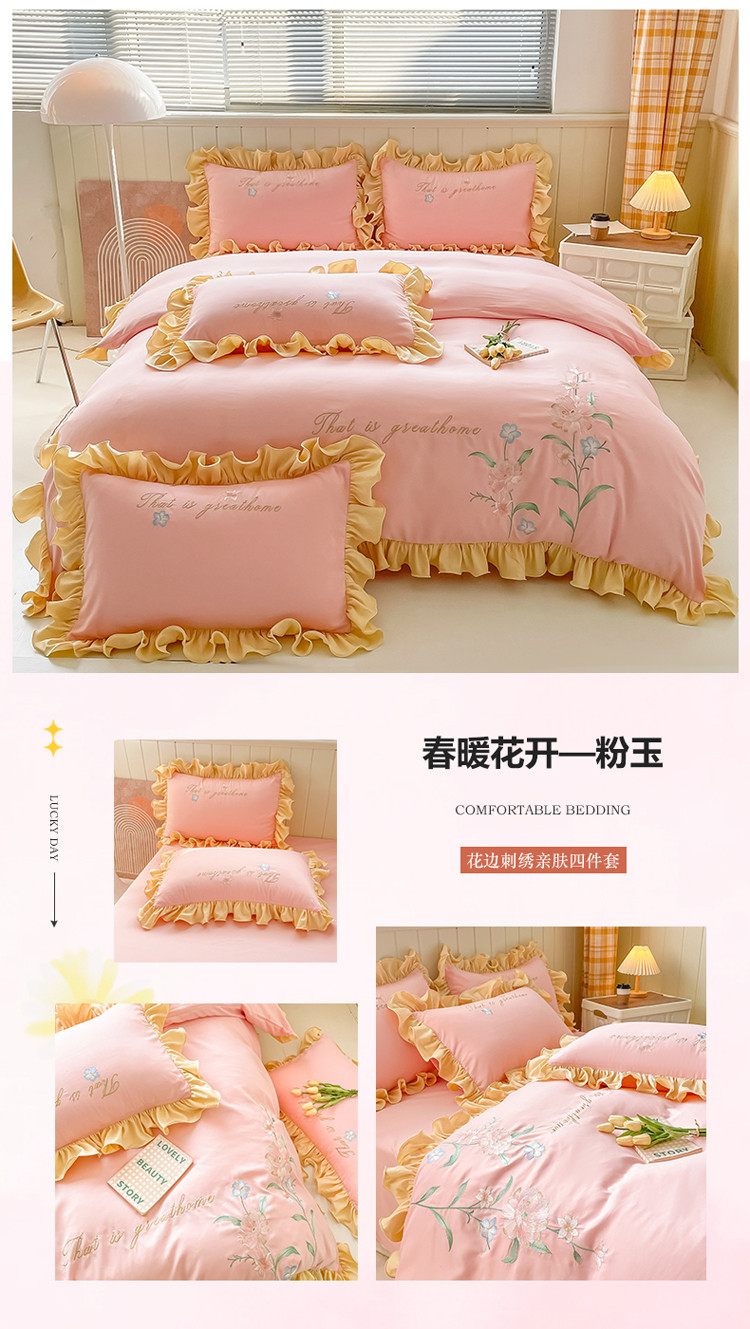 富盛 2024新款水洗亲肤棉刺绣四件套公主风四件套-春暖花开 粉玉