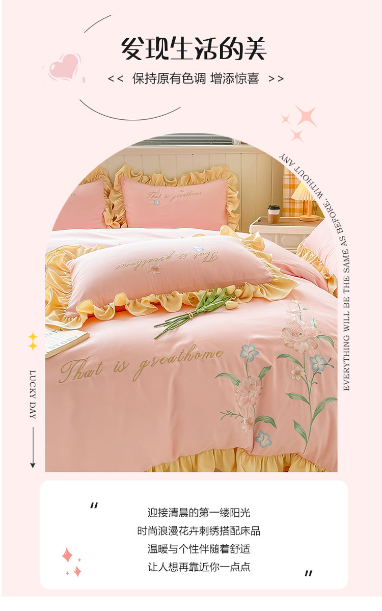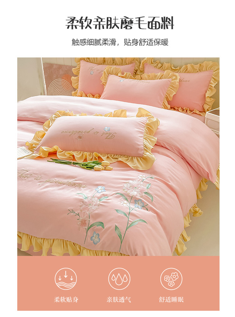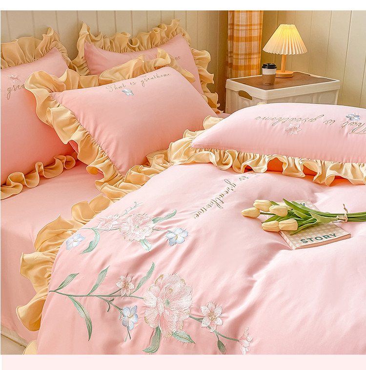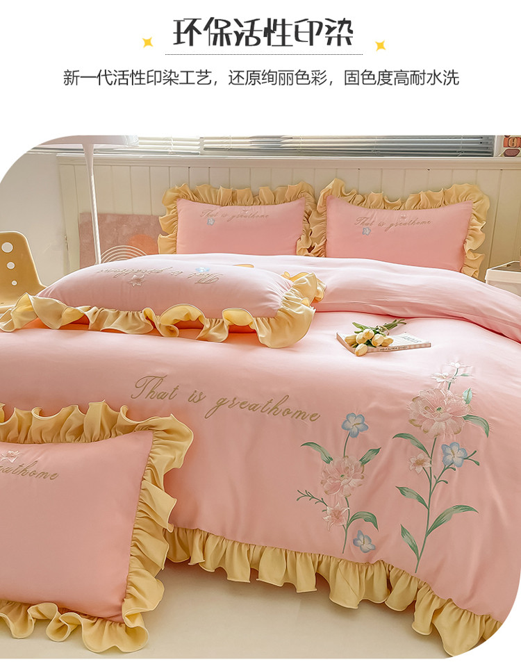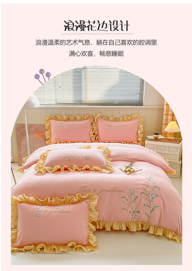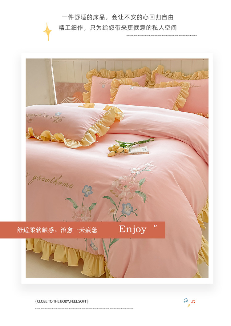 富盛 2024新款水洗亲肤棉刺绣四件套公主风四件套-春暖花开 粉玉