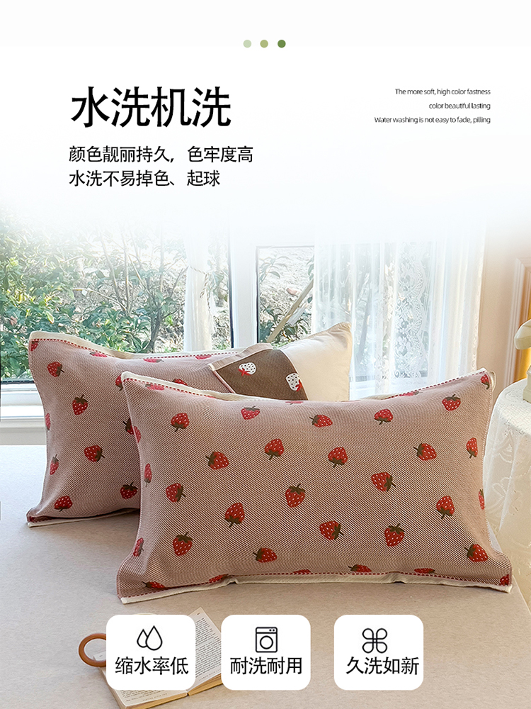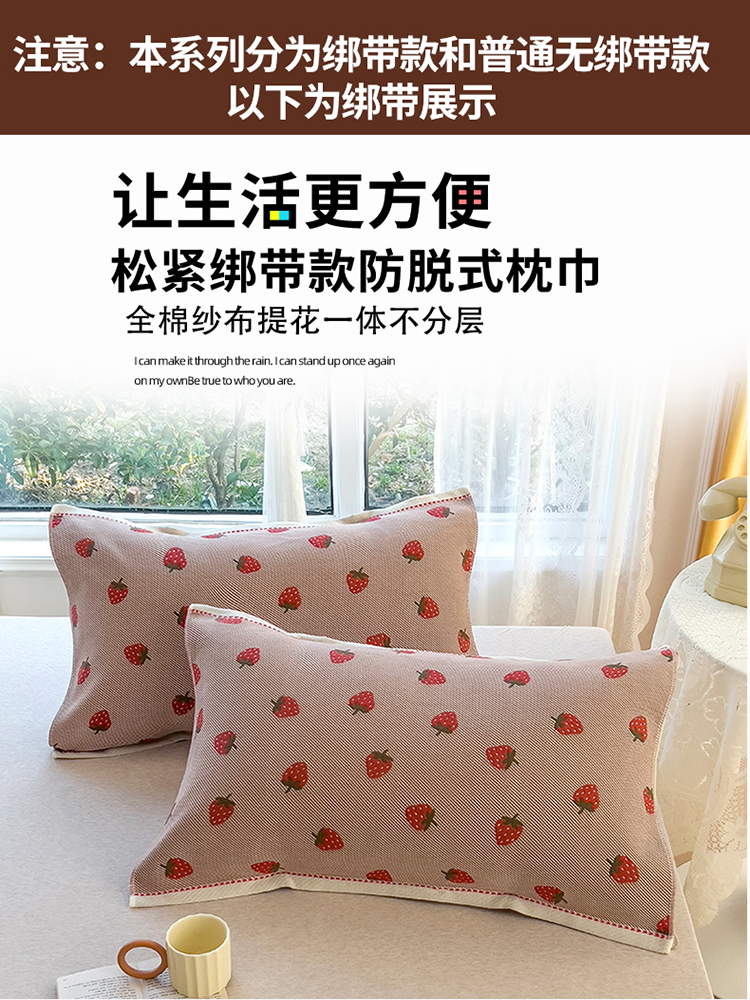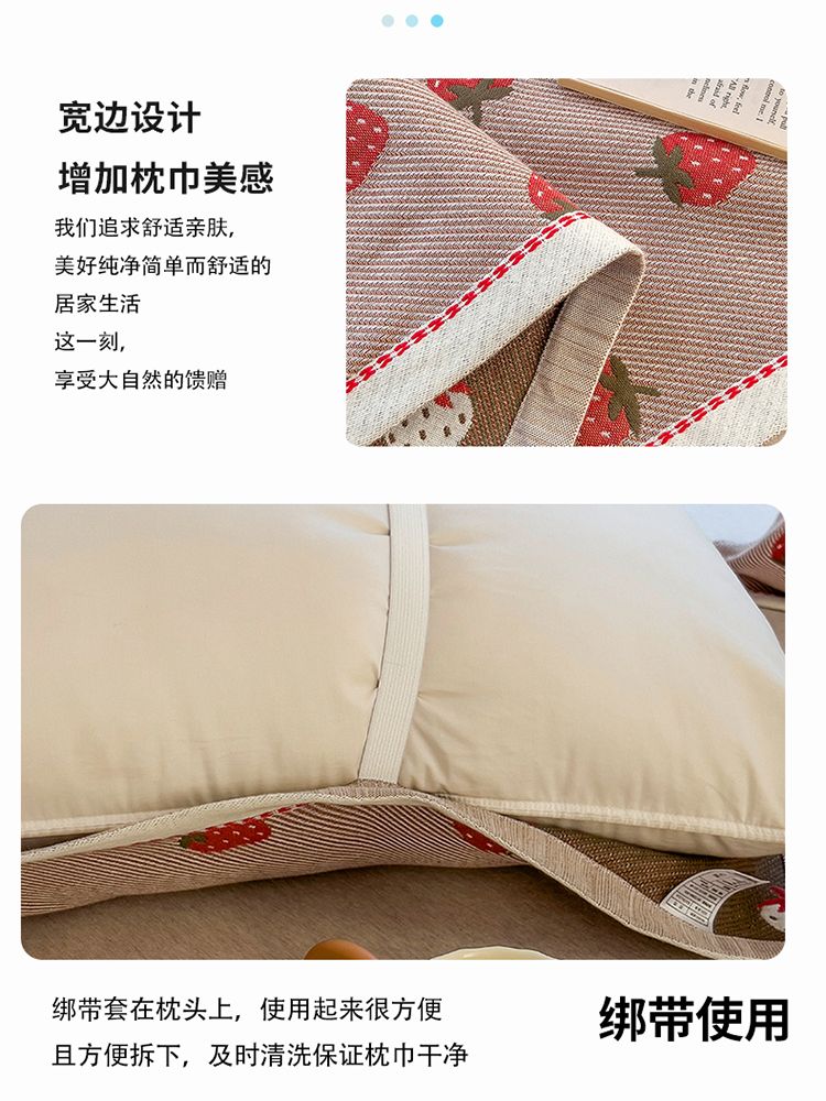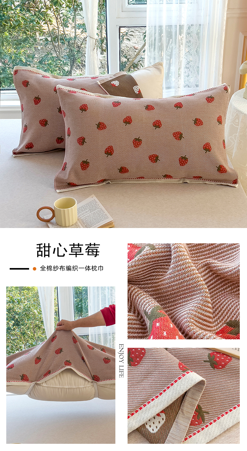 • 91家纺网 家纺一手货源 找家纺 棠薇全棉四层斜纹编织一体不分层松紧绑带枕巾纯棉枕头巾一对 甜心草莓有绑带款