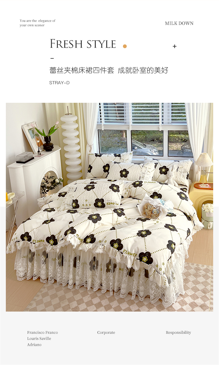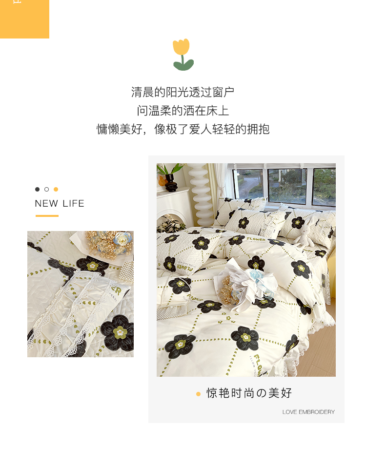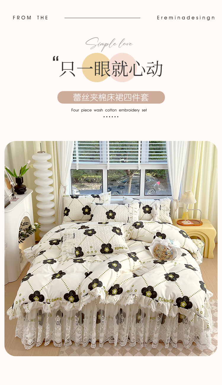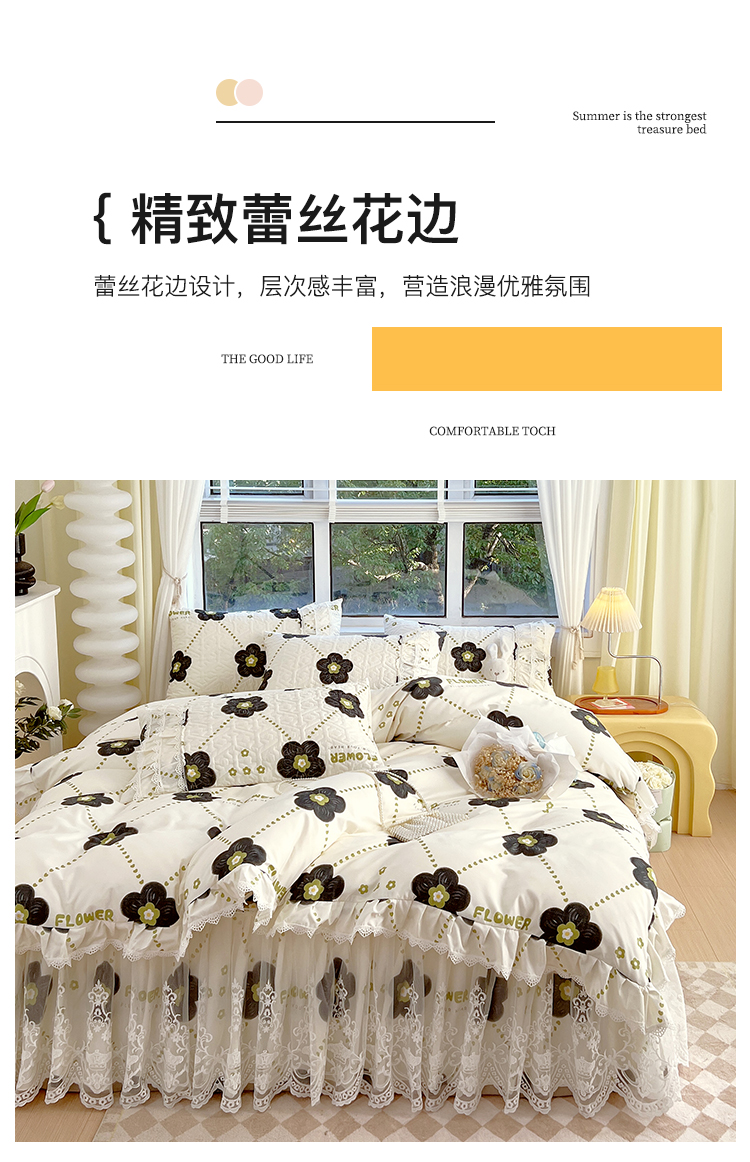 当前位置: 91家纺网 > 商品网购 > 床品套件 > 四件套 > 化纤普通四件套 > 罗艺轩 2024新款法式风蕾丝夹棉床裙款四件套 花想容-花漾青春