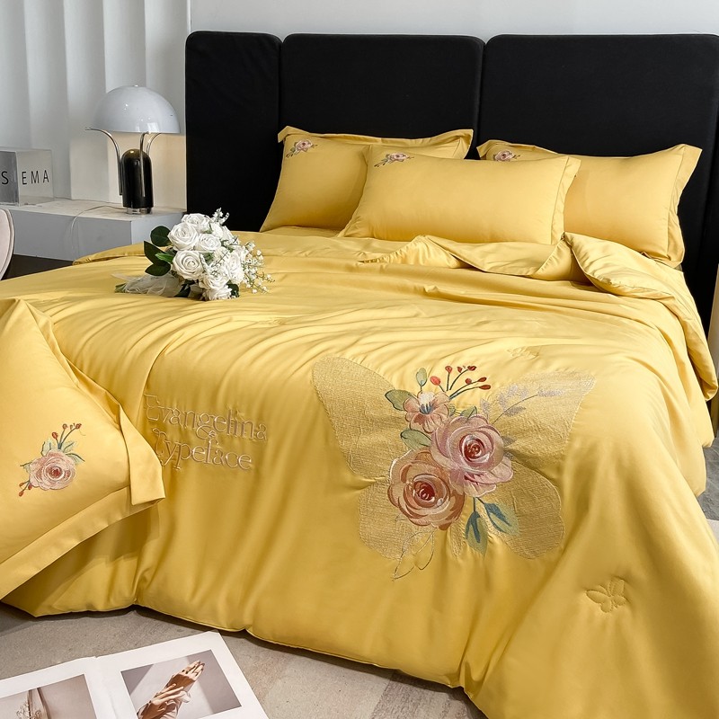 伊人居 2024新款轻奢系列刺绣水洗真丝夏被四件套 蝶恋花-优雅黄