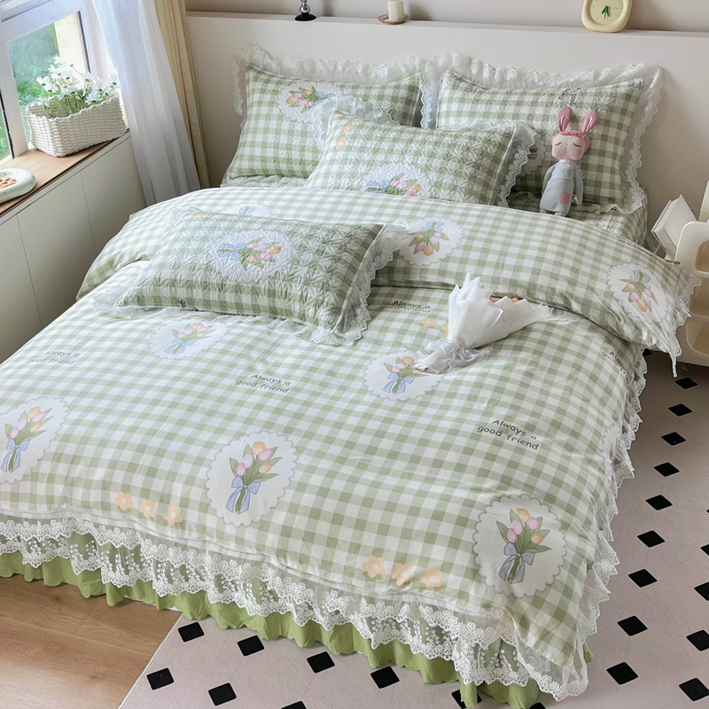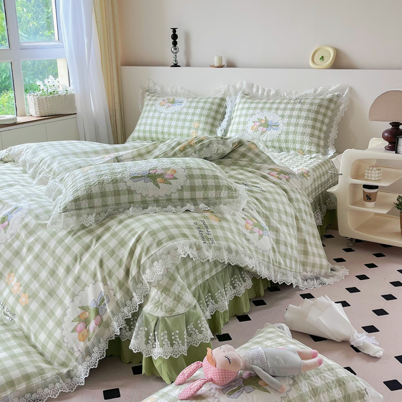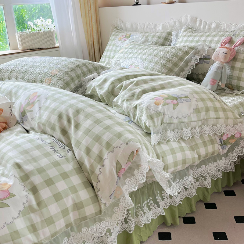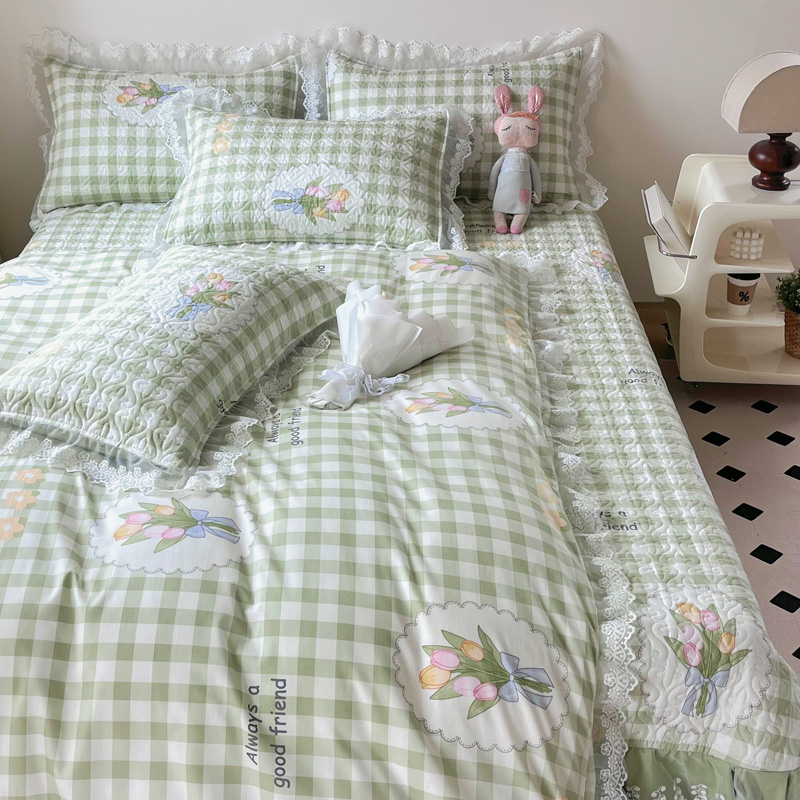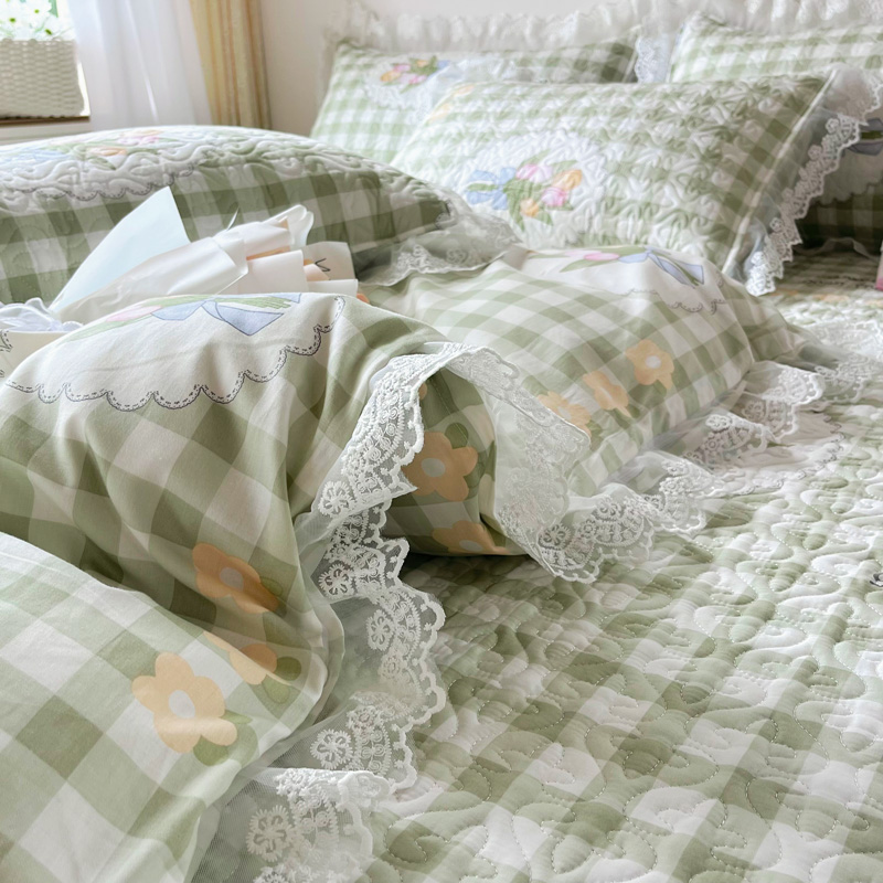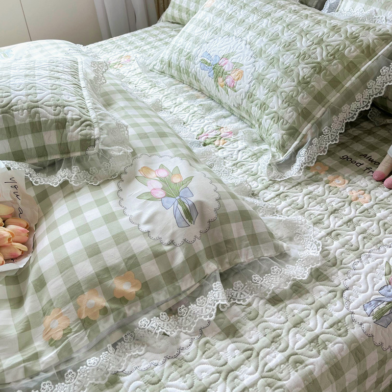 商品名称:添越 2024小清新韩版蕾丝款花边纯棉夹棉床盖三件套全棉茉彩-蕾丝款