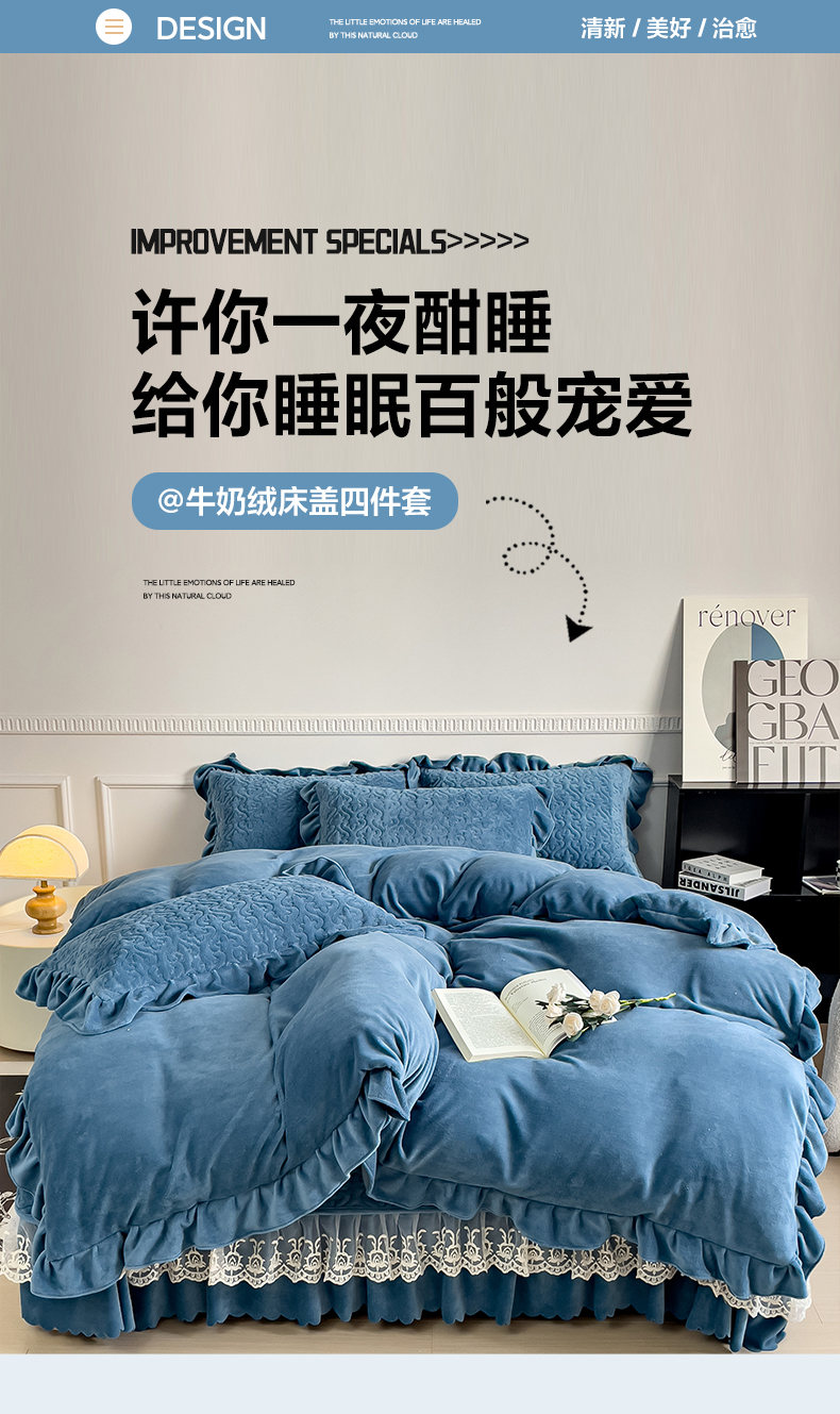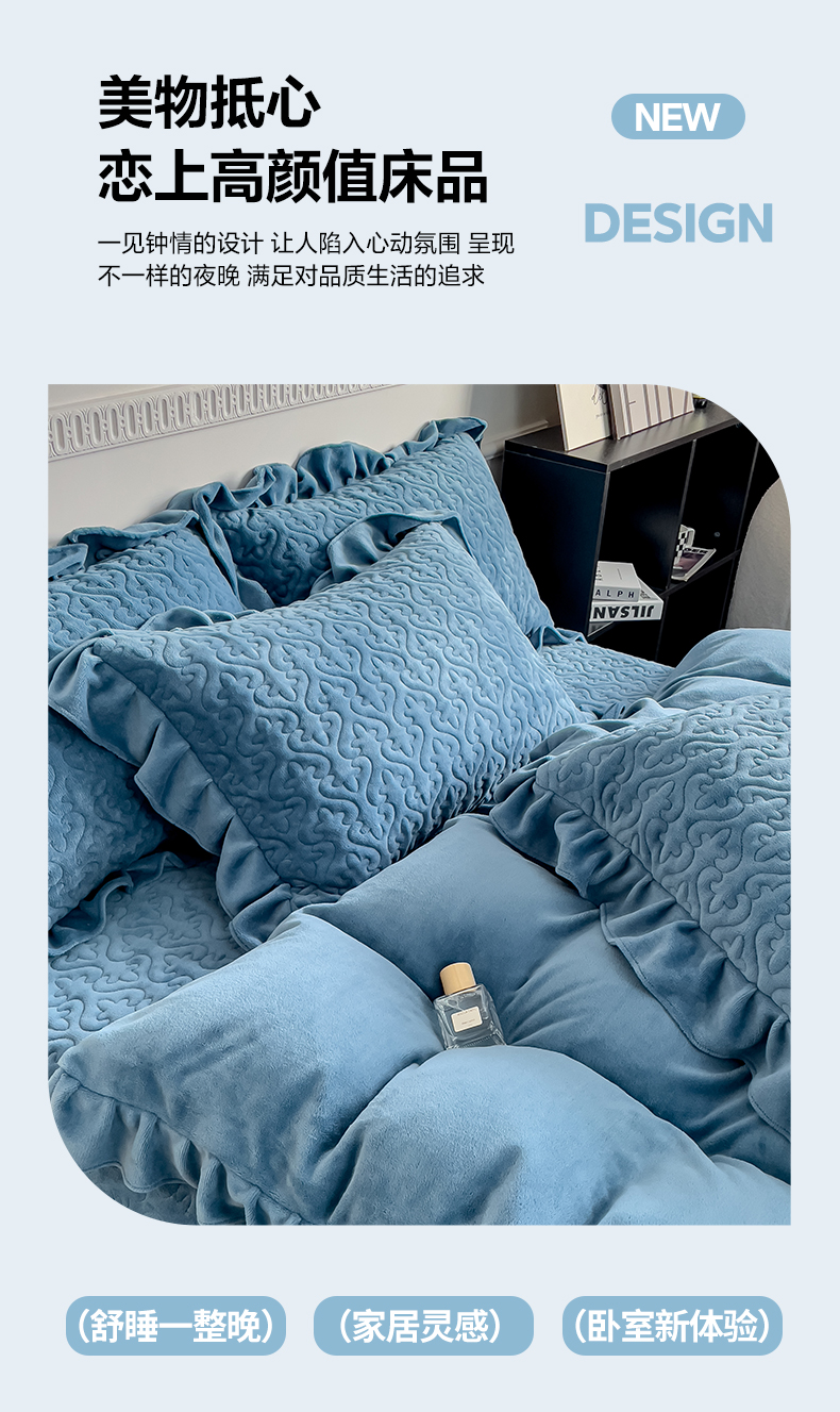 当前位置: 91家纺网 > 商品网购 > 床品套件 > 四件套 > 牛奶绒四件套 > 铠畅家纺 2023新款纯色蕾丝牛奶绒床盖四件套-遇见系列 蔚蓝