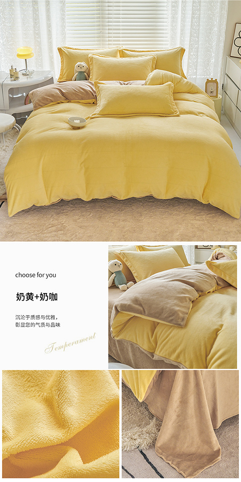 当前位置: 91家纺网 > 商品网购 > 床品套件 > 四件套 > 牛奶绒四件套 > 慕晨纯色牛奶绒法莱绒拼色三四件套单被套 奶黄+奶咖