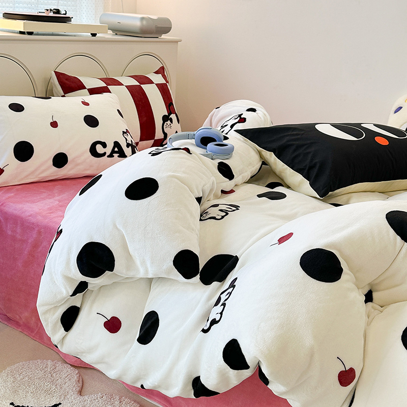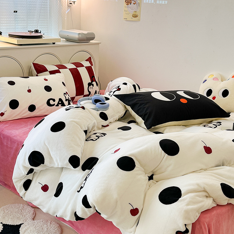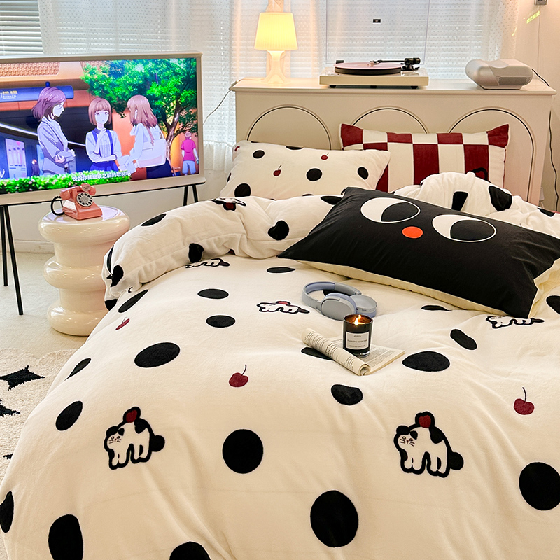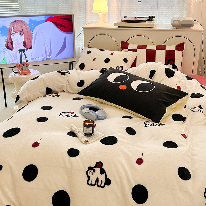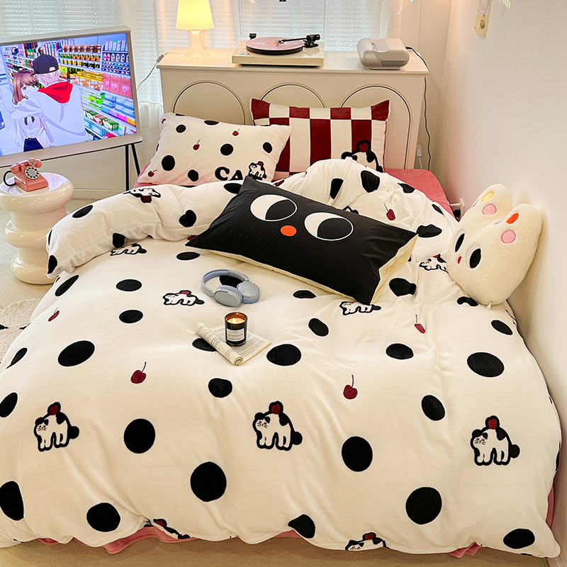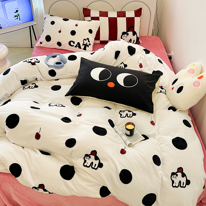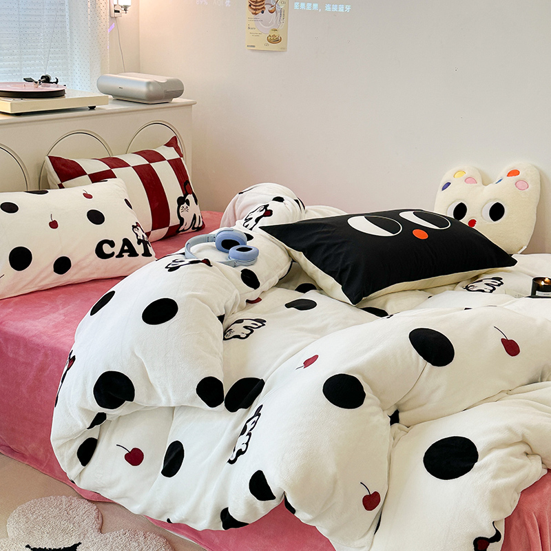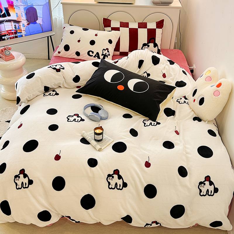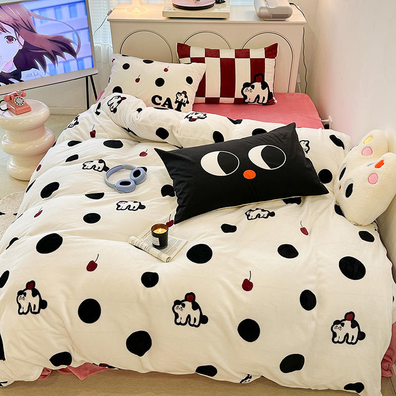 昔可家纺 2023新款大版印花枕套牛奶绒系列四件套 波点猫