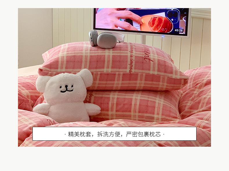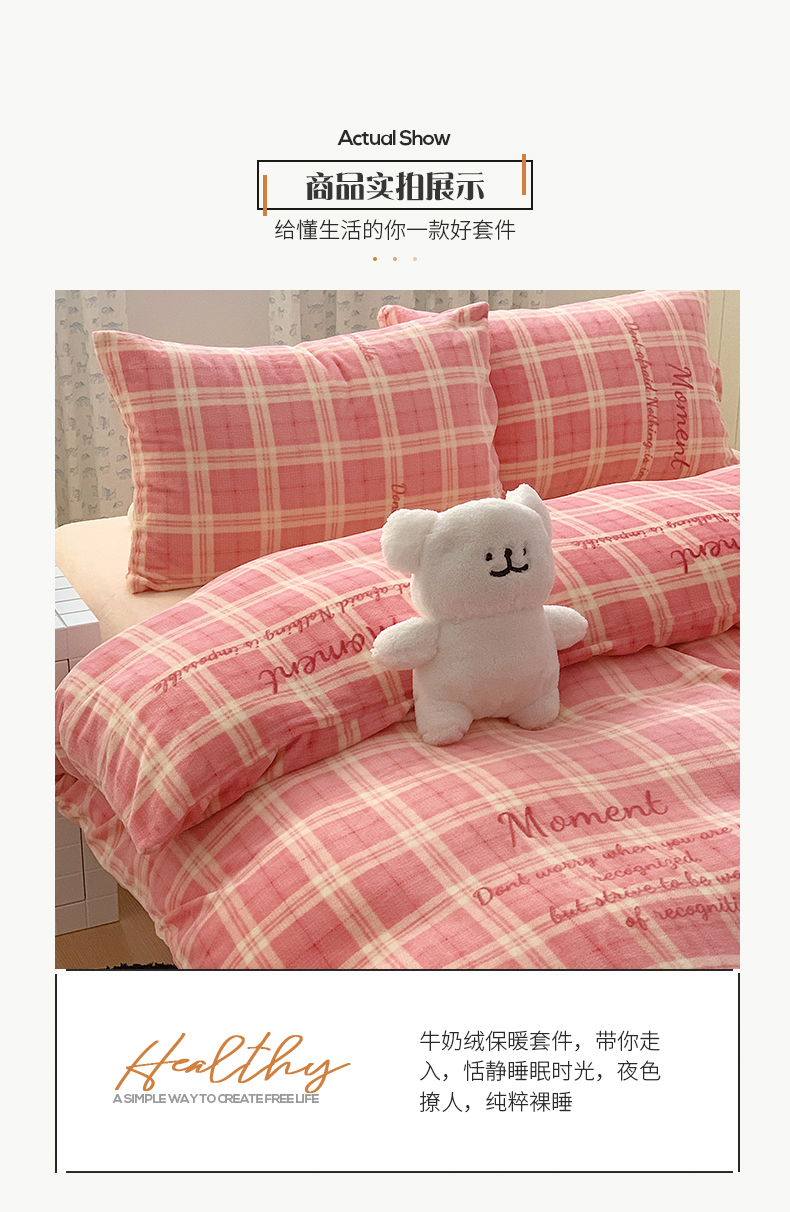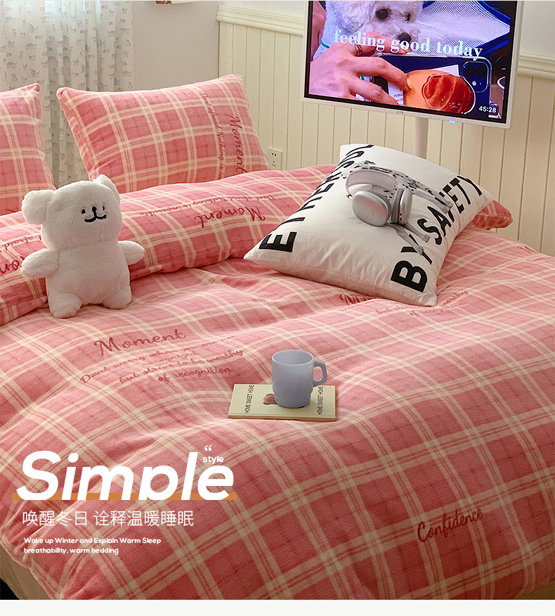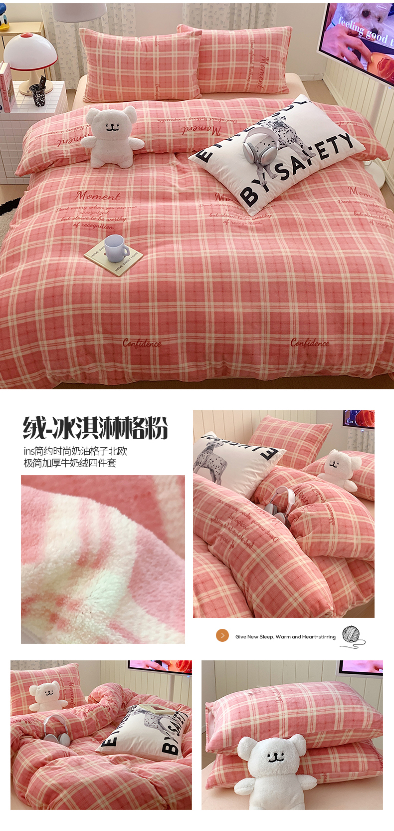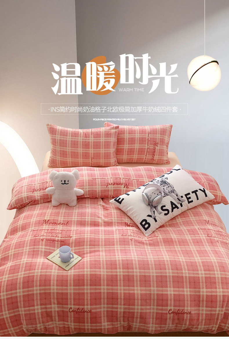 商品名称:桃子家居 2023新款ins简约时尚奶油格子北欧极简加厚牛奶绒四件套 冰淇淋格粉