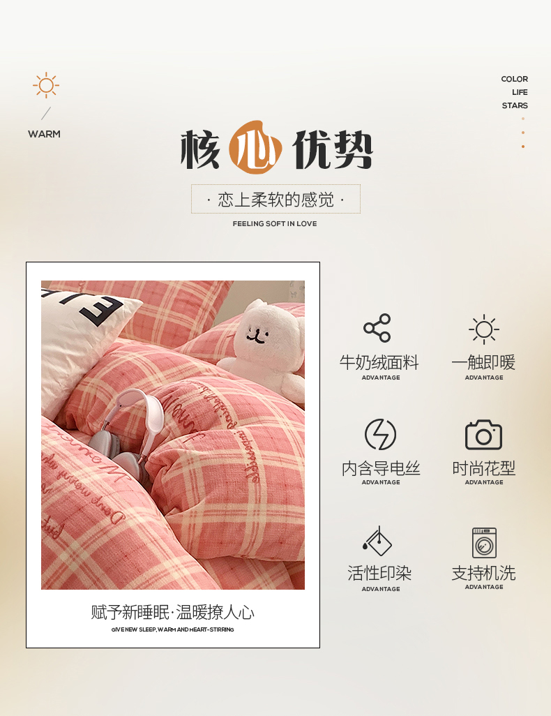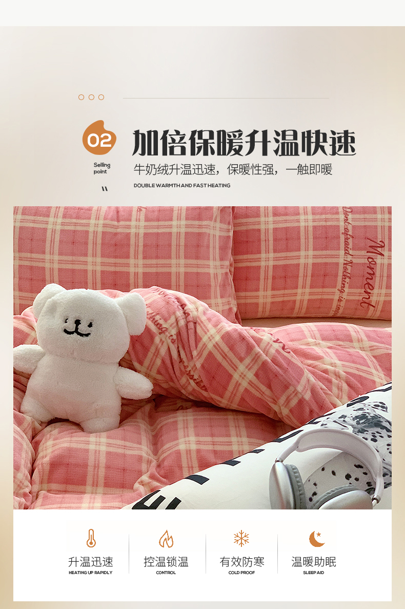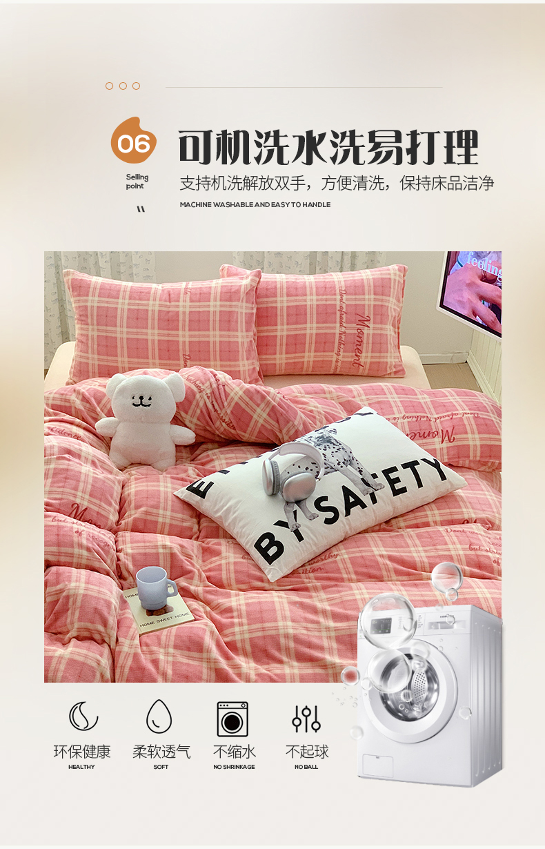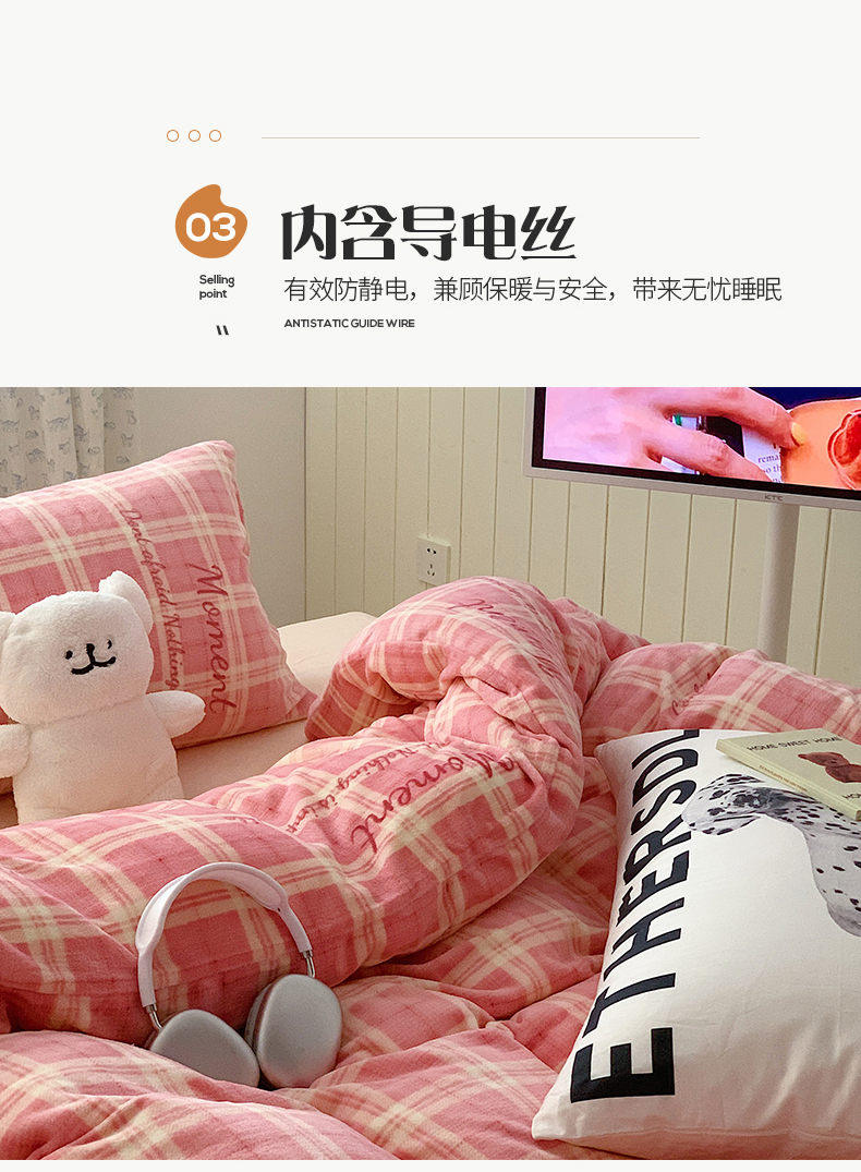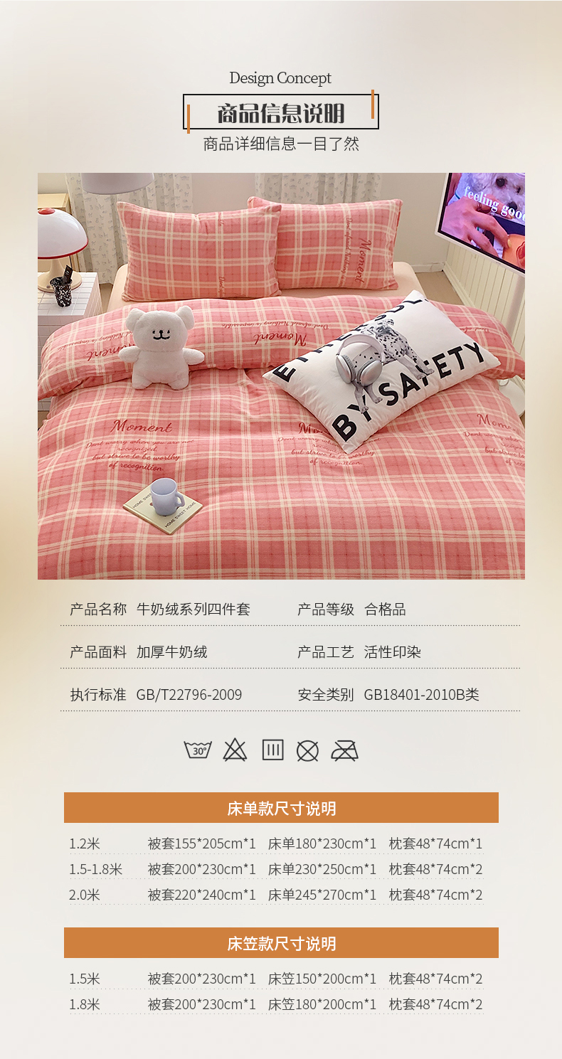 商品名称:桃子家居 2023新款ins简约时尚奶油格子北欧极简加厚牛奶绒四件套 冰淇淋格粉