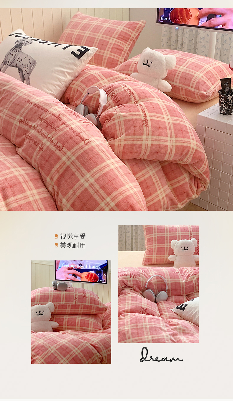 桃子家居 2023新款ins简约时尚奶油格子北欧极简加厚牛奶绒四件套 冰淇淋格粉