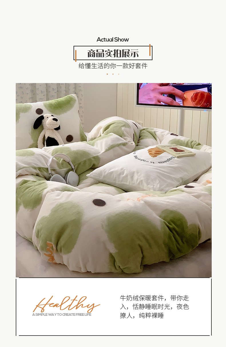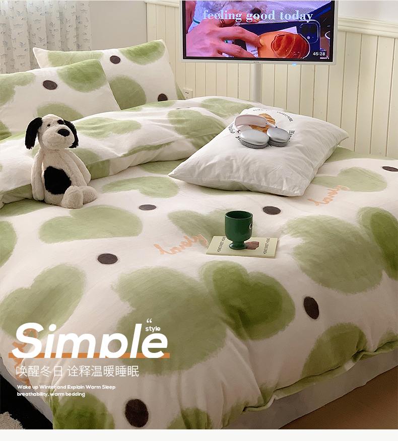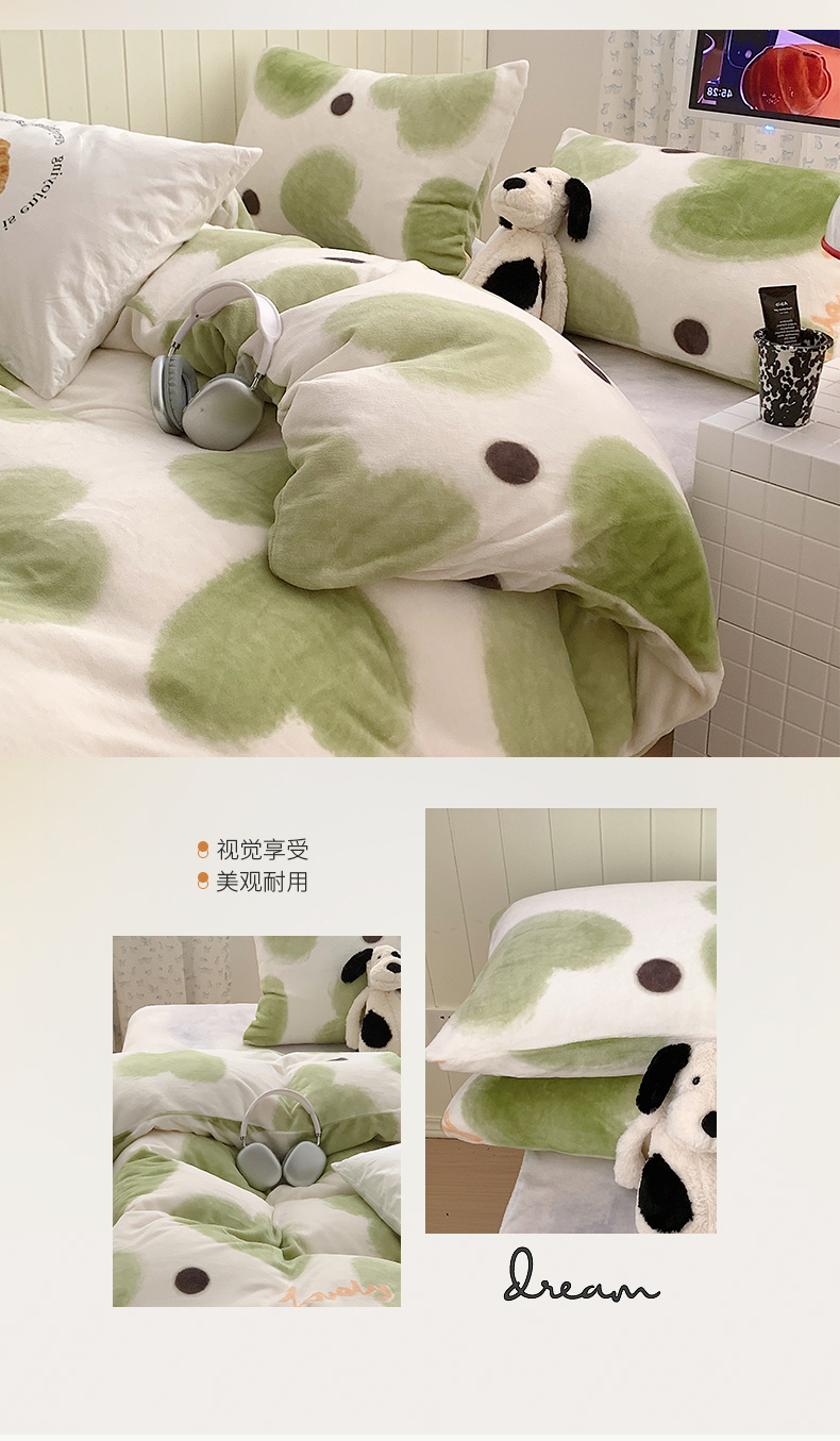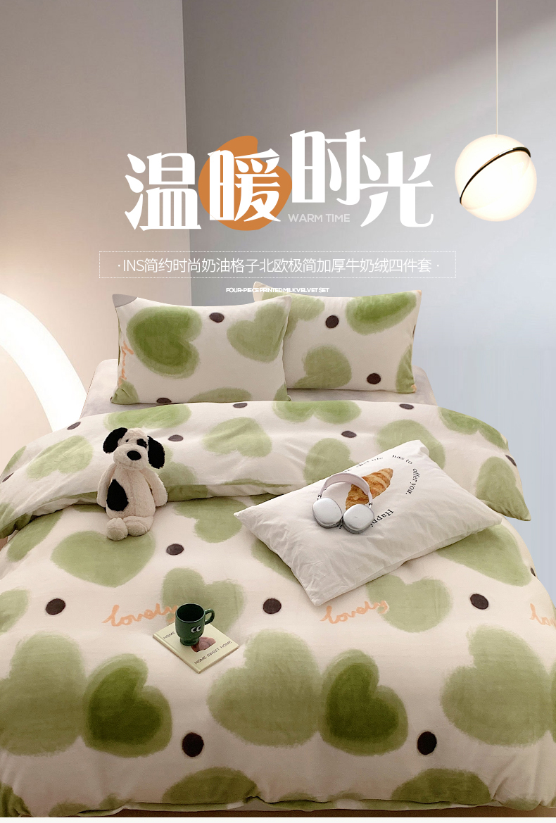 商品名称:桃子家居 2023新款ins简约时尚奶油格子北欧极简加厚牛奶绒四件套 抹茶心语