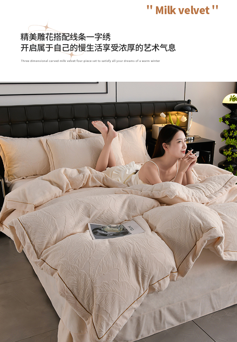 (总)苏迪网销供货 2025新款牛奶绒四件套A类高克重全消光雕花一字绣工艺款,银杏叶-香芋紫,银杏叶-湖小兰,银杏叶-豆绿,银杏叶-粉玉,百合-大红,百合-奶咖,百合-香芋紫,芭蕉叶-豆绿,芭蕉叶-粉玉,芭蕉叶-高级灰,芭蕉叶-湖小蓝,芭蕉叶-米白,芭蕉叶-香芋紫