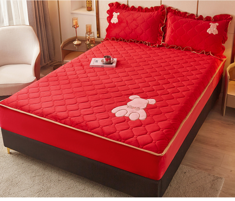 (总)屹成家纺2025新款水晶绒夹棉绗缝蕾丝床裙三件套(塞纳河畔)床裙单件起售价不低于105元,大红,豆沙,翡翠绿,粉玉,橄榄绿,蔚蓝,银灰