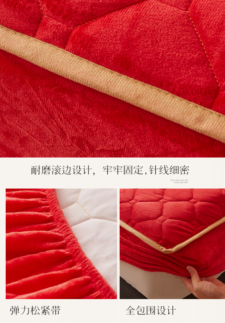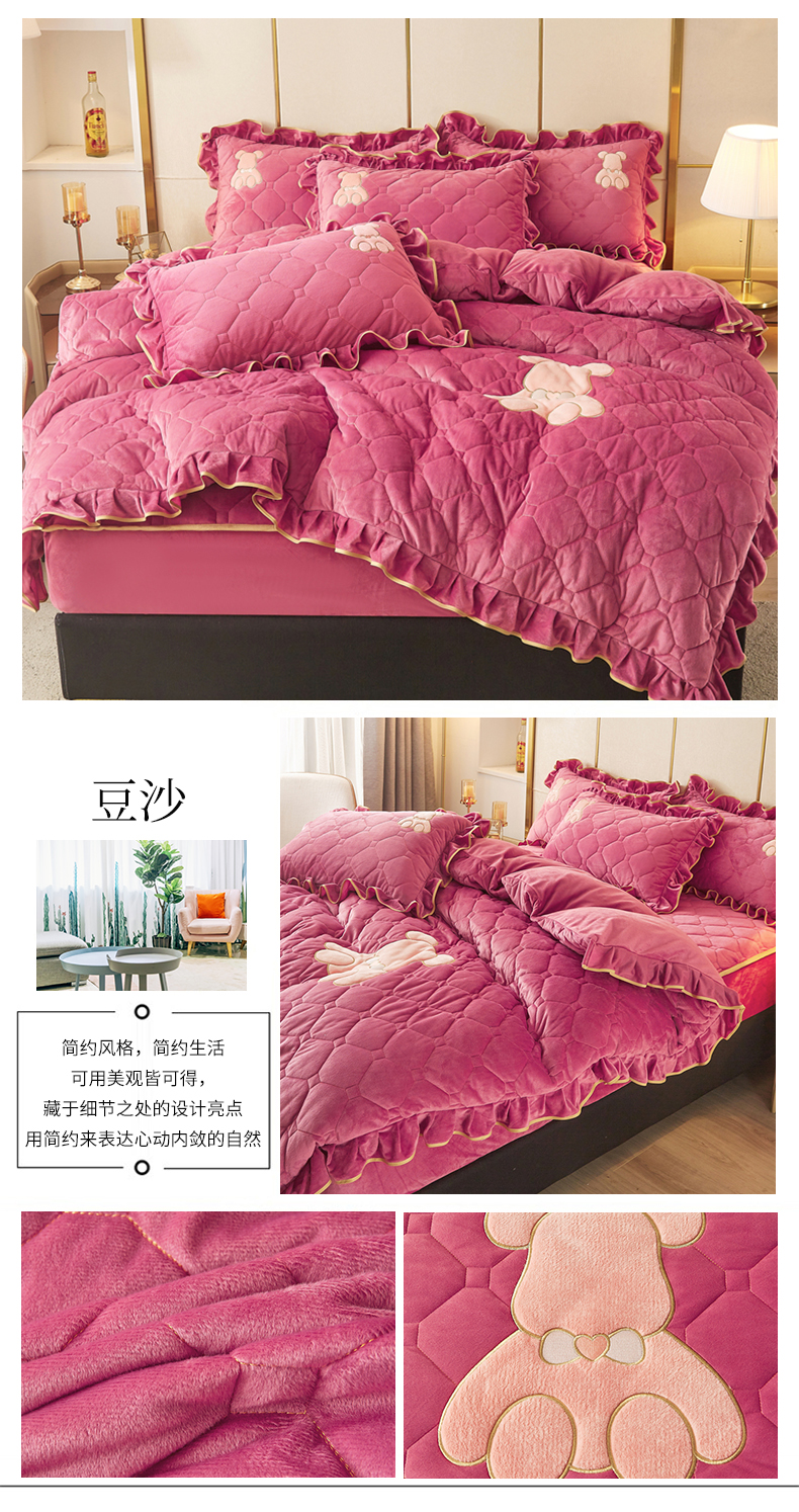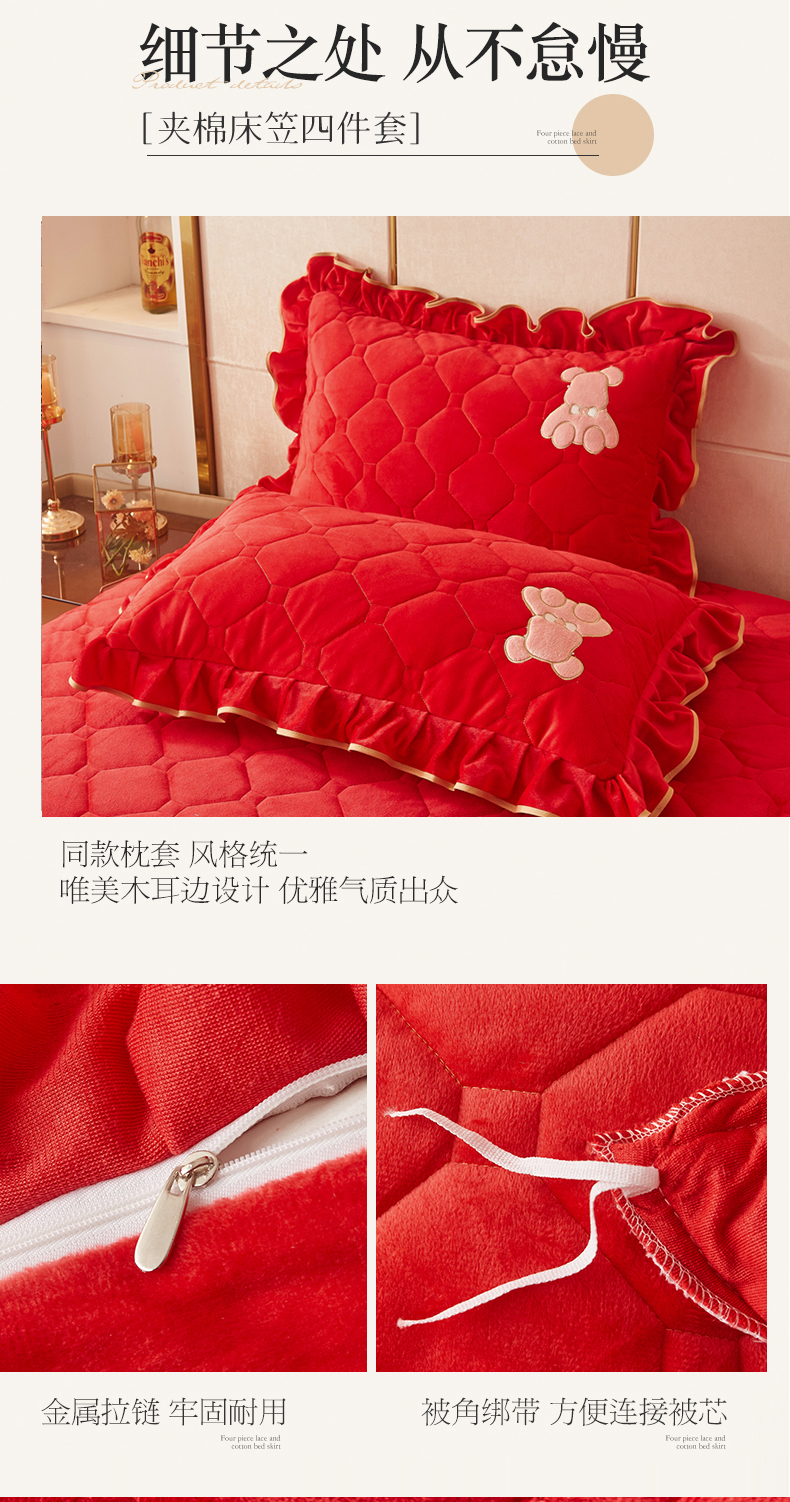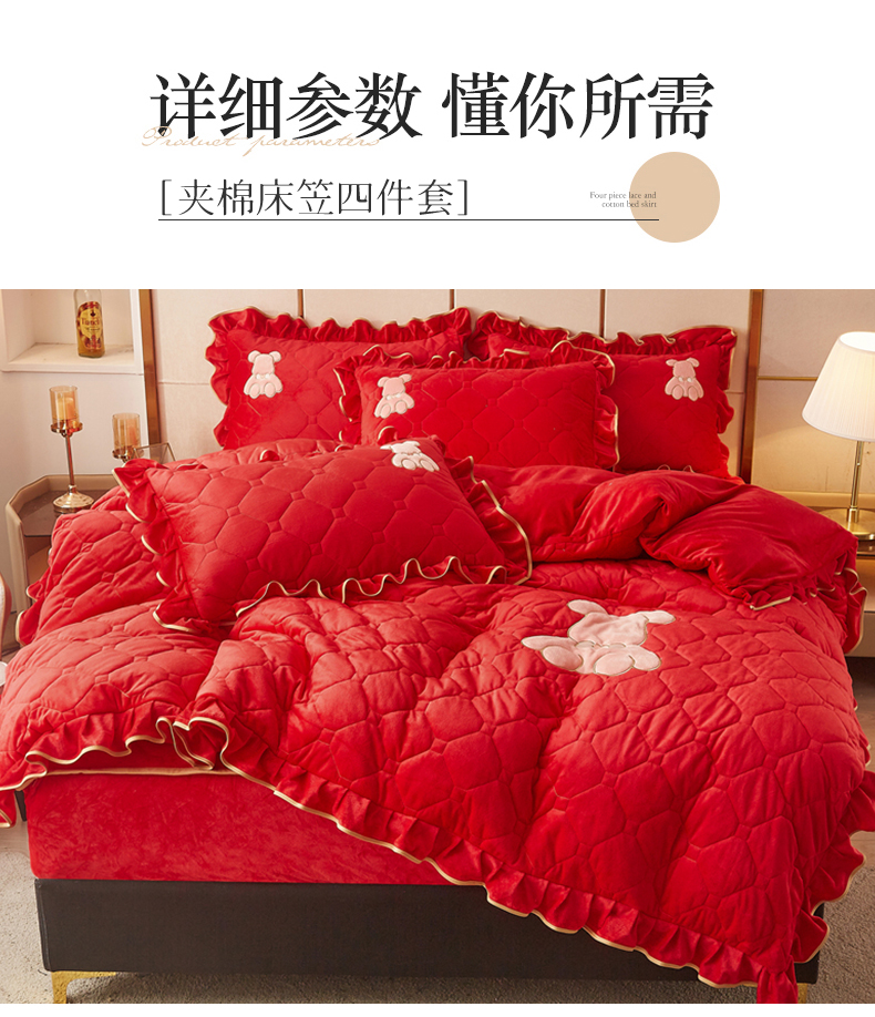 (总)屹成家纺2025新款水晶绒夹棉绗缝床裙四件套(塞纳河畔)四件套起售价不低于230元,大红,豆沙,翡翠绿,粉玉,橄榄绿,蔚蓝,银灰