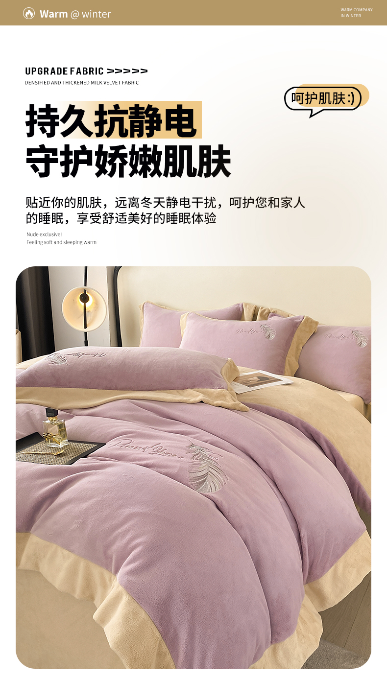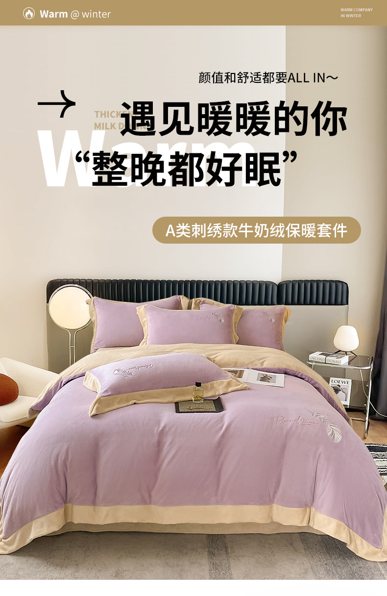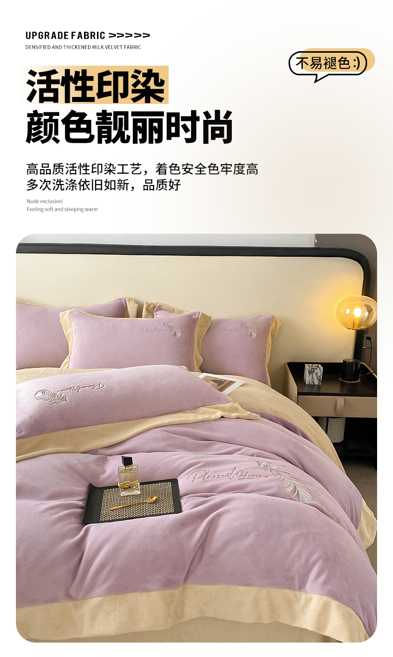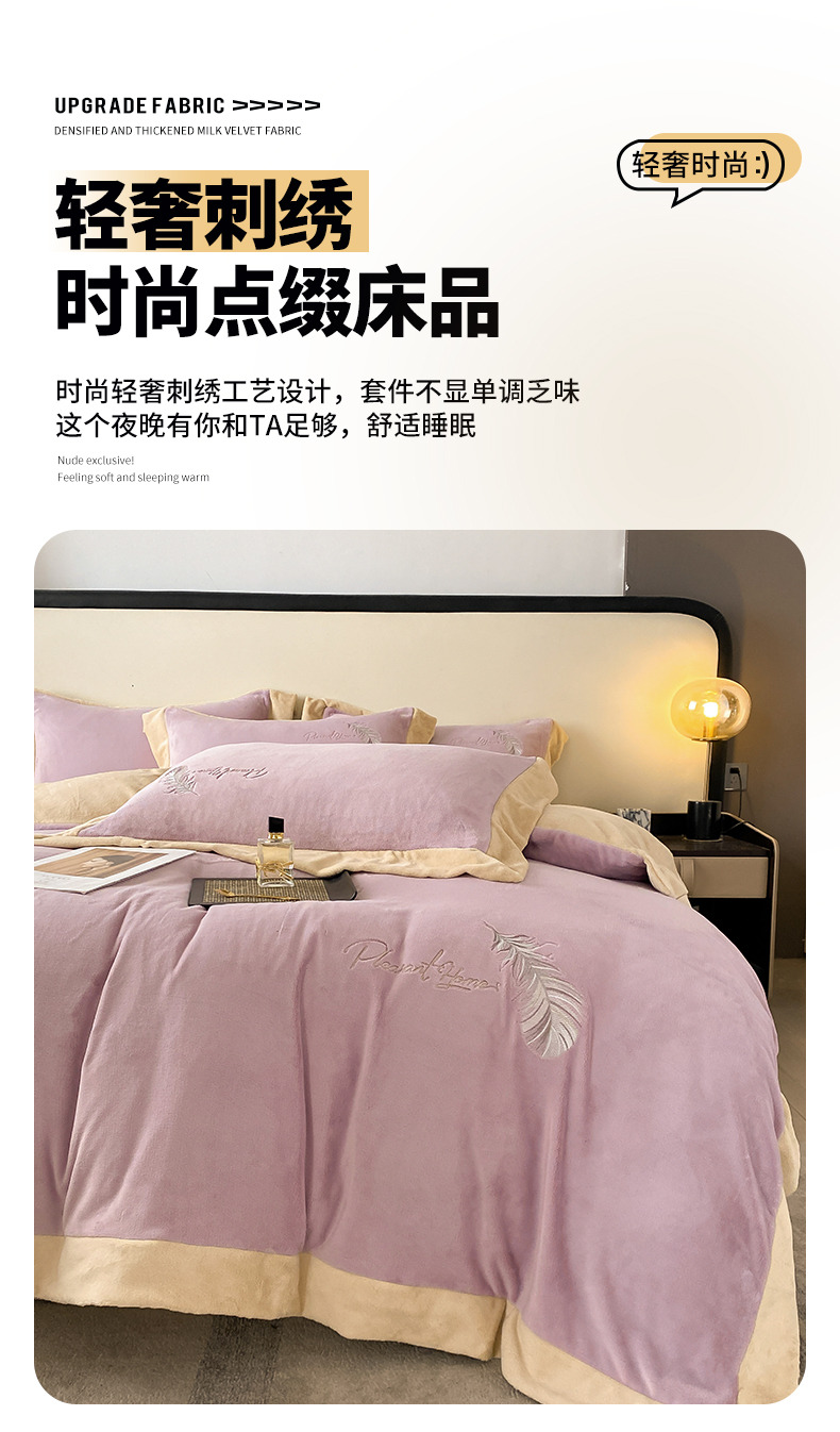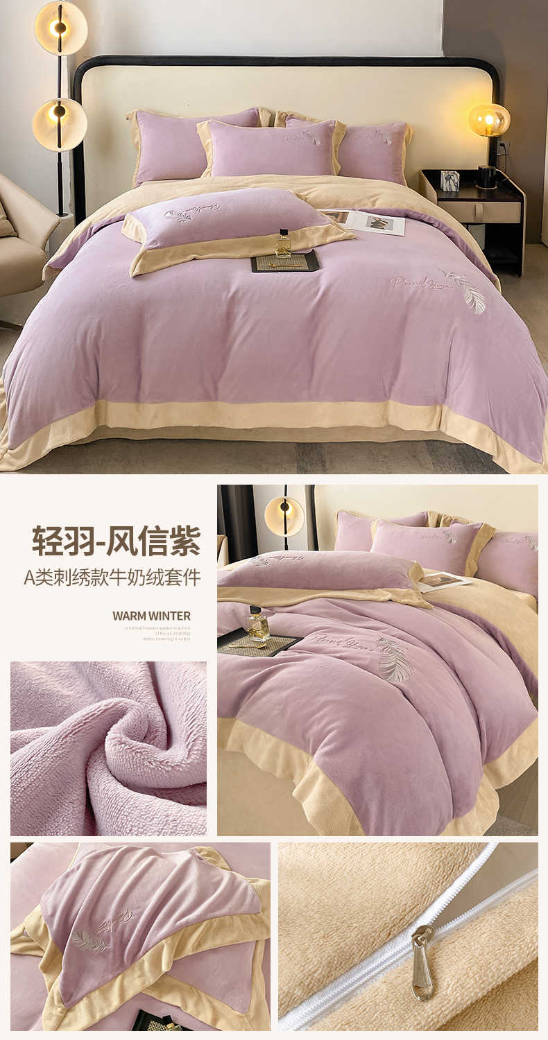 商品名称:露梦家纺 2025新款加厚保暖牛奶绒刺绣款四件套-轻羽(风格二) 轻羽-风信紫