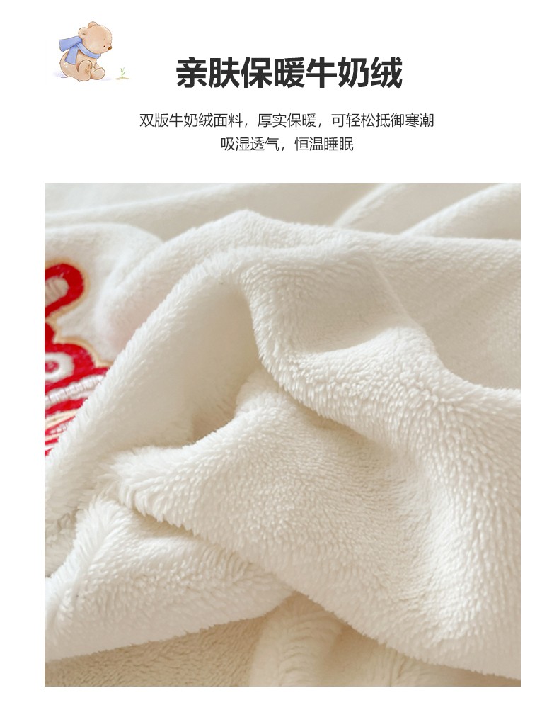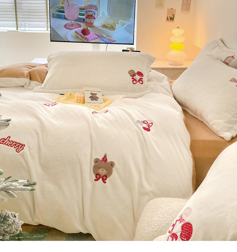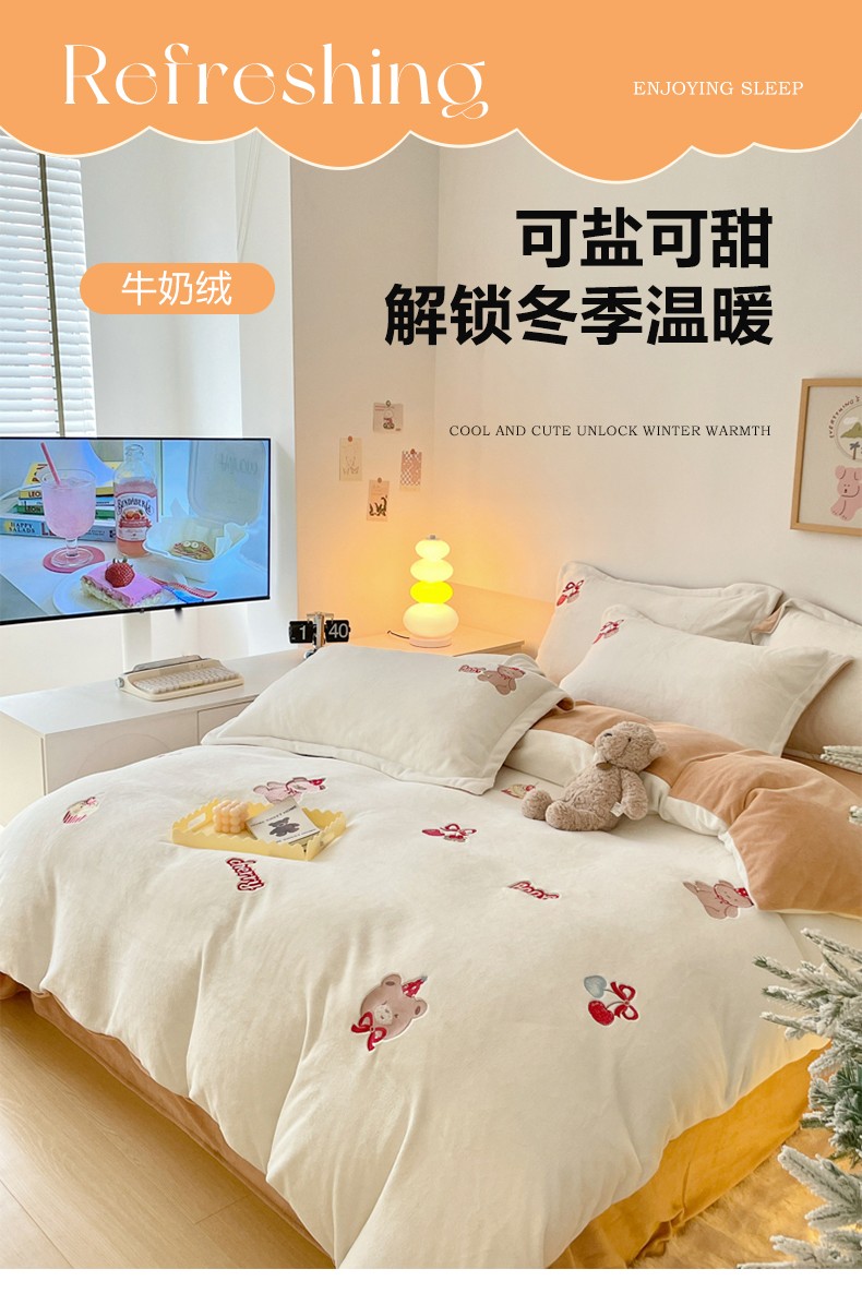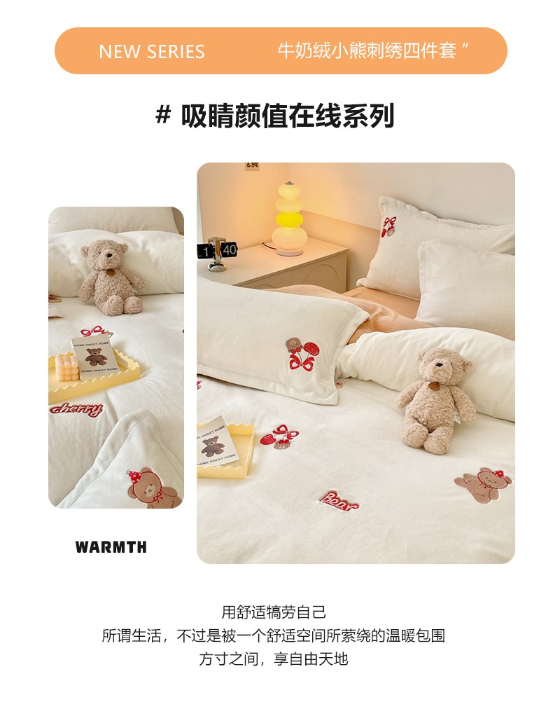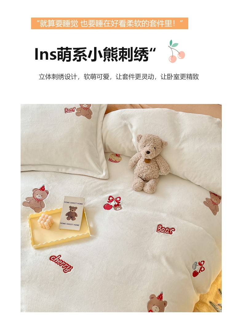 23直播新款秋冬高克重刺绣牛奶绒四件套小熊系列提供买家秀 小熊米黄双拼