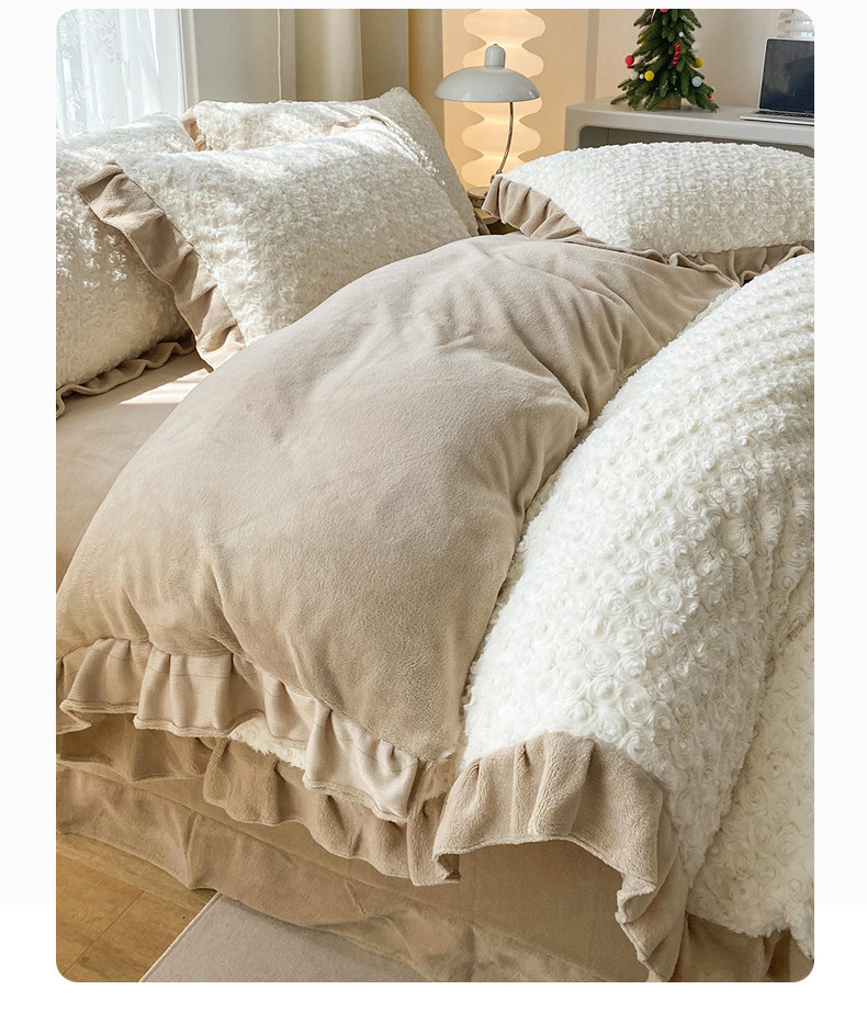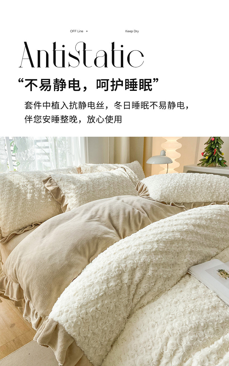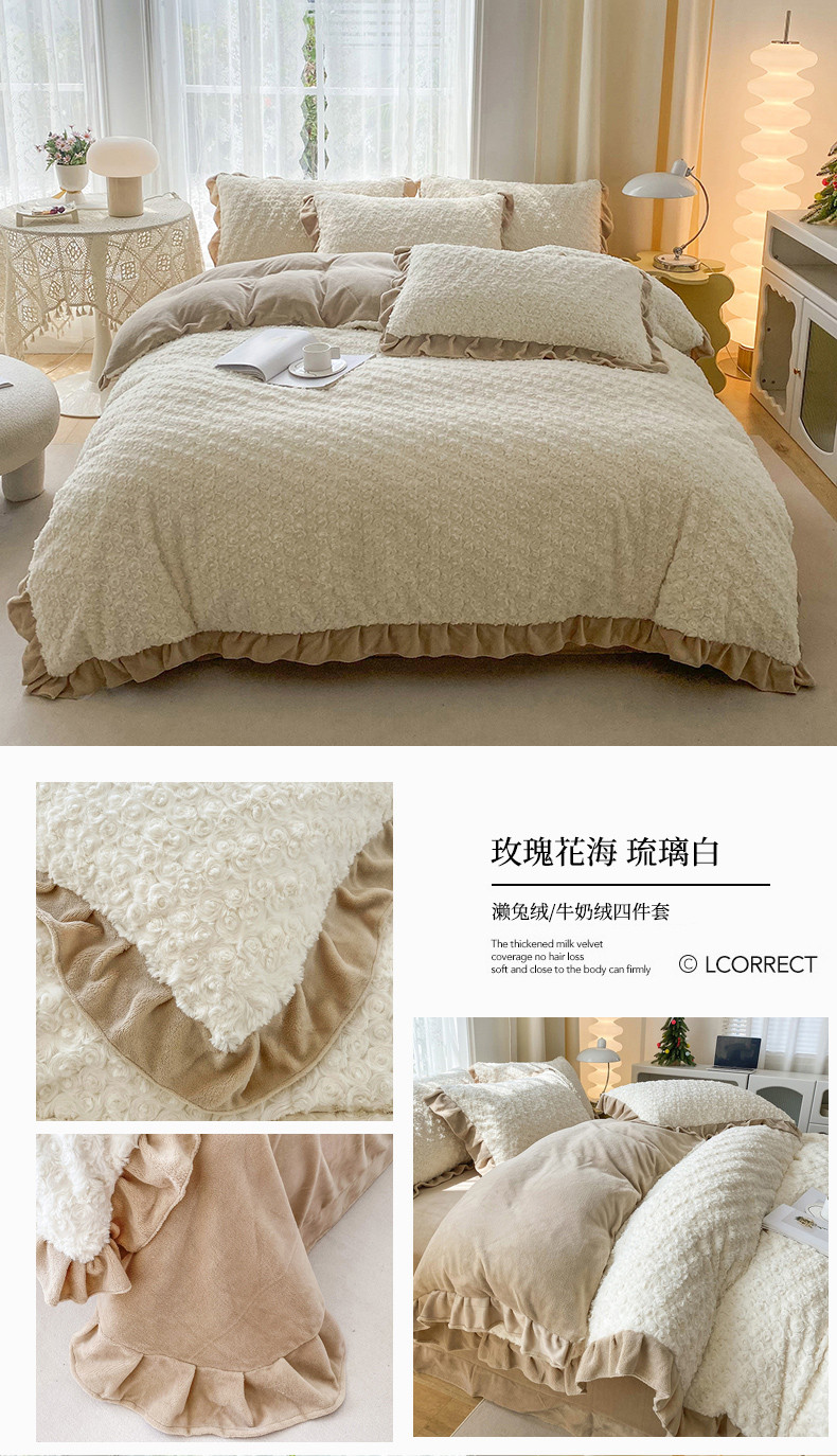 商品名称:小主驾到直播新款兔兔绒牛奶绒花边款四件套-玫瑰花海 玫瑰花海 琉璃白