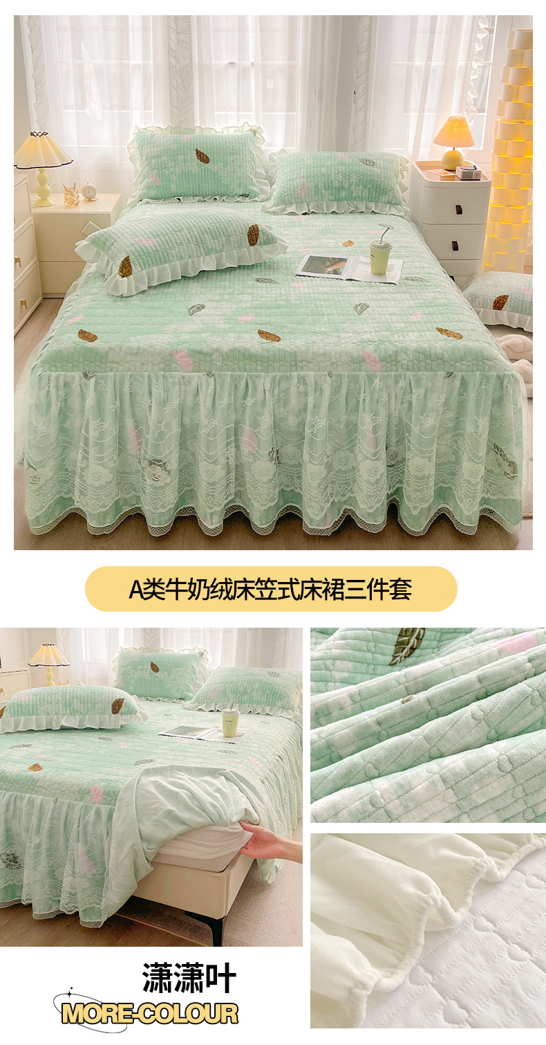 宜凡家纺 2023新款牛奶绒印花夹棉被套床笠式床裙三件套 潇潇叶