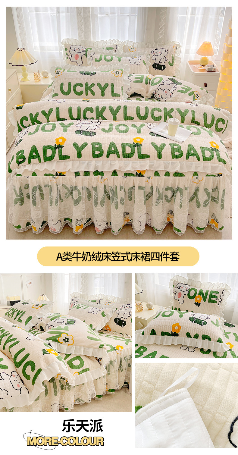 当前位置: 91家纺网 > 商品网购 > 床品套件 > 四件套 > 牛奶绒四件套 > 宜凡家纺 2023新款牛奶绒印花夹棉被套床笠式床裙四件套 乐天派