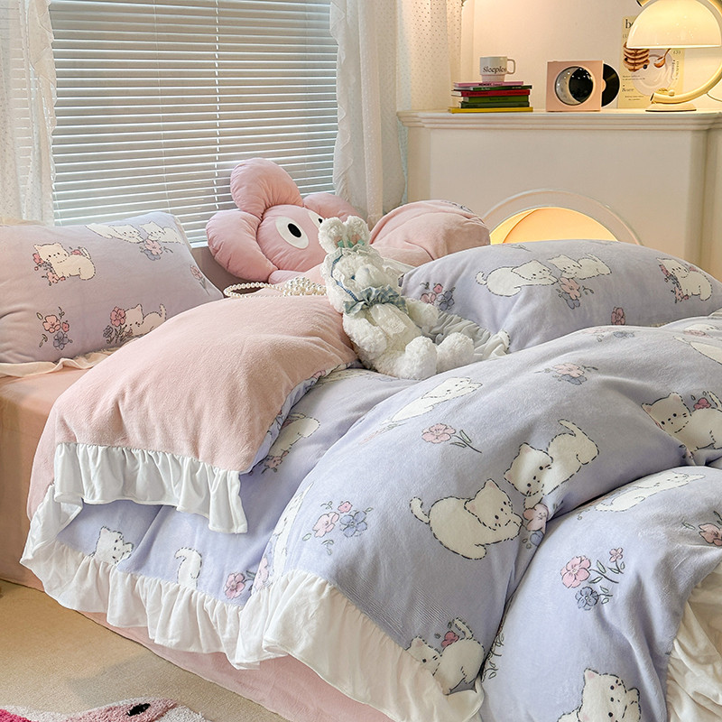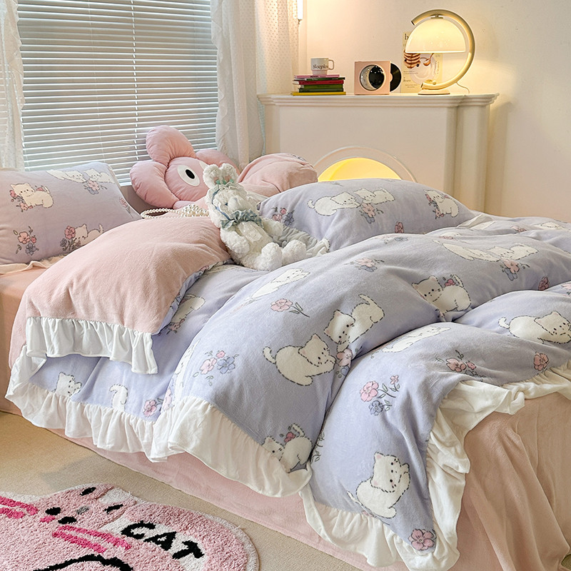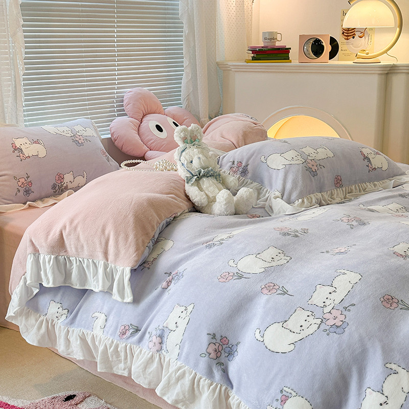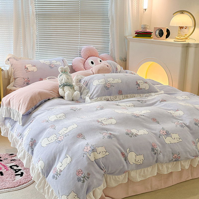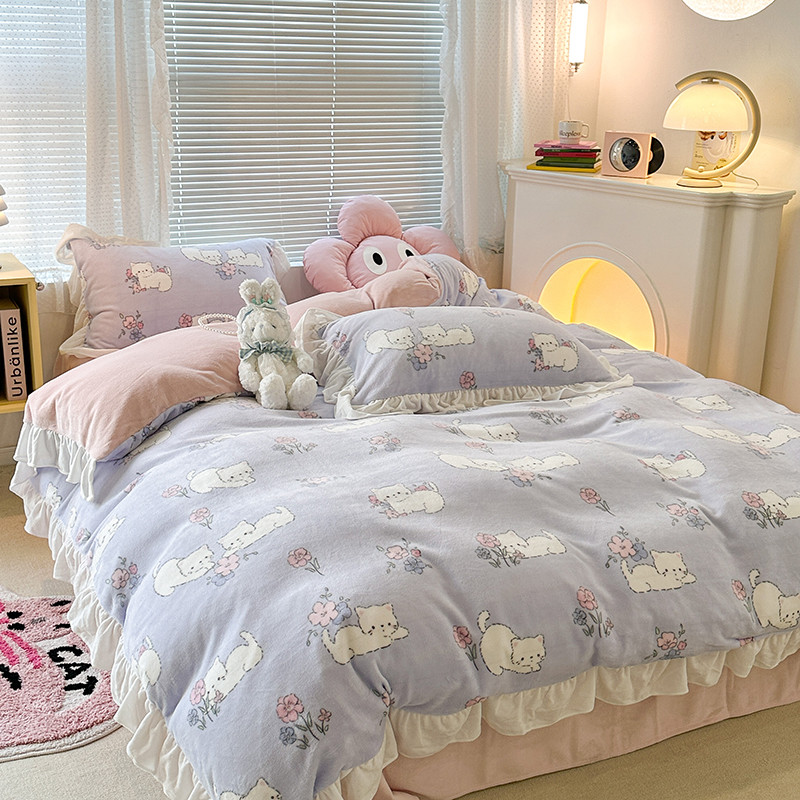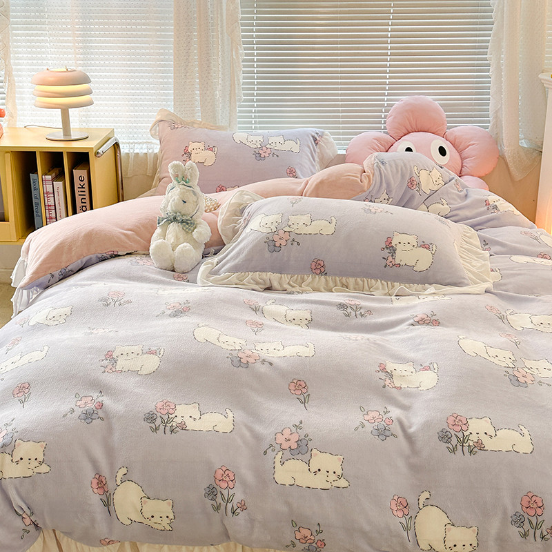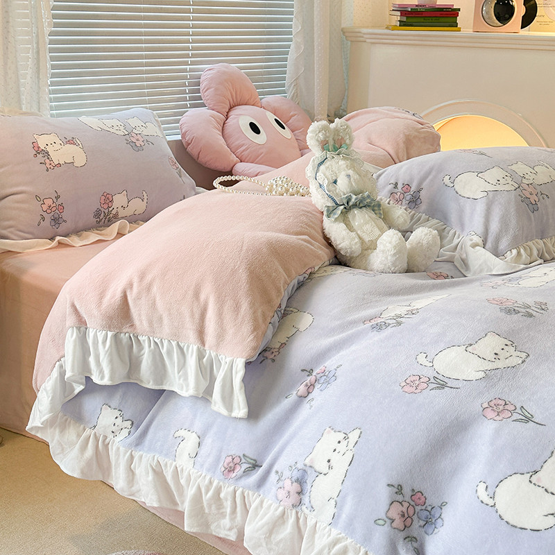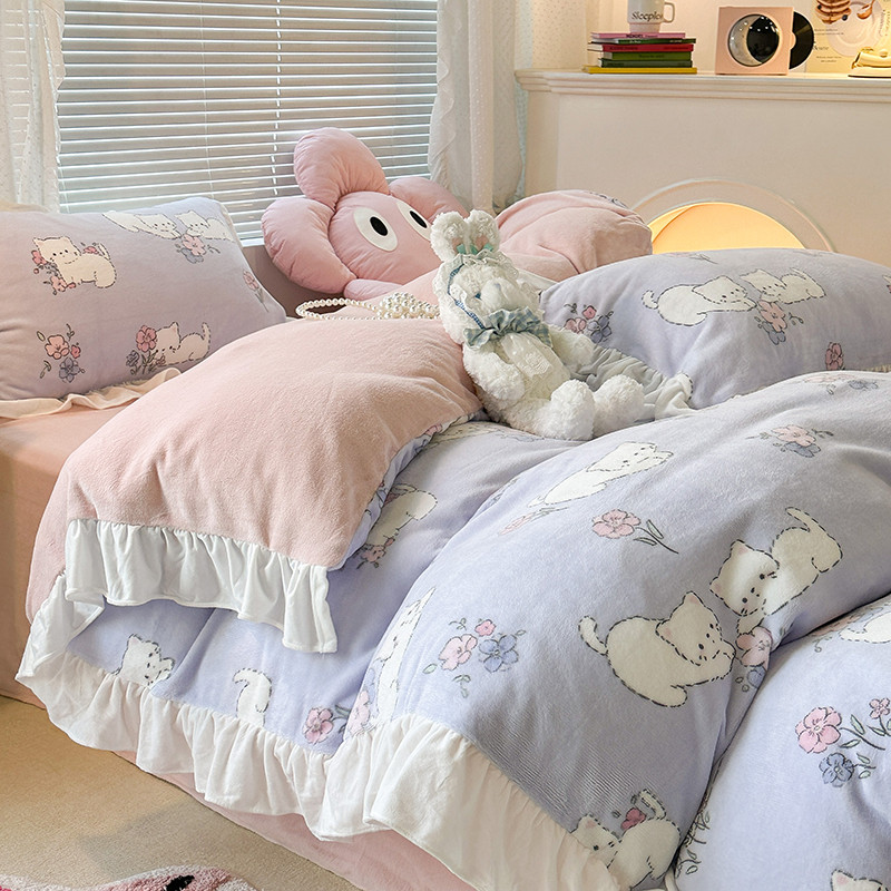 昔可 2023新款韩系ins花边款牛奶绒四件套 花花小猫咪