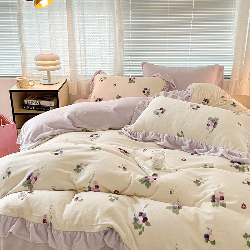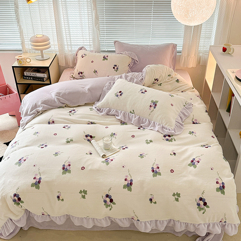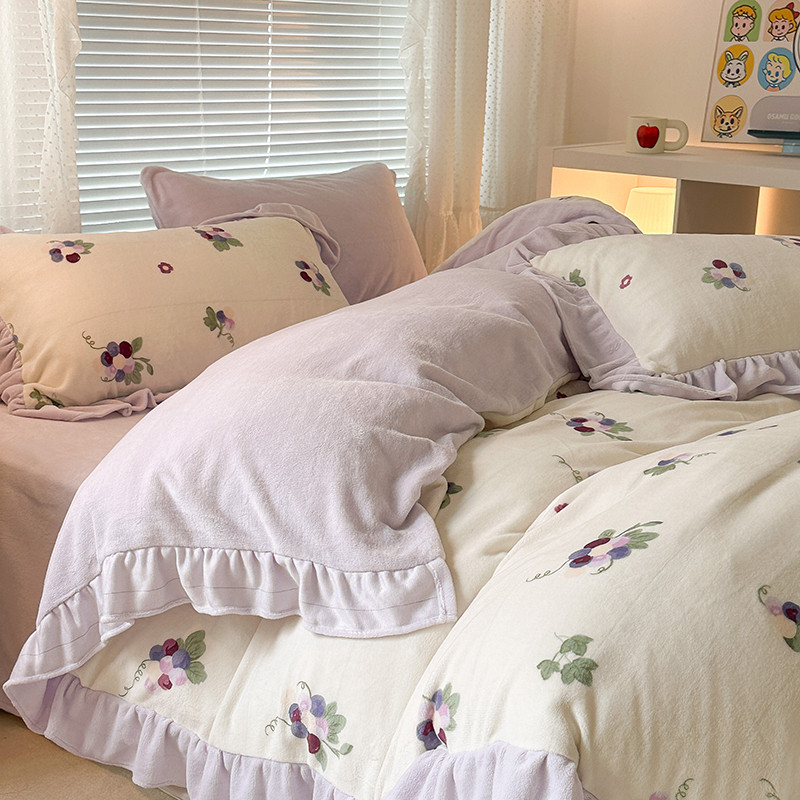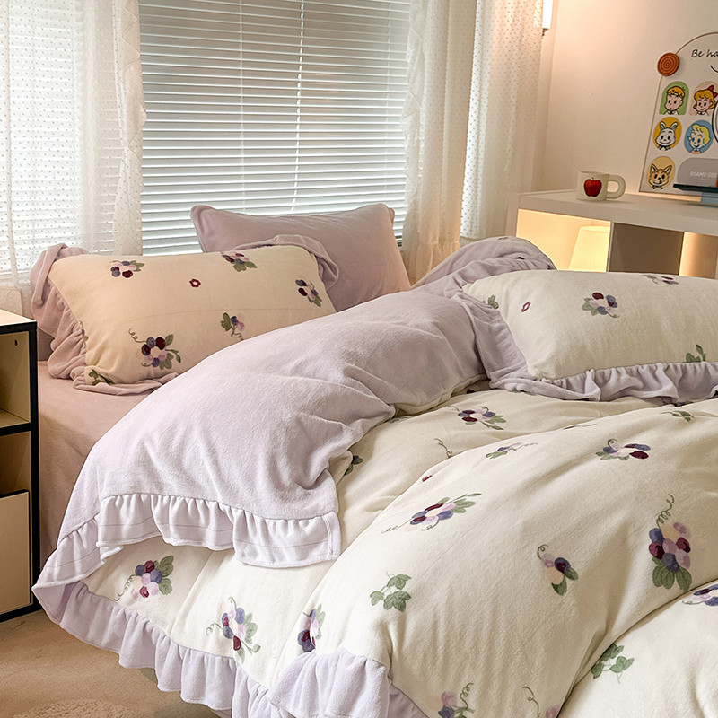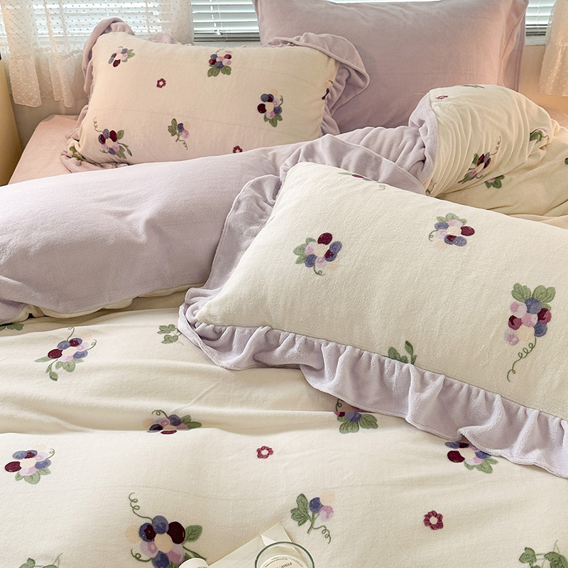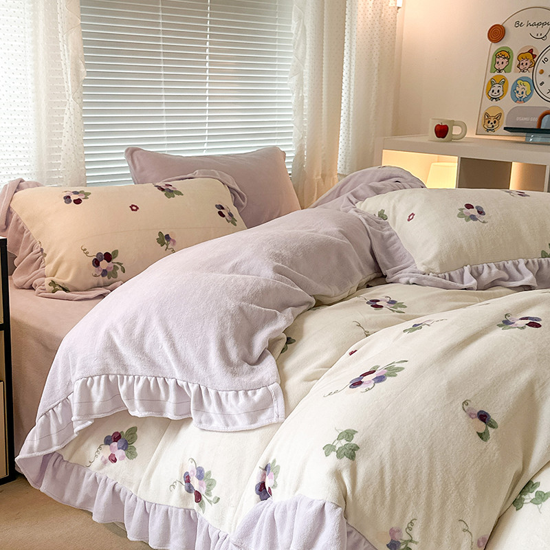 昔可 2023新款韩系ins花边款牛奶绒四件套 紫色葡萄