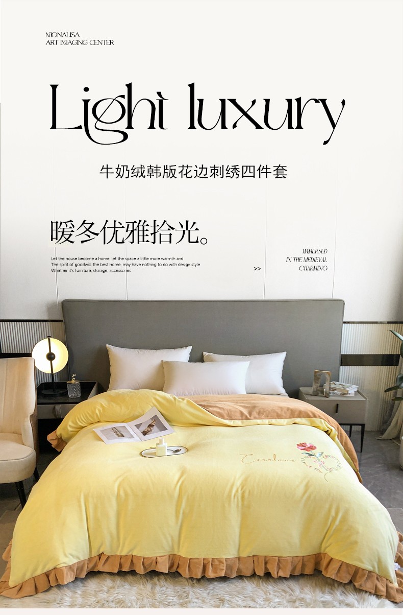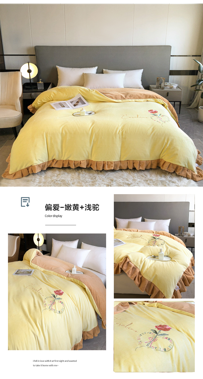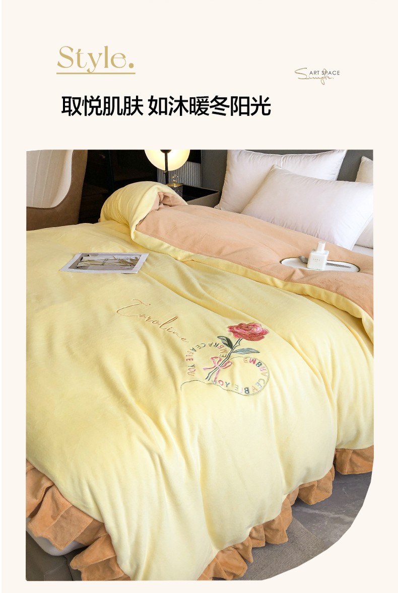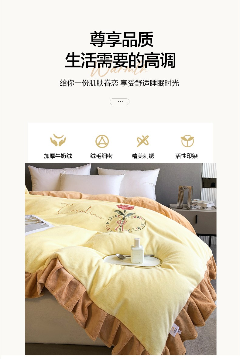 商品名称:7v 2023新款牛奶绒韩版花边刺绣被套法兰绒宝宝绒兔绒单被套 偏爱-嫩黄+浅驼