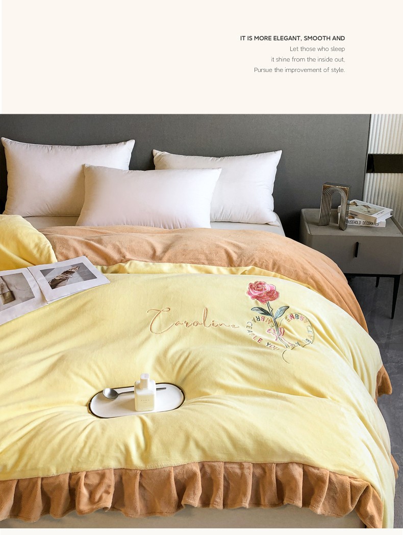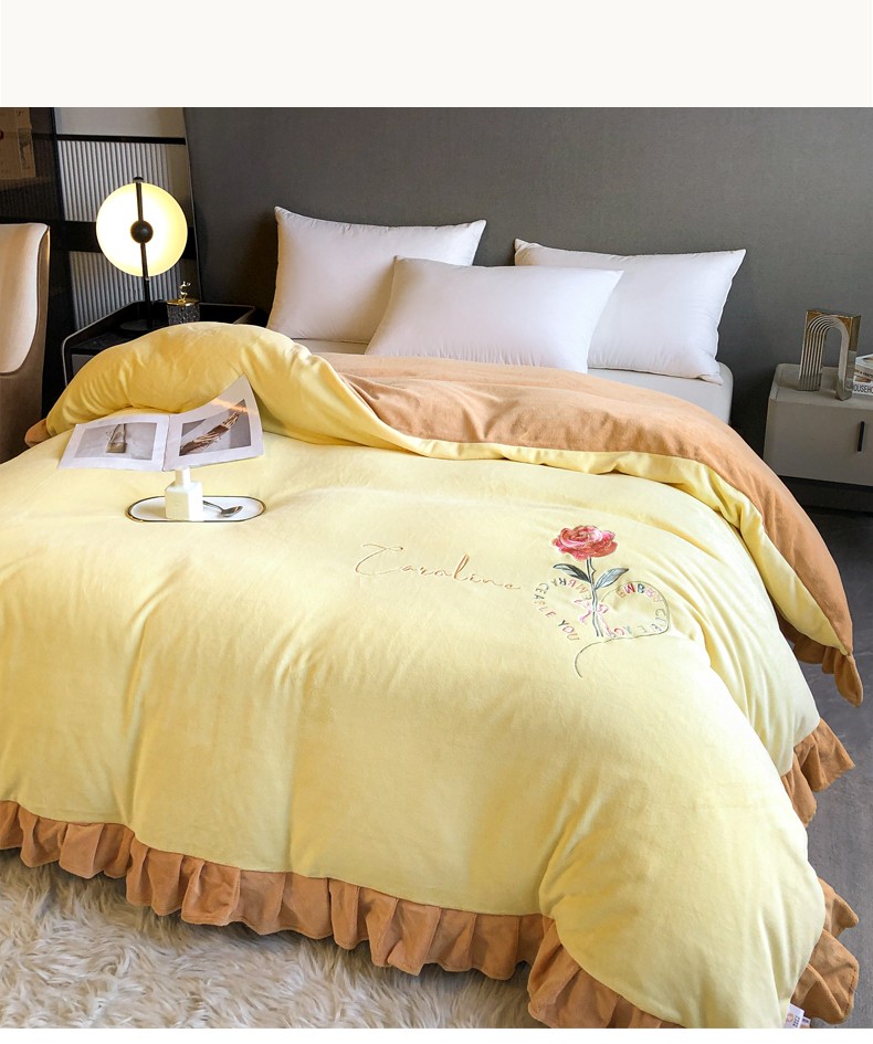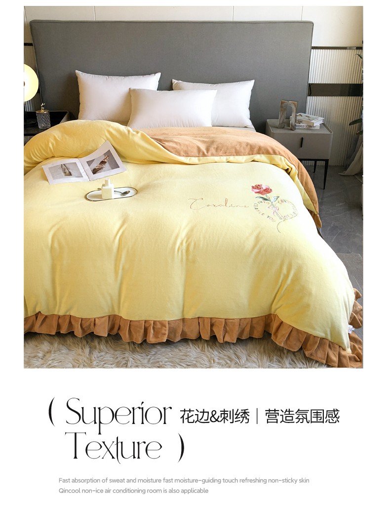 7v 2023新款牛奶绒韩版花边刺绣被套法兰绒宝宝绒兔绒单被套 偏爱-嫩黄+浅驼