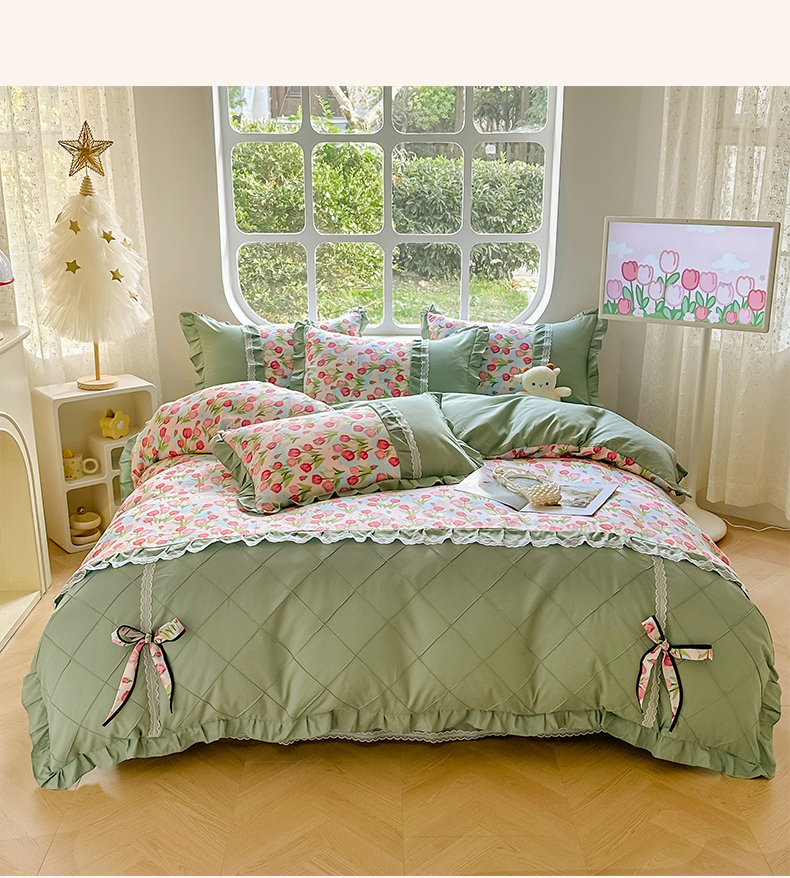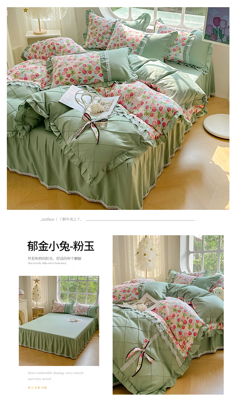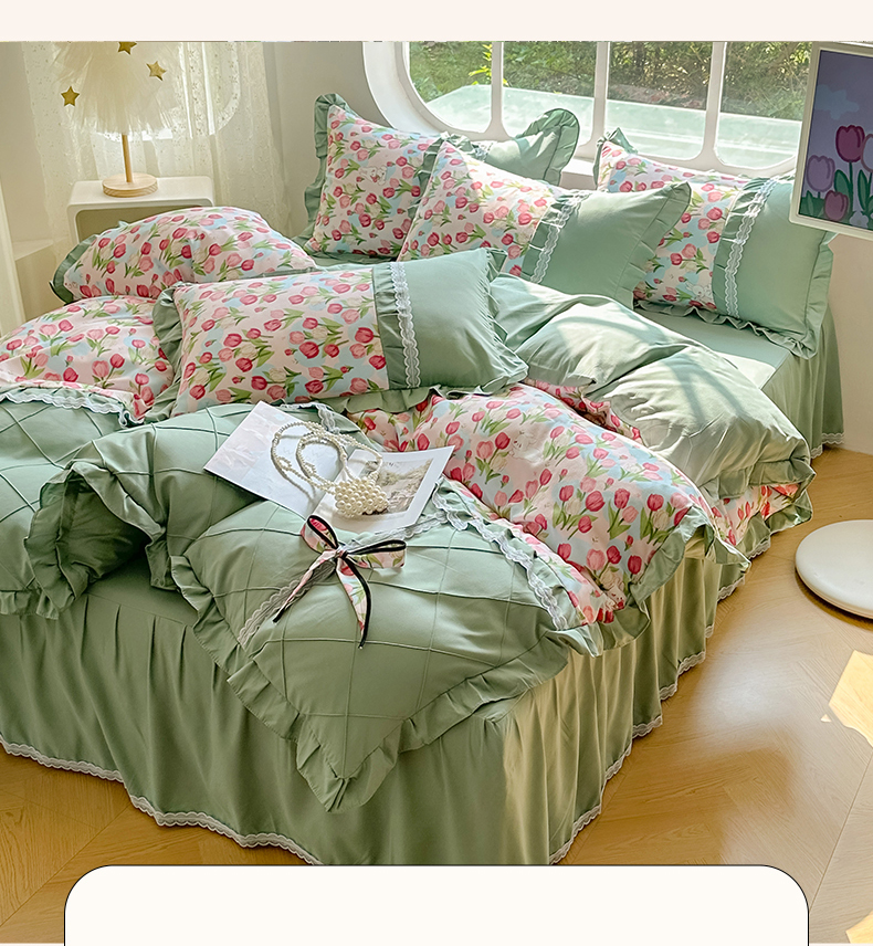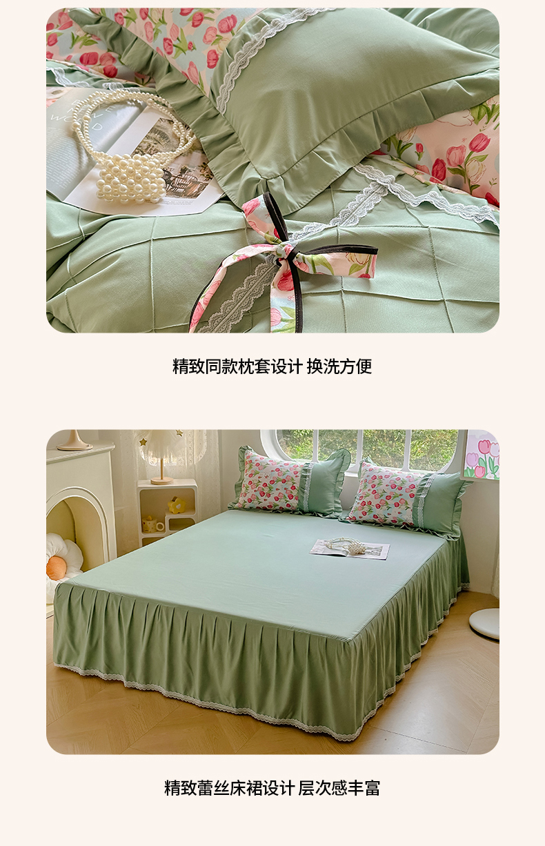 金米诺 新款韩版花边水洗棉泡泡纱四件套公主条四件套 褶皱-浅绿,褶皱-浅绿