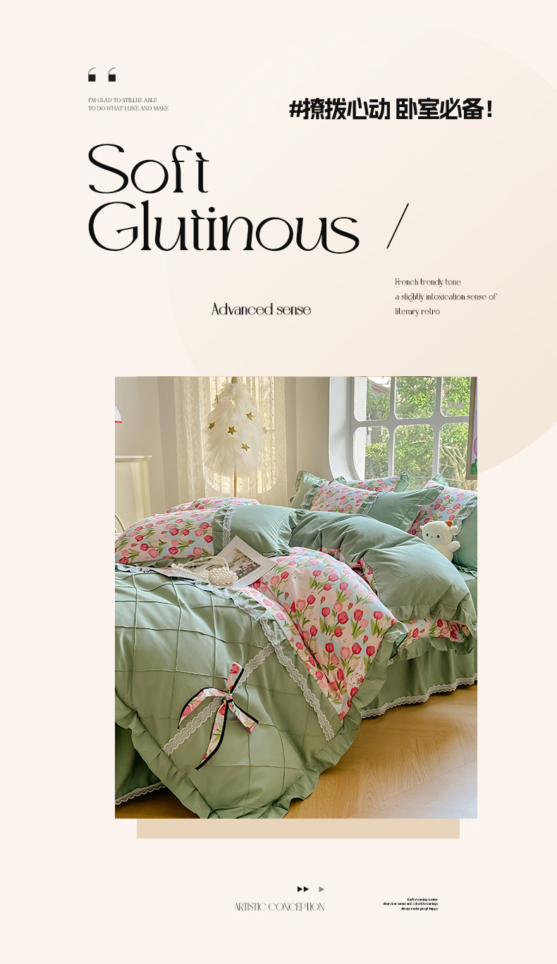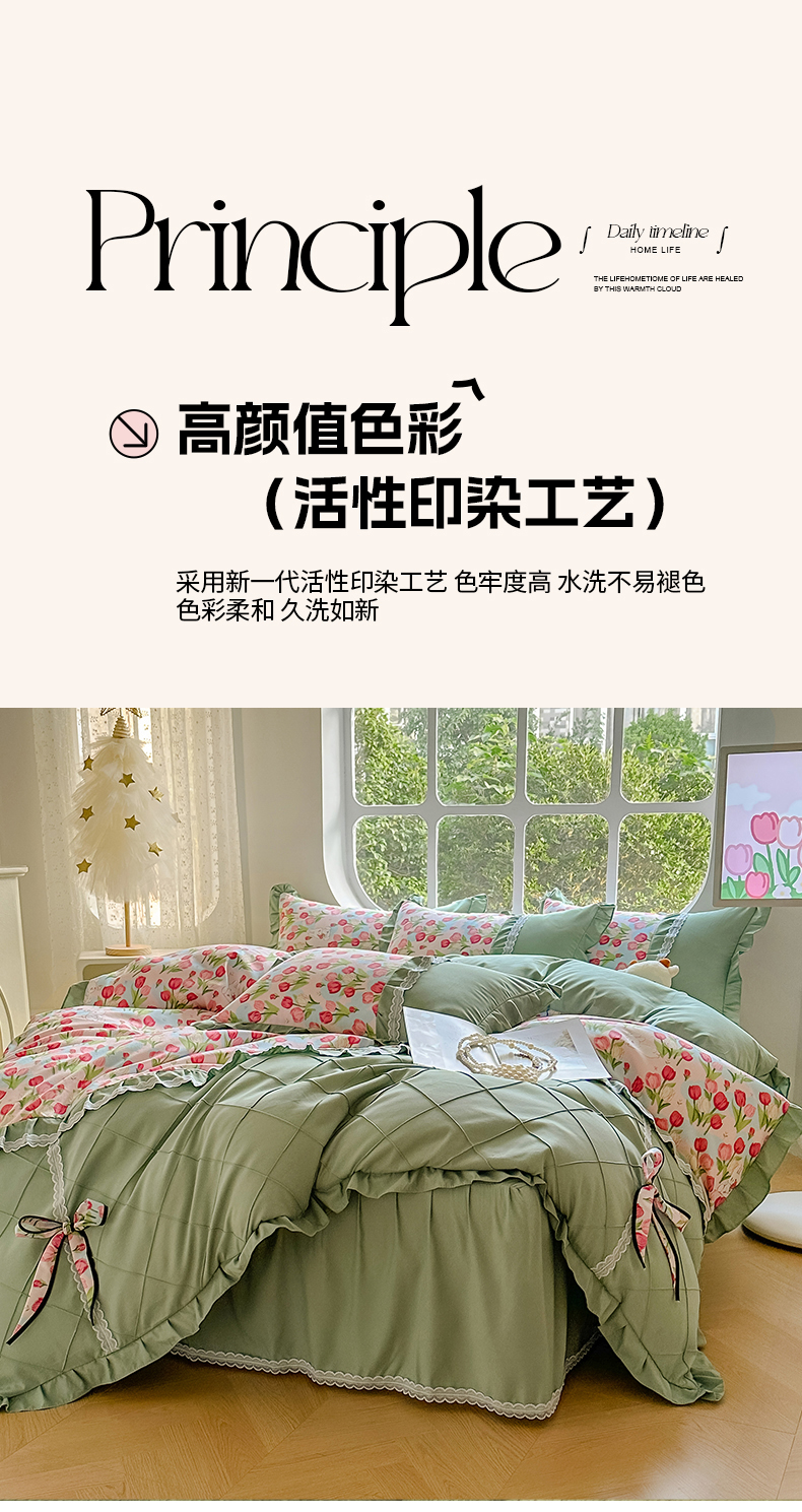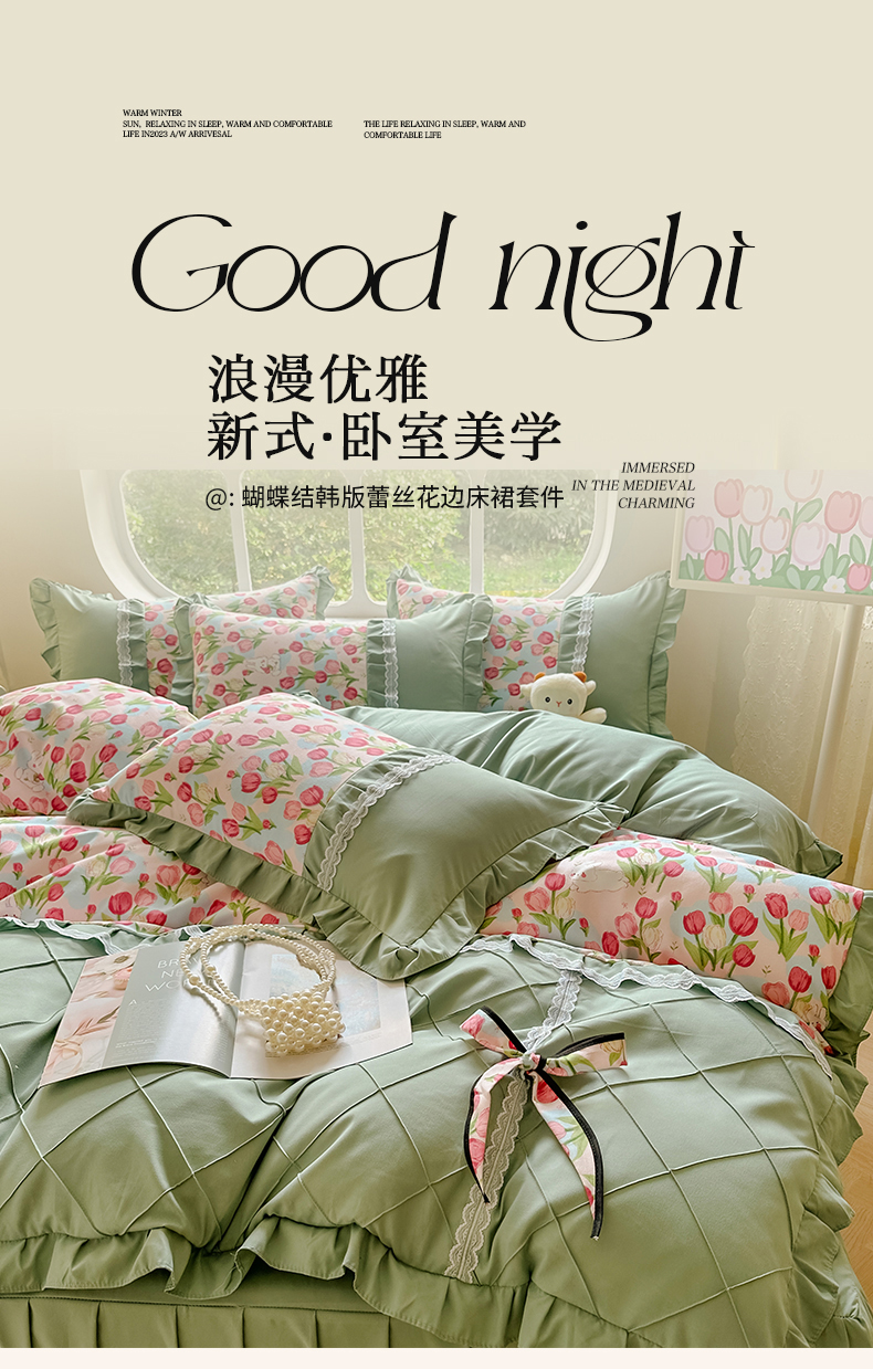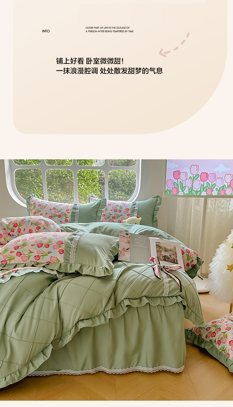金米诺 新款韩版花边水洗棉泡泡纱四件套公主条四件套 褶皱-浅绿,褶皱-浅绿