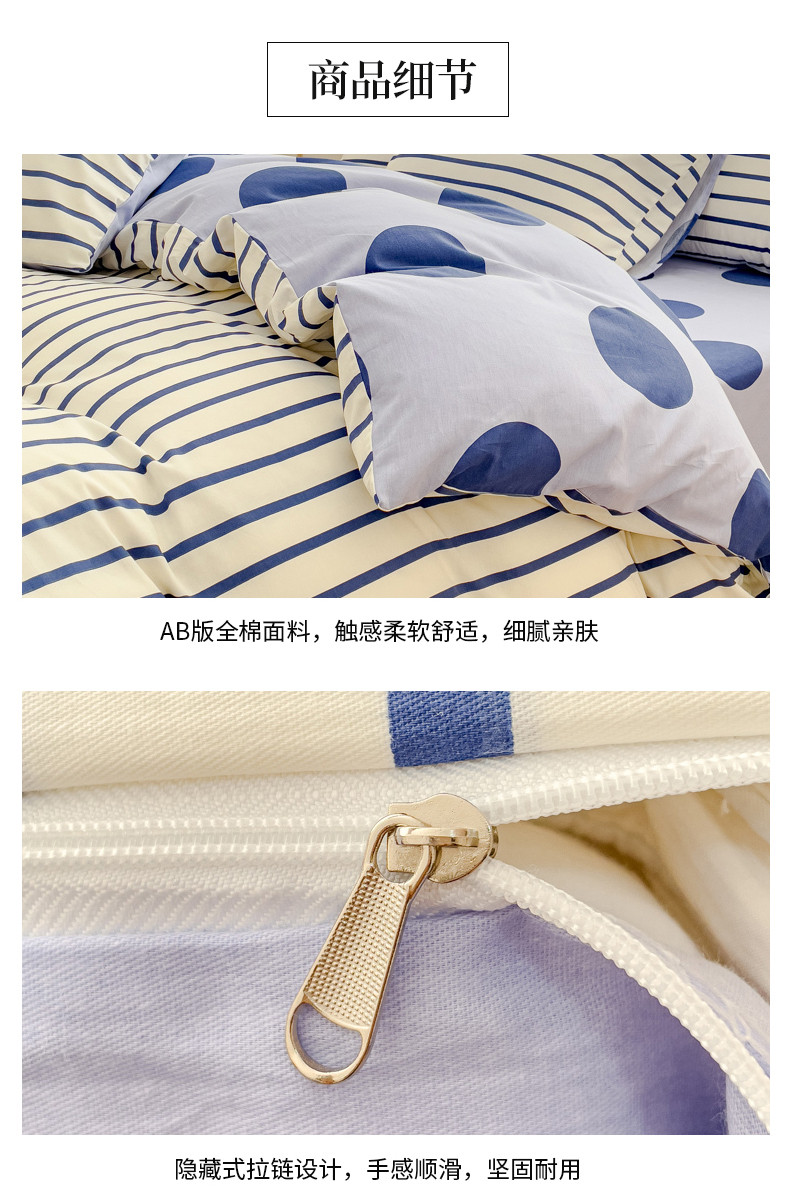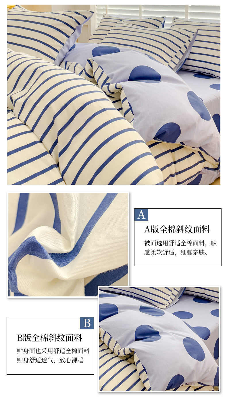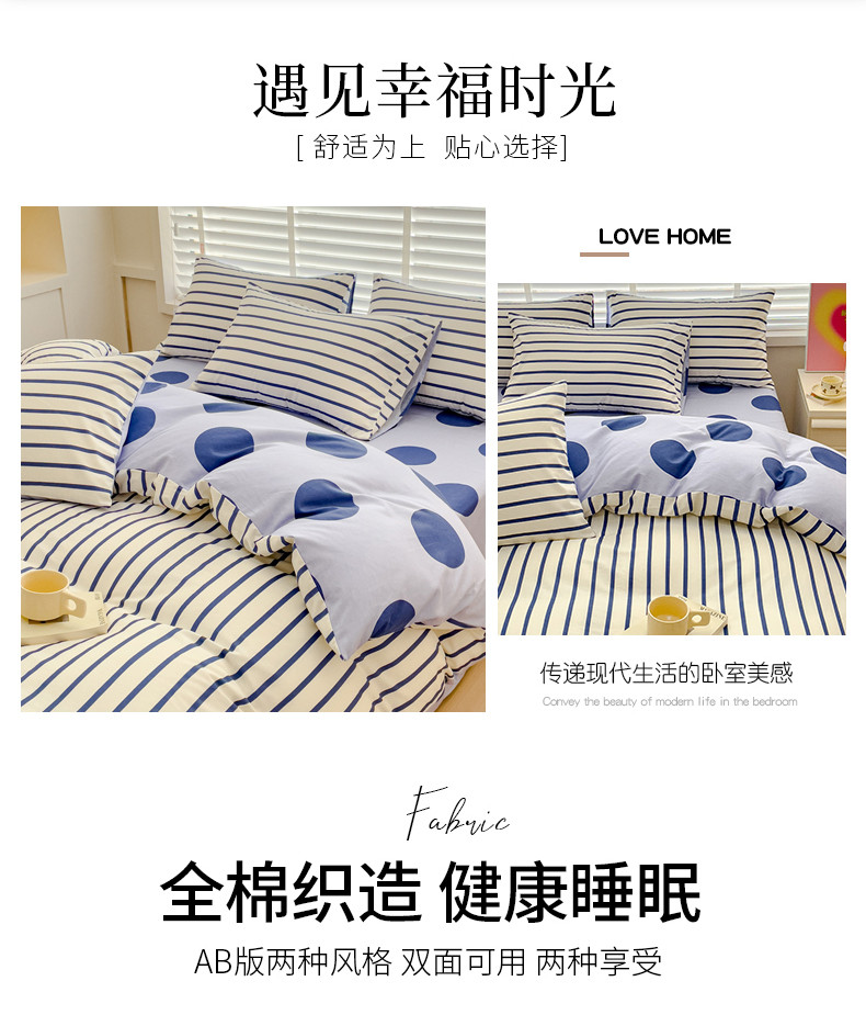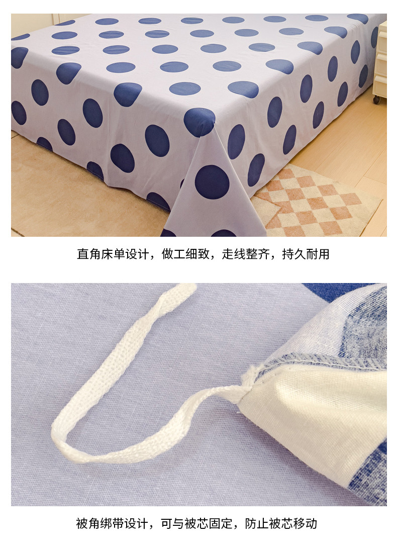 当前位置: 91家纺网 > 商品网购 > 床品套件 > 四件套 > 全棉普通四件套 > 金丝鸟 2023新款全棉可爱卡通印花小清新四件套-第一批 波点纹蓝