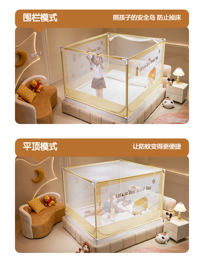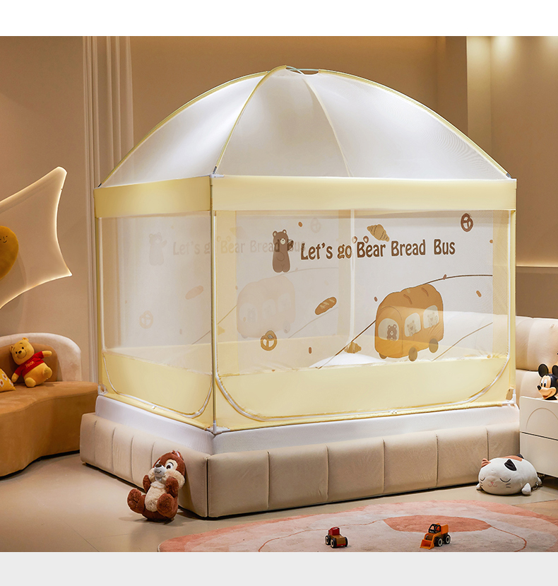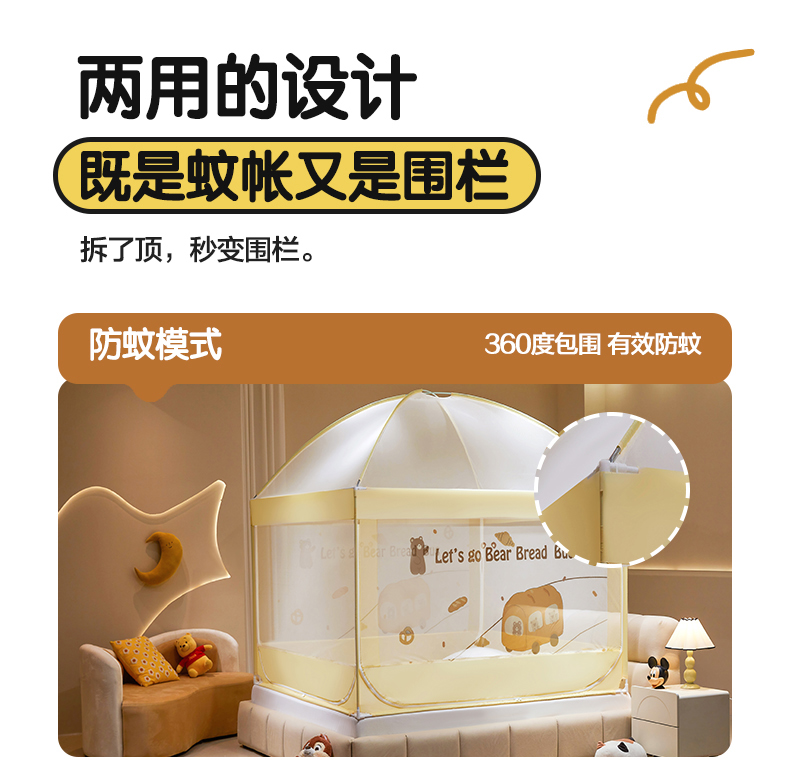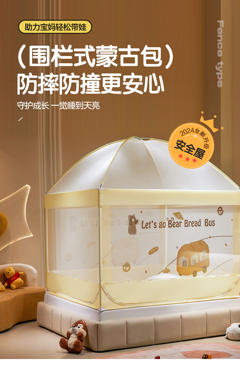 青竹苑 2024新款围栏款印花坐床蚊帐蒙古包防摔睡帐 围栏-熊熊巴士