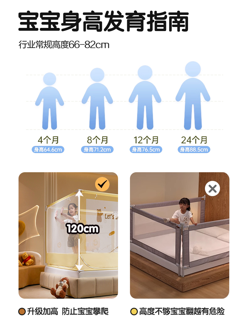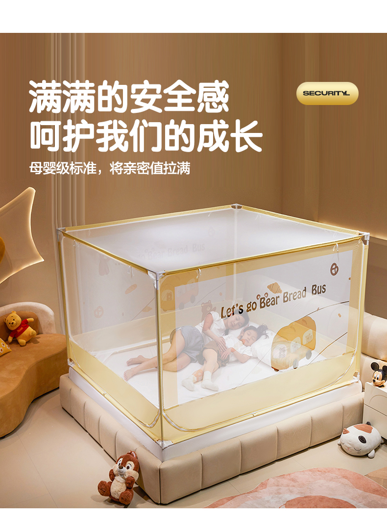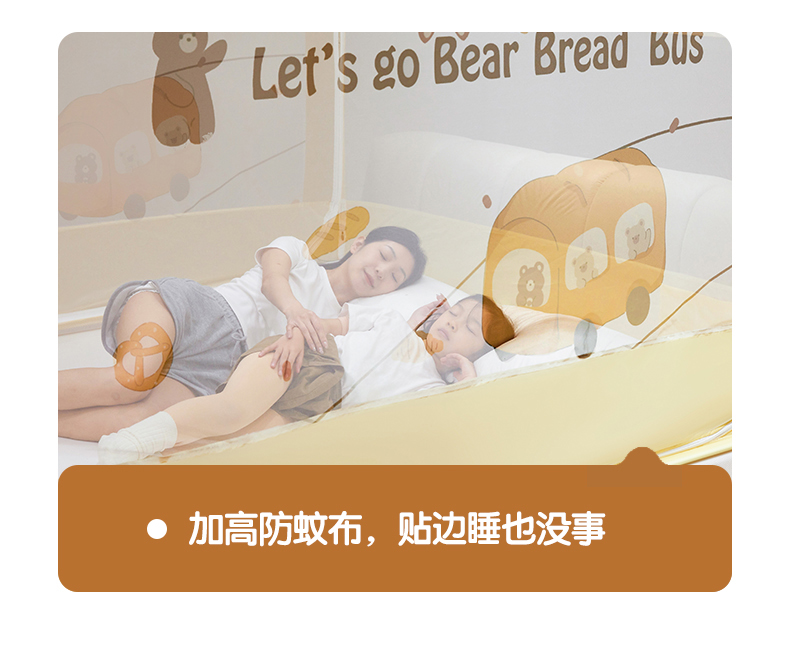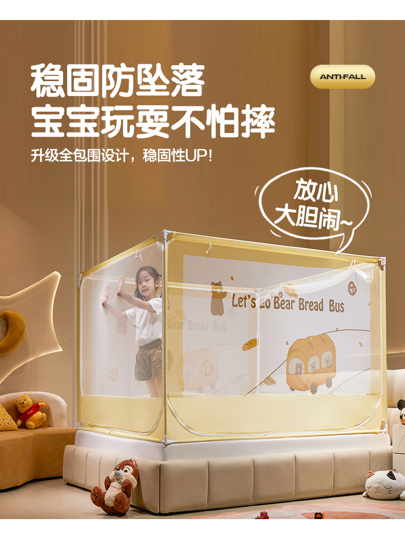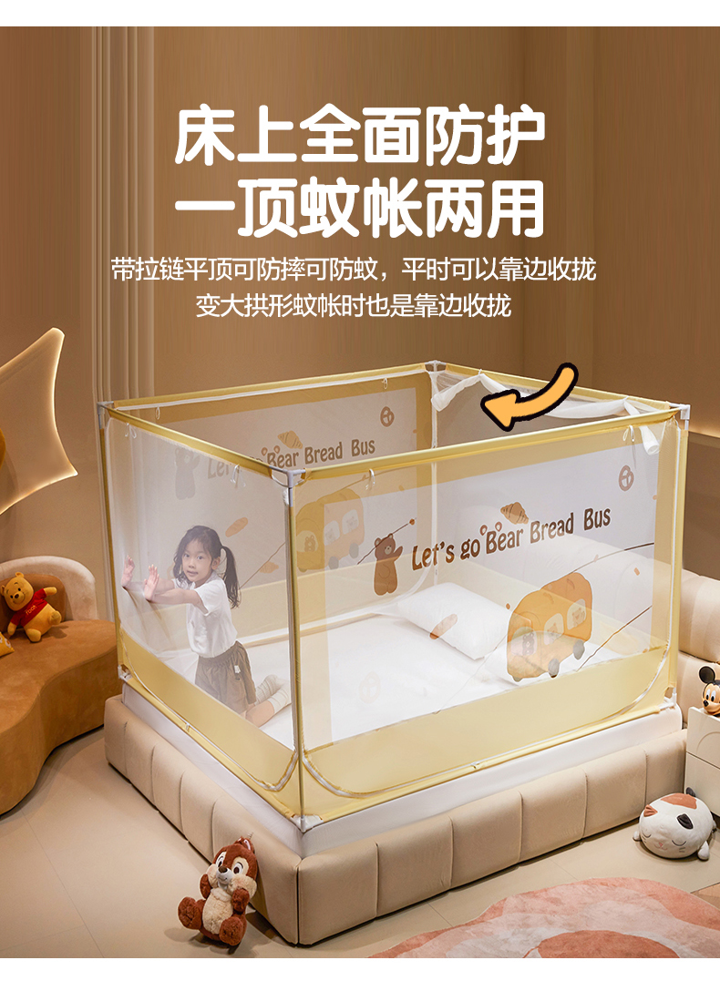 青竹苑 2024新款围栏款印花坐床蚊帐蒙古包防摔睡帐 围栏-熊熊巴士