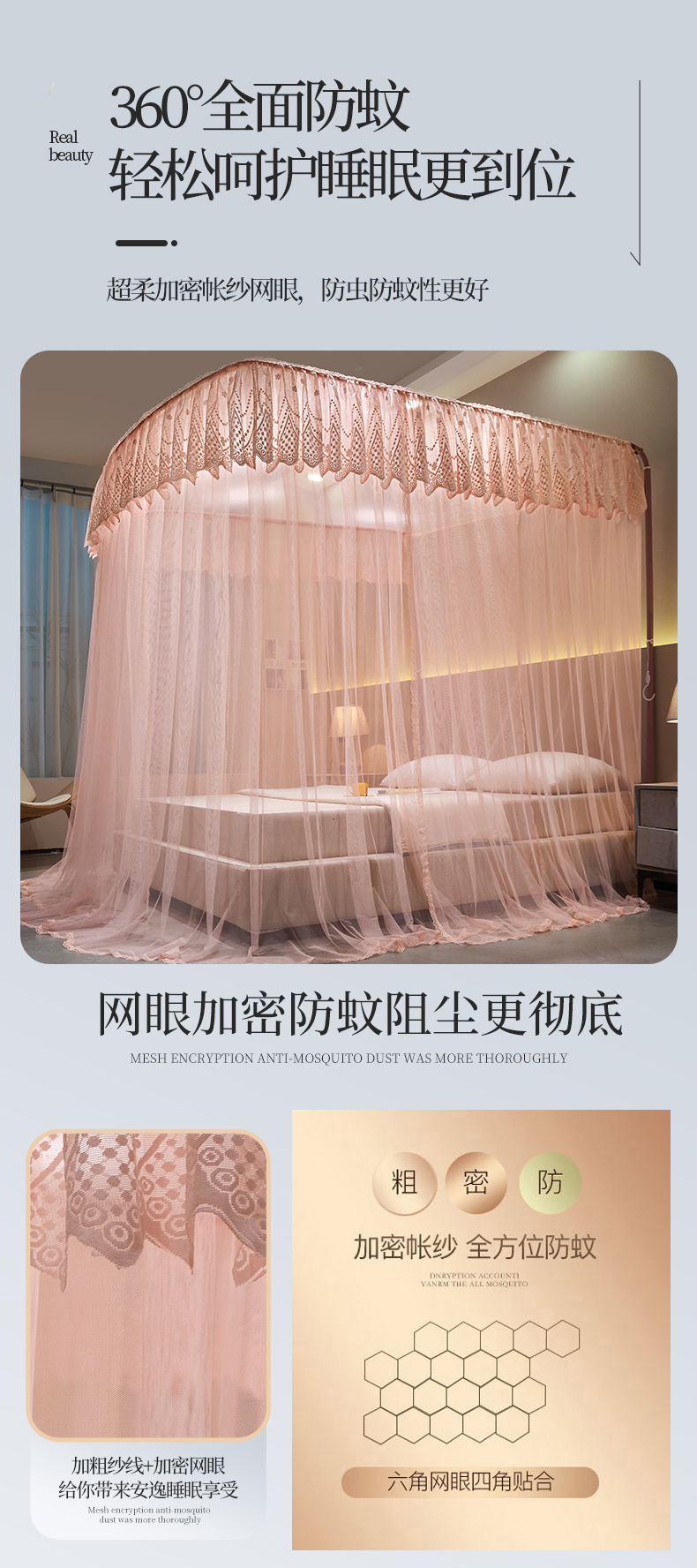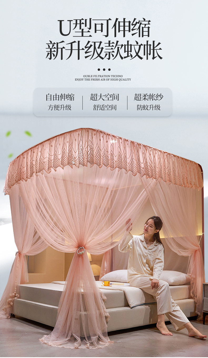 (总)夏彩 2025新款蕾丝U型防摔坐床蚊帐-88630,绿雅灰,藕玉色,香槟色